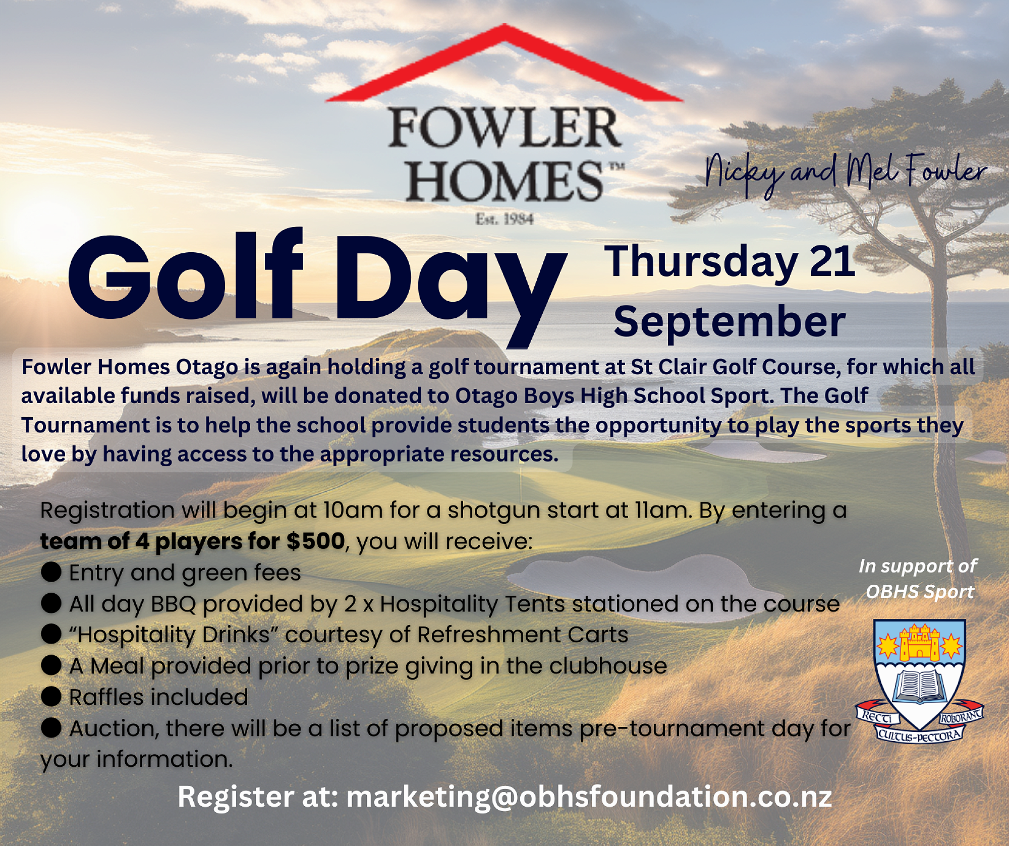 On Thursday 21st September we have the annual OBHS Sport Golf Day Fundraiser. All proceeds go towards Sport in Otago Boys' High School. We would love to have any teams or groups out in the community register and enter the Golf Day to help support sport at OBHS. Thank you again to Fowler Homes for your support of this event. We will also have a number of our School House hostel boys volunteering on the day with servicing food and activities for participants on the day.