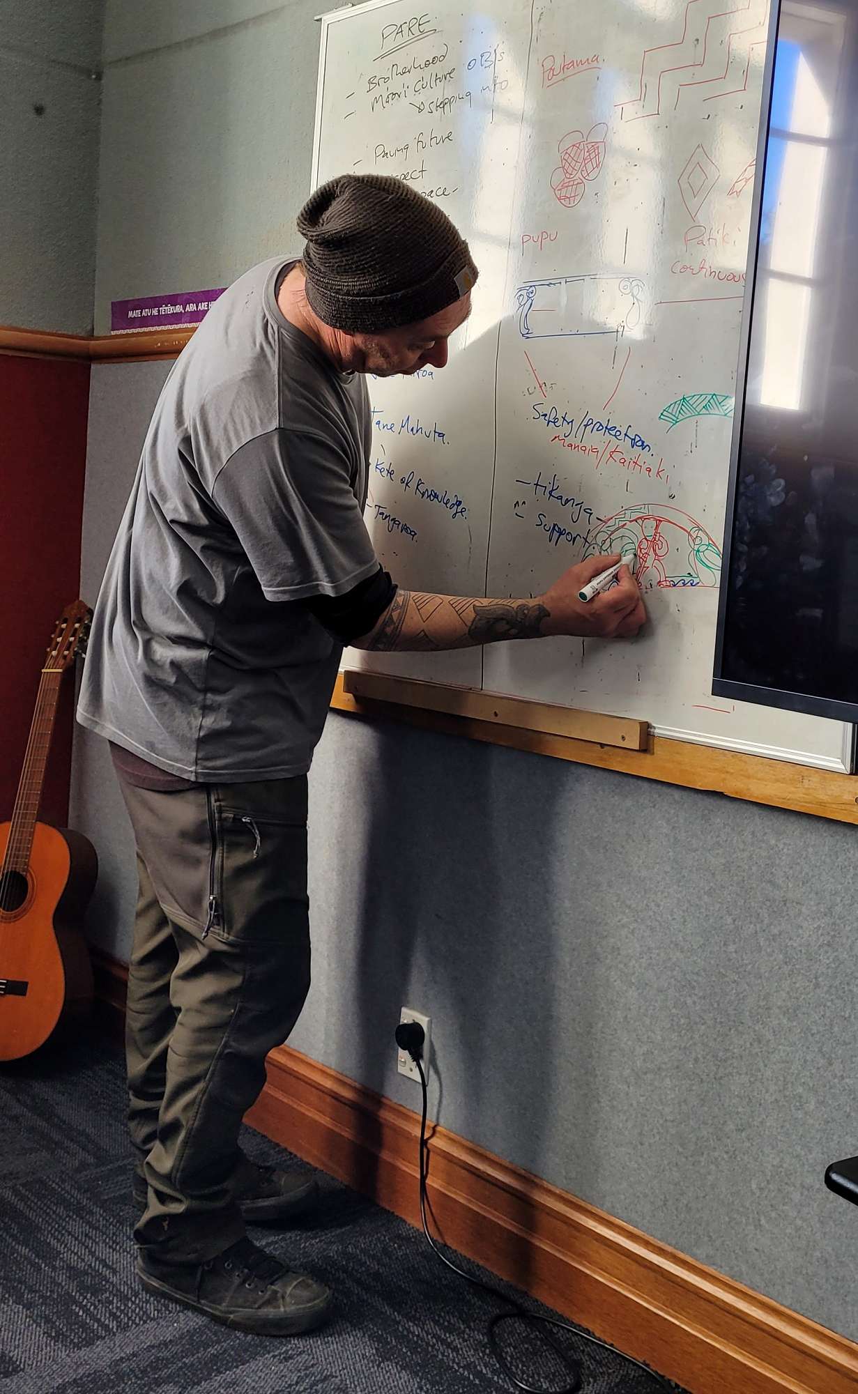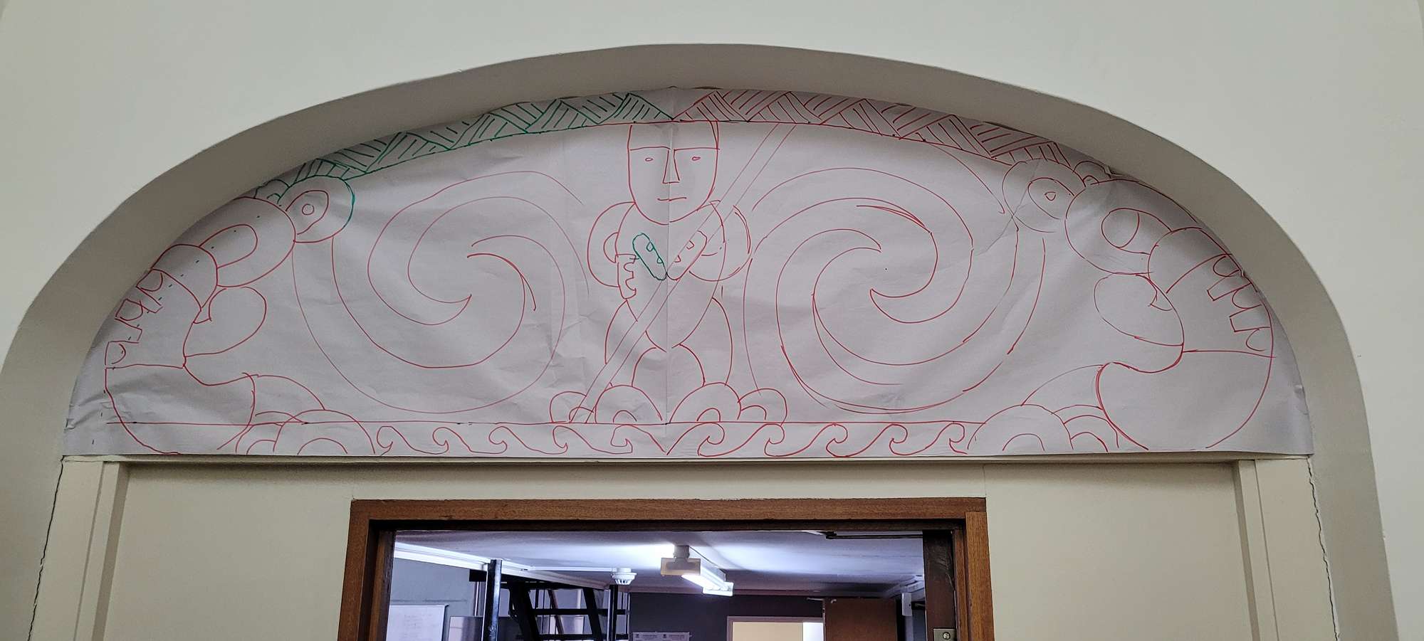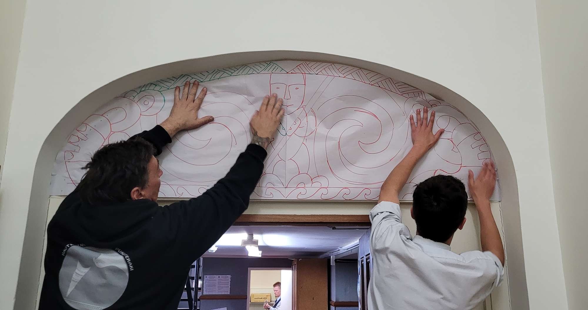 It began with a wananga last year to gather the vision and inspiration for this project with all the students in the class and adults involved. It has been a special project that connects to Otago Boys’ High School, the old boys who have gone on, future aspirations for all students and protection of each boys identity, culture and self. It now takes pride of place above the senior Māori class arch and doorway, known as Tū Māna.