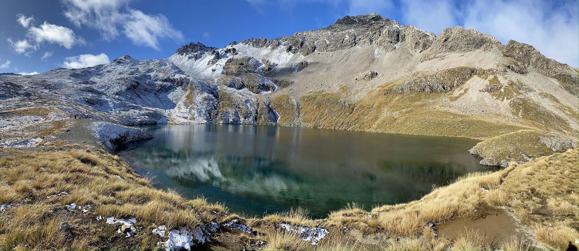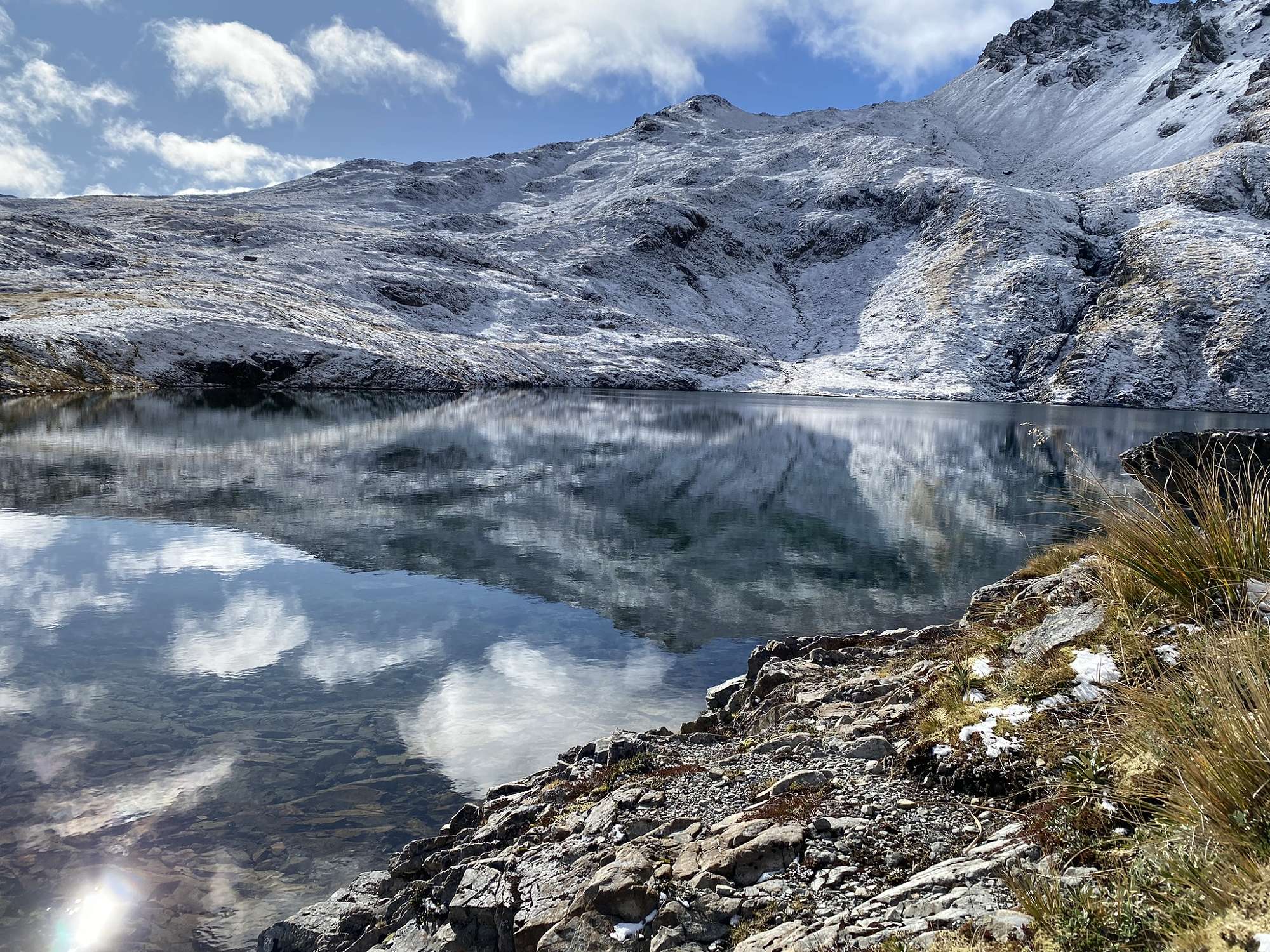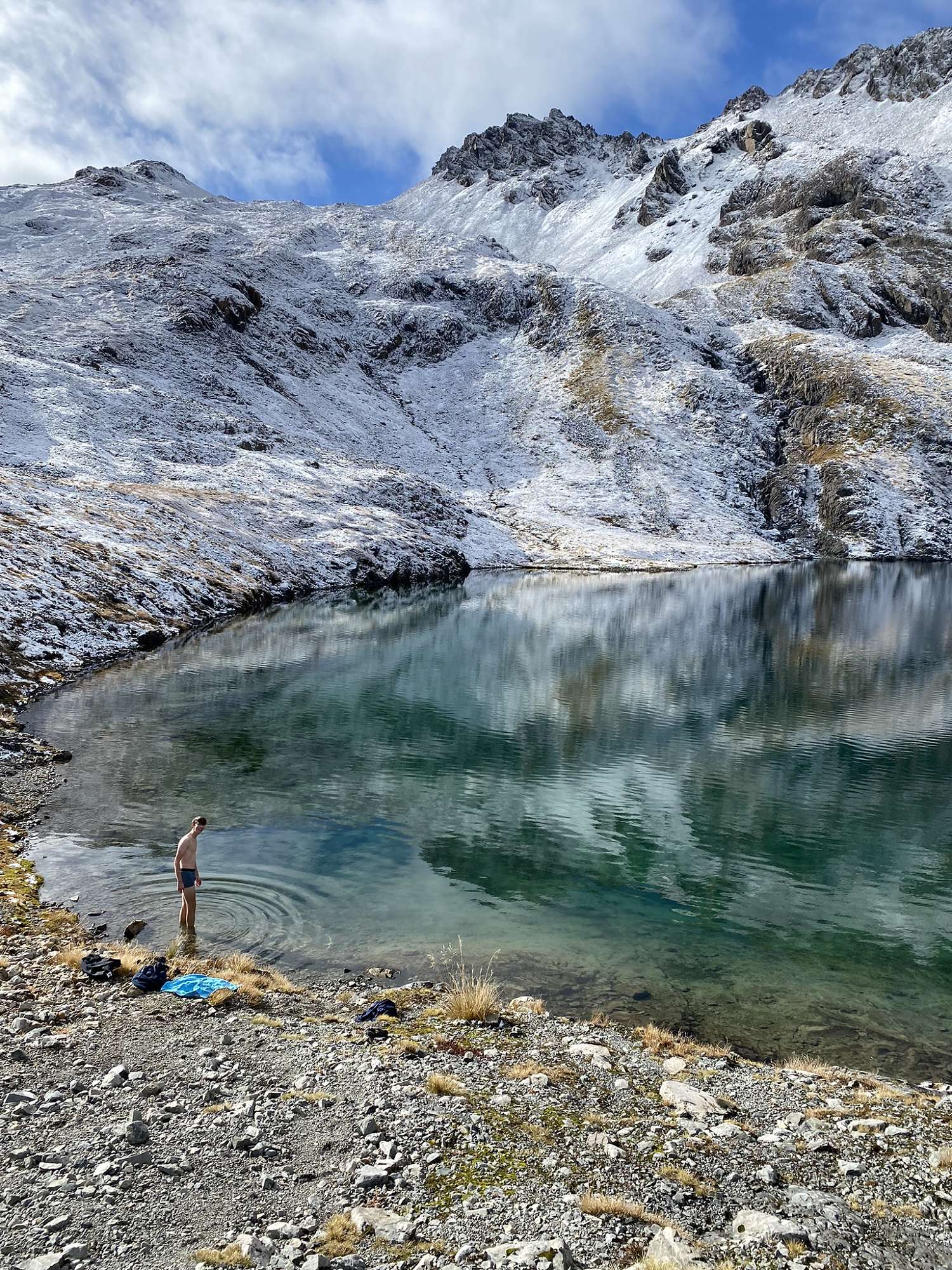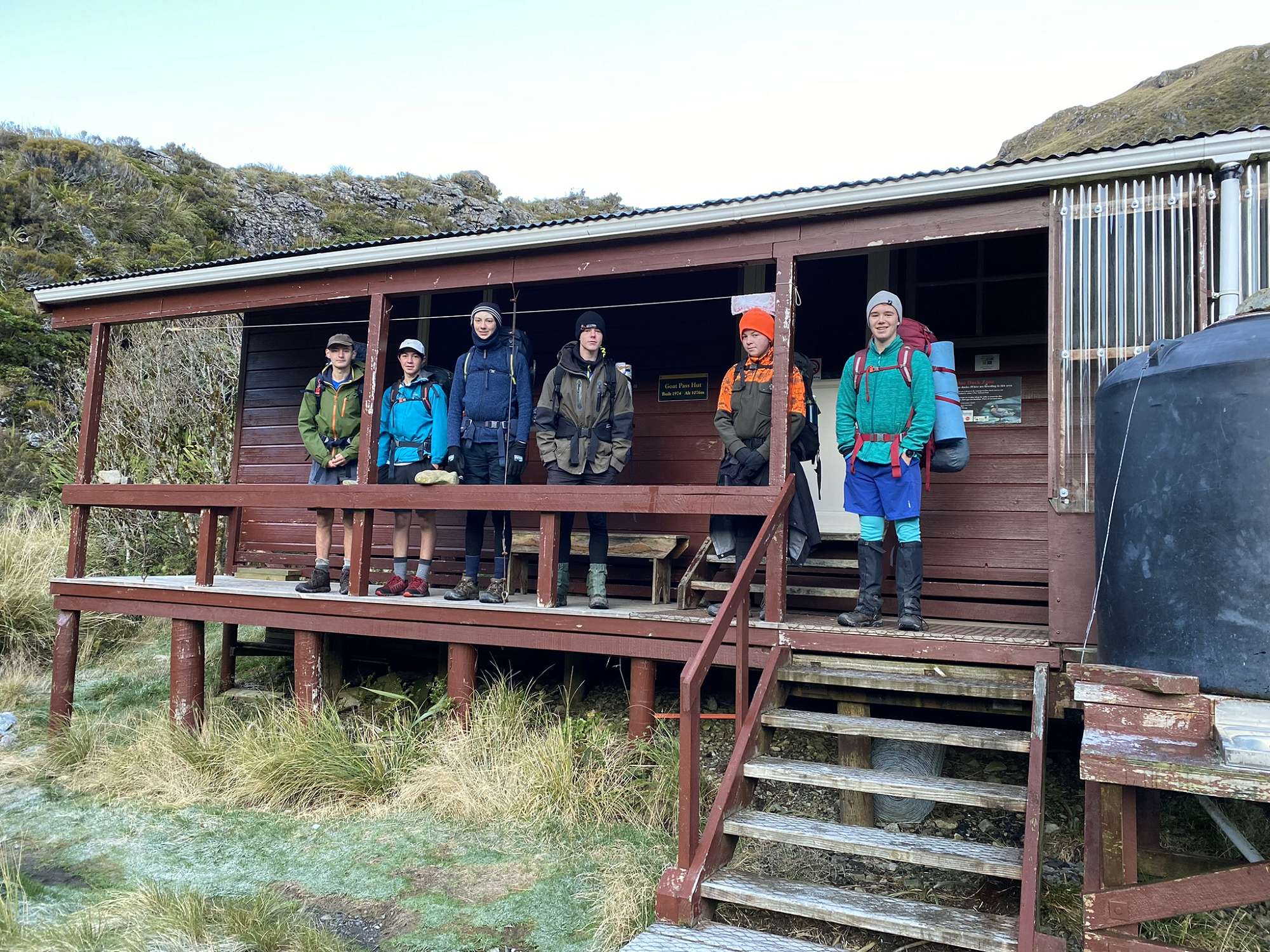 Monday morning dawned clear and frosty, so we had an extremely degenerate late start before setting out on our side trip up to the exquisite Lake Mavis positioned another 500 vertical metres above us. Picking our way up steep scree and tussock slopes we made it to the lake after about 90 minutes hard work. Nestled under the surrounding mountains, with snow down to the water’s edge on the sheltered sides, this pristine lake was definitely worth the effort required to reach it. We spent at least a couple of hours up there, enjoying the sun and views. Four hardy souls even chose to go for a bracing dip – mad! The return journey to Goat Pass was enjoyable for those who opted for the scree slope, a little longer and more painful for those who scrub-bashed. Goat Pass Hut was deep in the shadow of the hills by the time we reached it, and it was another chilly night at the hut.