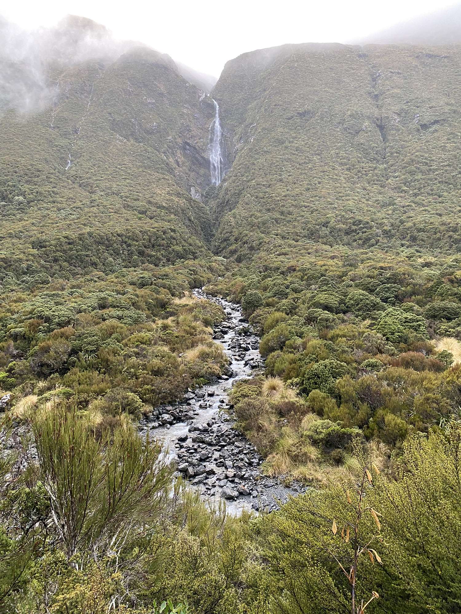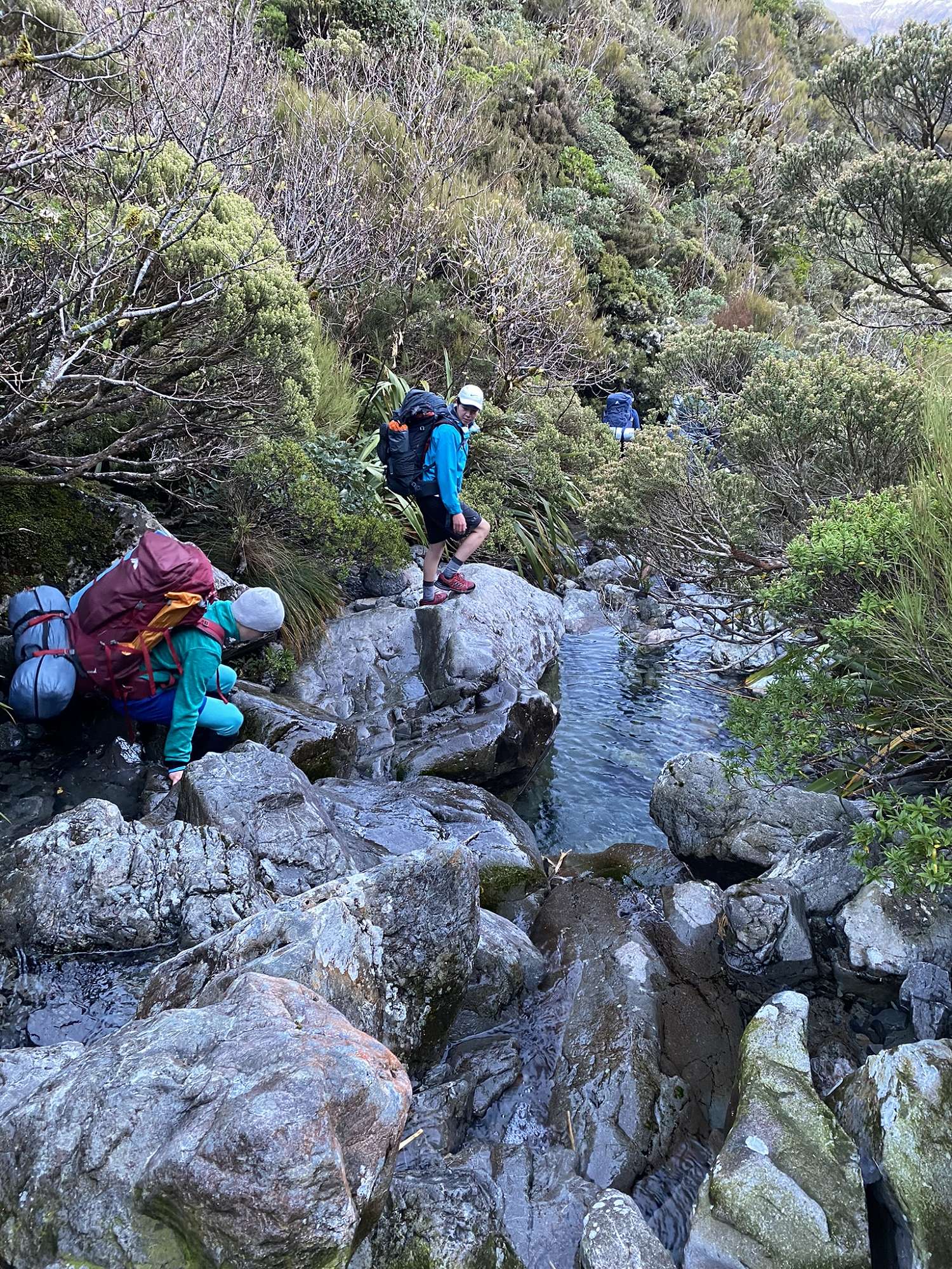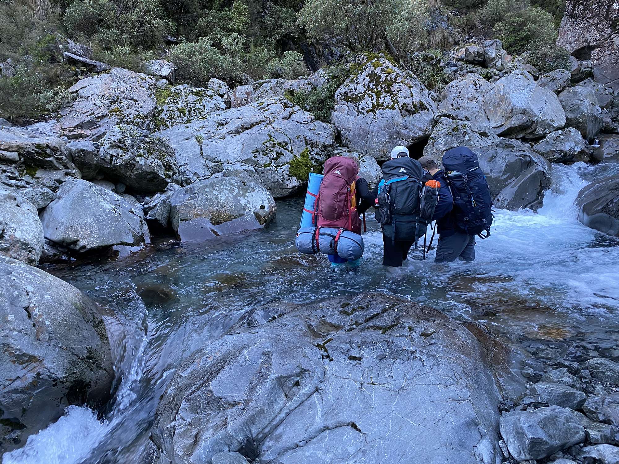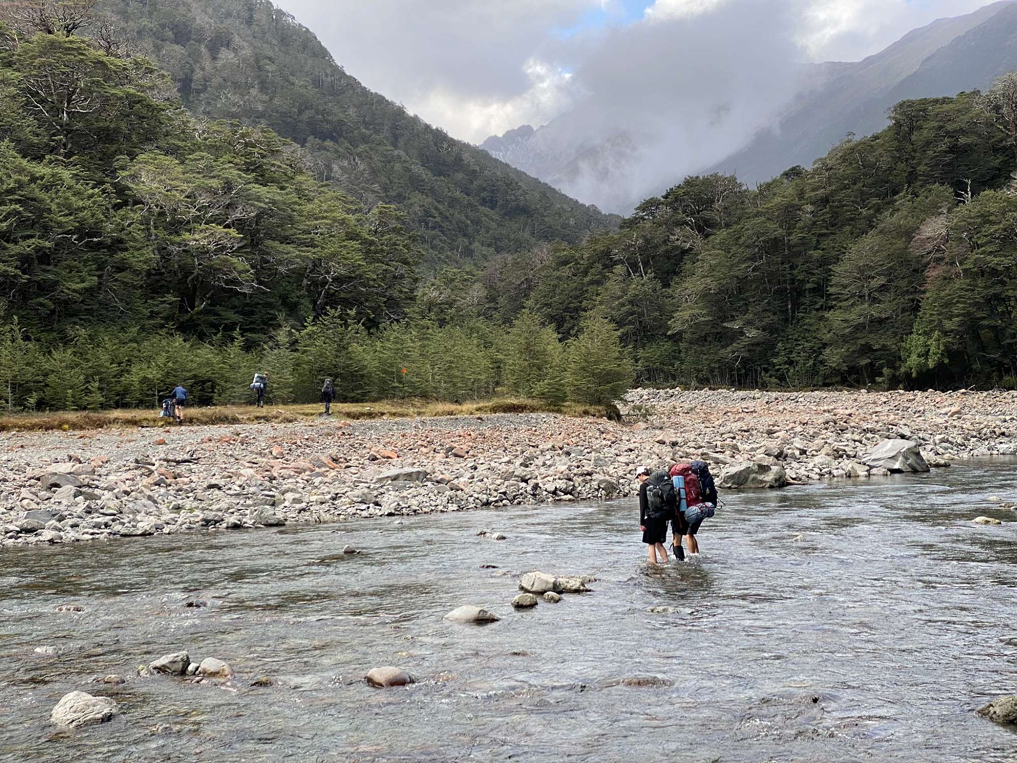 After 6 hours on the road, it was a relief to set out walking. Just 5 minutes in however, the first of many river crossings was required to get over the Bealey River, then multiple crossings of the Mingha River as we made our way up the valley to Goat Pass. The weather deteriorated to a light drizzle as the afternoon progressed and we just made it to Goat Pass Hut without needing to bring out the headtorches. With no log burner in the hut (not much to burn at over 1000m above sea level), it was a cold night as a light dusting of fresh snow accumulated on the hills around us.