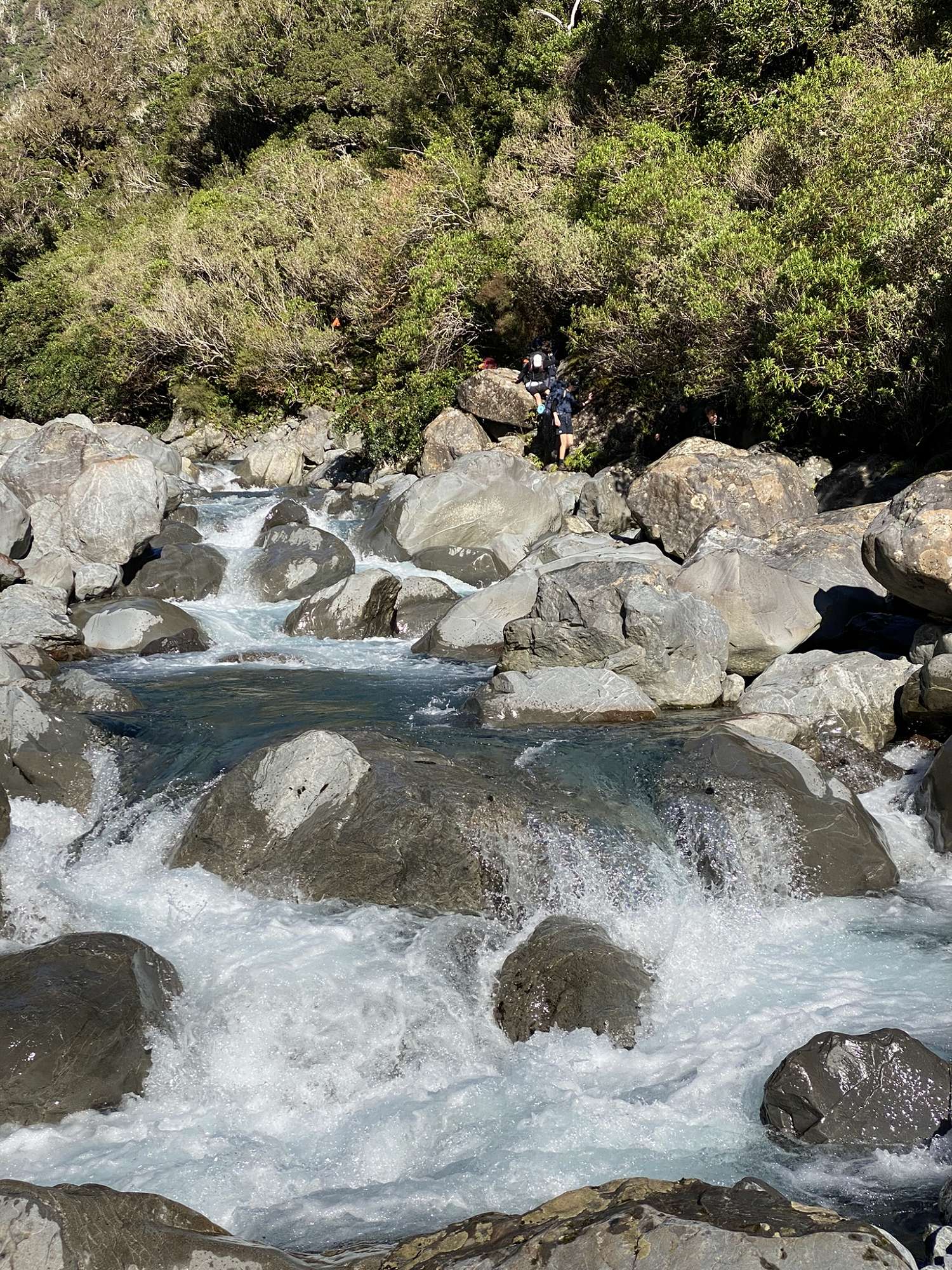 Despite an even crisper frost on Tuesday morning we were up early as we knew it would be a long day down the Deception Valley. Departing at 8am, we’d only gone 20 metres before the apt expression “goat track” from which the pass apparently earned its name, became crystal clear. A steep, rocky stream bed with the occasional orange marker was what passed as a track in this area, made even more interesting by a liberal coating of ice over any rock that wasn’t covered by water or overhanging scrub. The sun finally made it into the narrow valley at 10:15am, by which time the boulders had got slightly smaller, the steepness of the descent slightly less, and the morale of the troops lifted as feeling started to return to numb fingers and toes. Along the route we were fortunate to have two separate sightings of the endangered blue duck (whio), along with rock wrens, and a flock (curiosity) of kea. After wading the Deception River too many times to count on our journey down-valley, it was almost 4pm by the time we crossed the Morrison footbridge over the Otira River to meet up with our arranged transport to relocate us back to our van. Accommodation for the final night was the campsite at Klondyke Corner. The convenience of a great cooking shelter at the campsite was unfortunately off-set by its proximity to SH73 with heavy vehicles regularly interrupting sleep during the night.