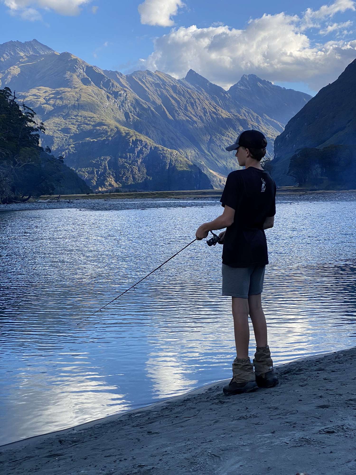 Some tired faces emerged from tents on Tuesday morning, so it was a more leisurely start. Perseverance paid off for Kade when he landed a nice rainbow trout, making a great addition to their group’s brunch. After some river-crossing training we explored a little more of the very scenic East Branch, before dismantling camp and returning to the Lodge.