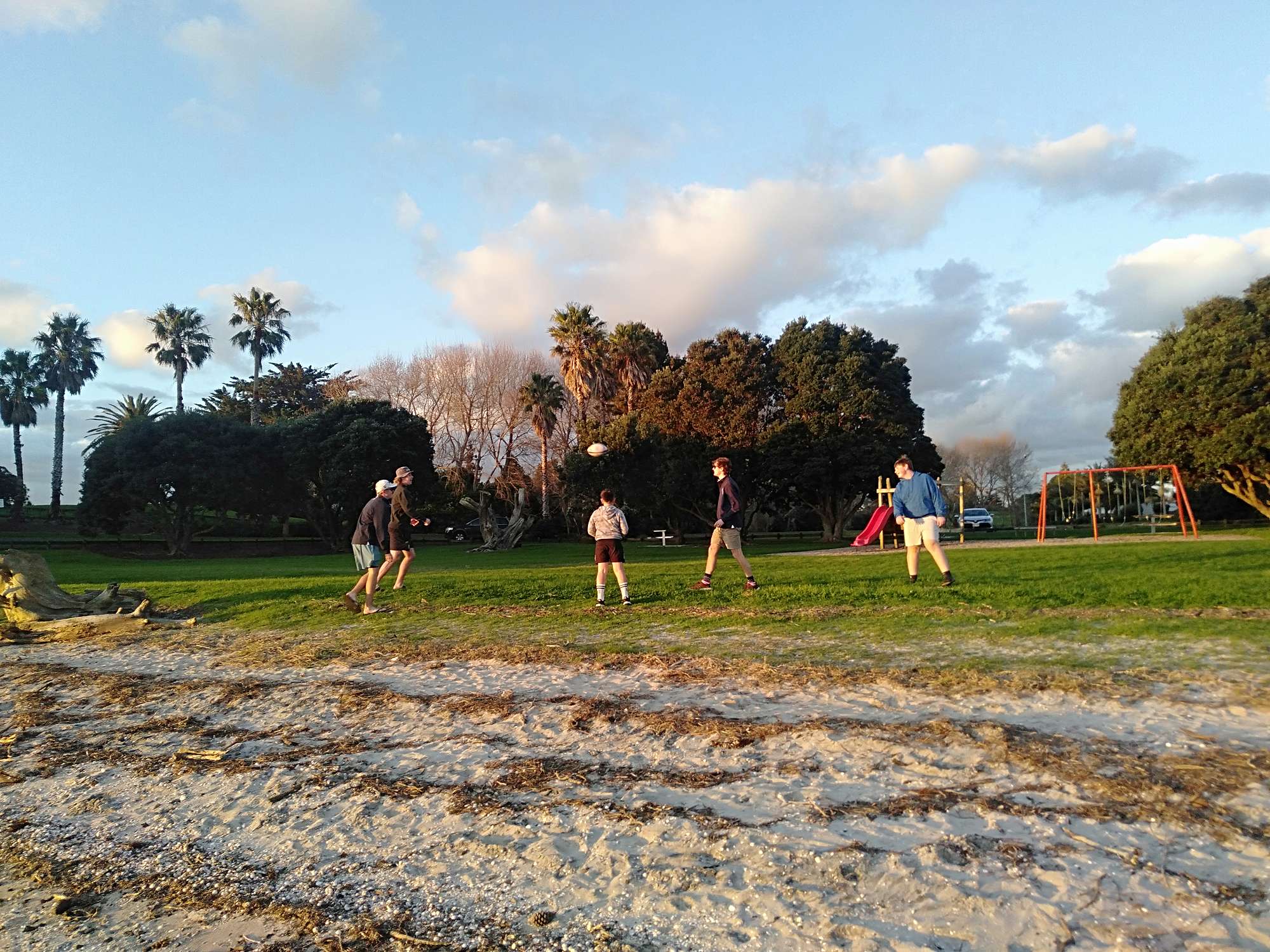 We flew to Auckland and then drove down to our accommodation at Clarks Beach. The weather was fine and we indulged in some slightly sandy and burnt sausages at the beach, watching the sun set over the Manukau Harbour.