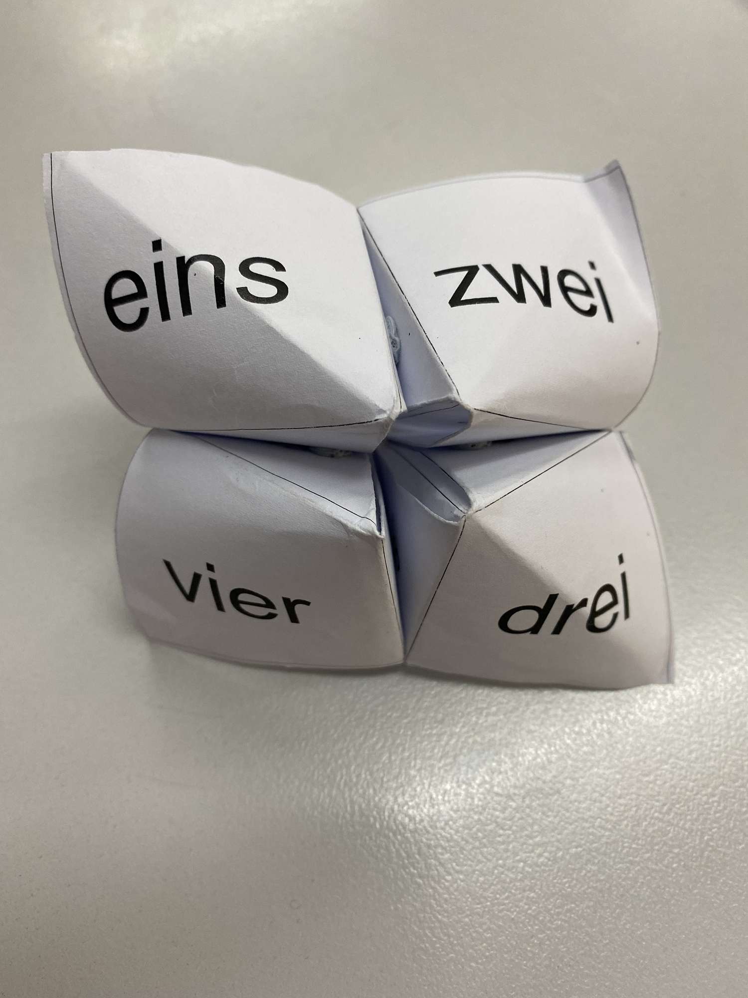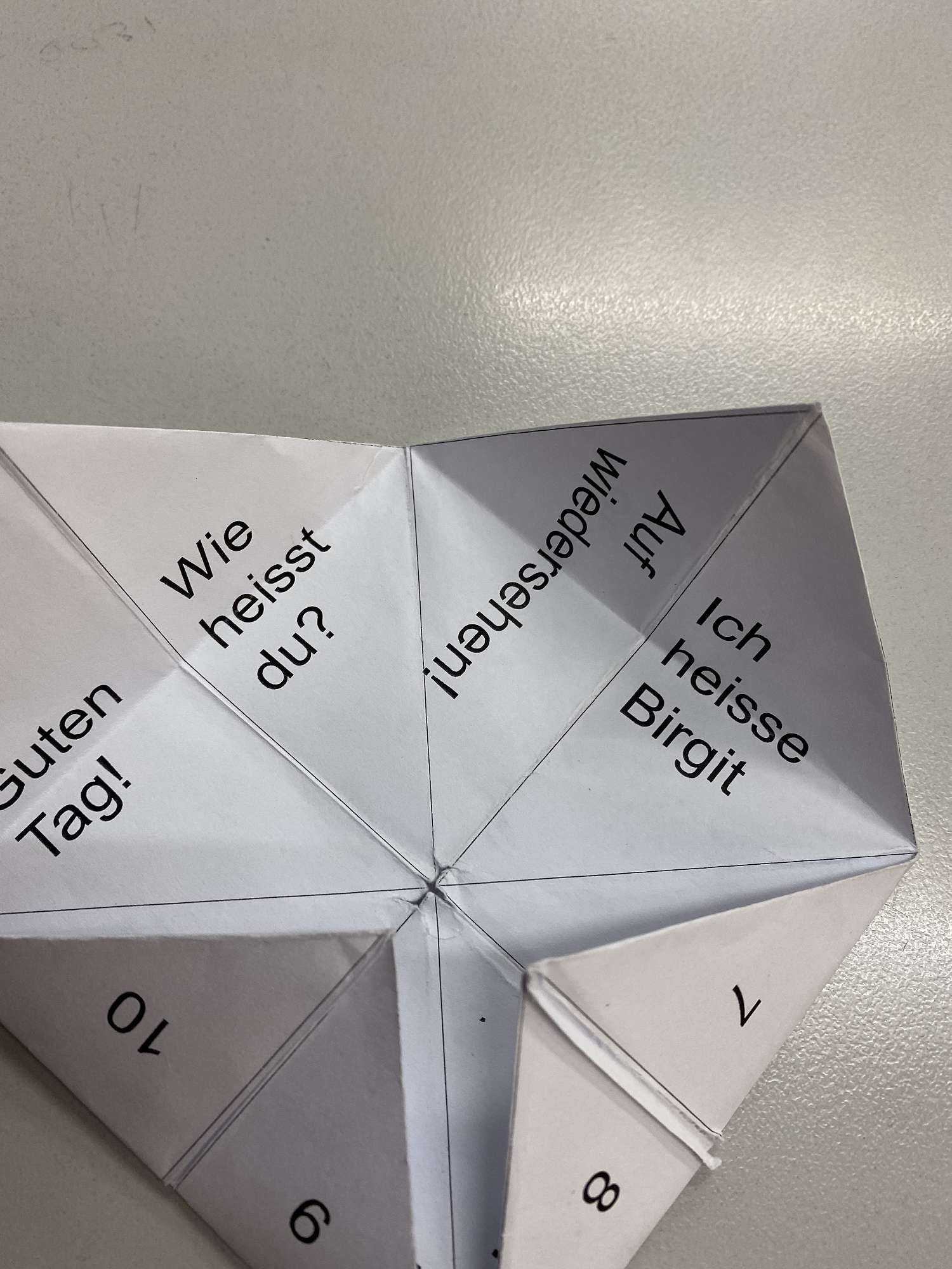 So, on Monday, in class we used an old school game to encourage boys to use spoken German to practice some of our language skills. The game is a form of origami used in children's games. It goes by different names, depending on where you are in the world! Sometimes known as fortune teller it is also called chatterbox, salt cellar, whirlybird or in Japanese, paku-paku, which means to flap your mouth.