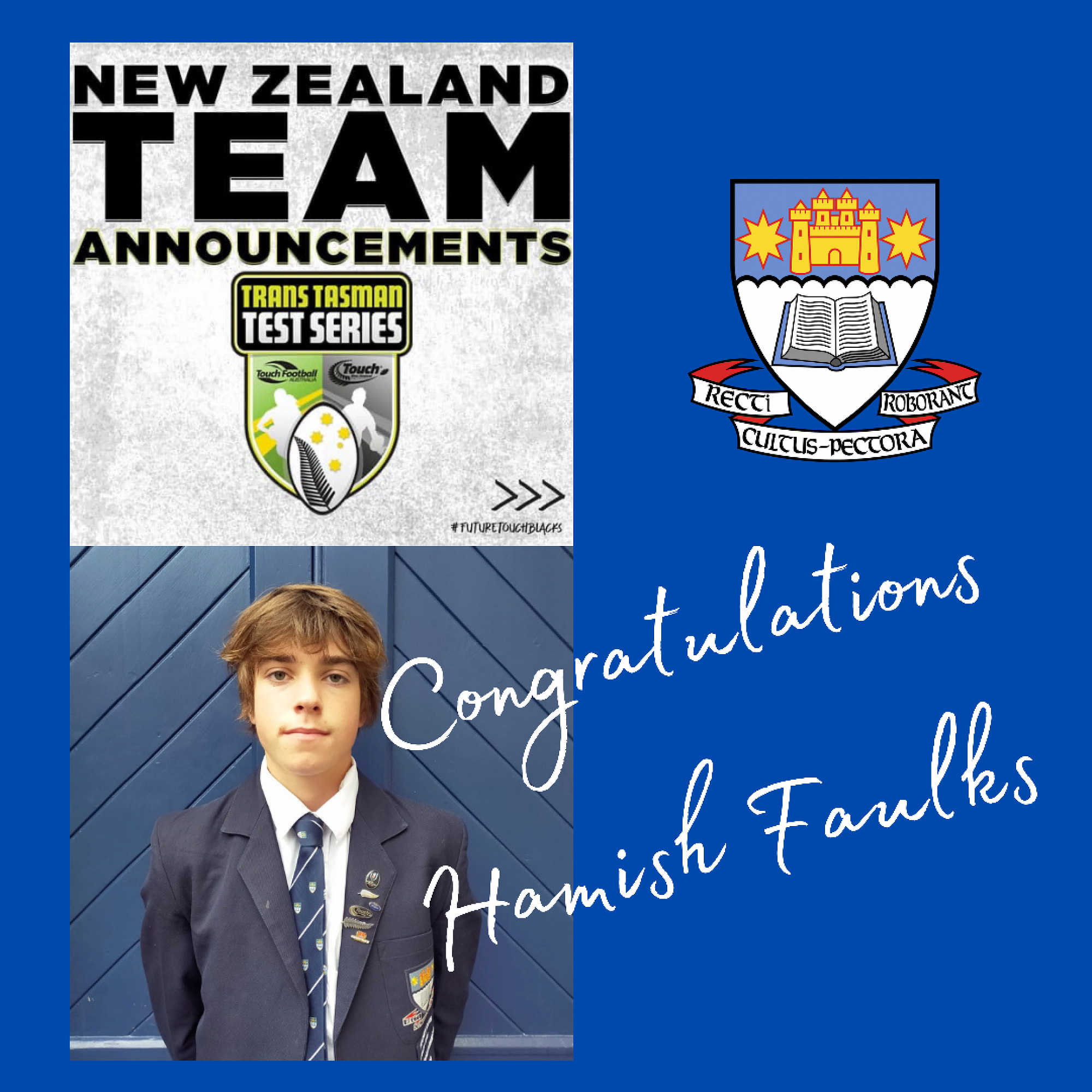 Congratulations to Year 12 Hamish Faulks who has been selected in the New Zealand U18 Boys Touch Team. A great example of resilience and perseverance to work through injuries and still achieve his goal. Well done Hamish. We also send congratulations to Hamish’s brother Angus Faulks in also making the New Zealand U20 Mixed Team. Great moment for the Faulks whanau.