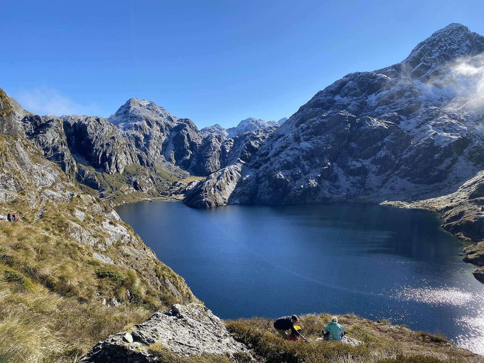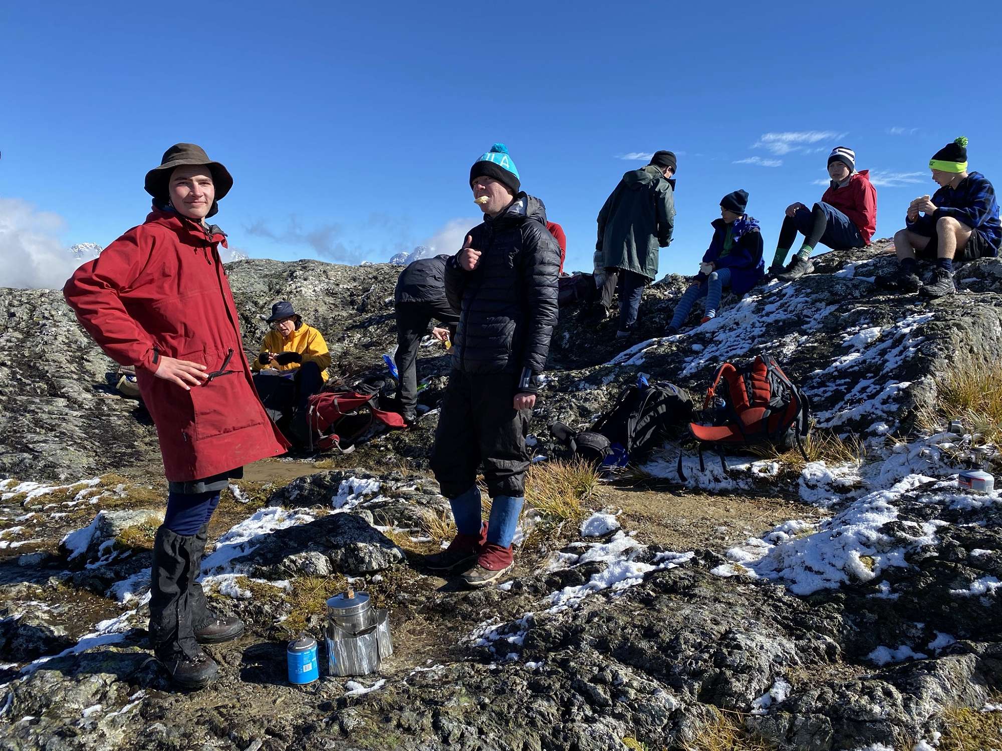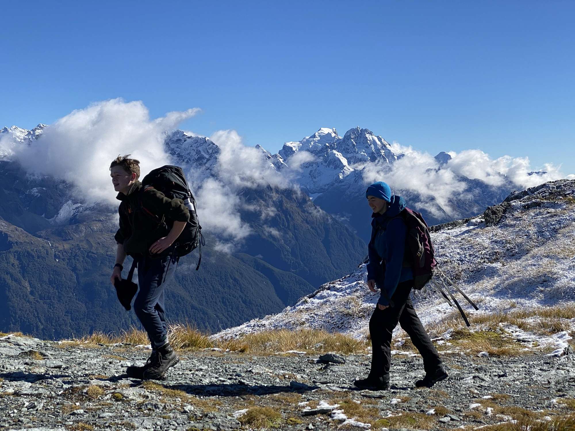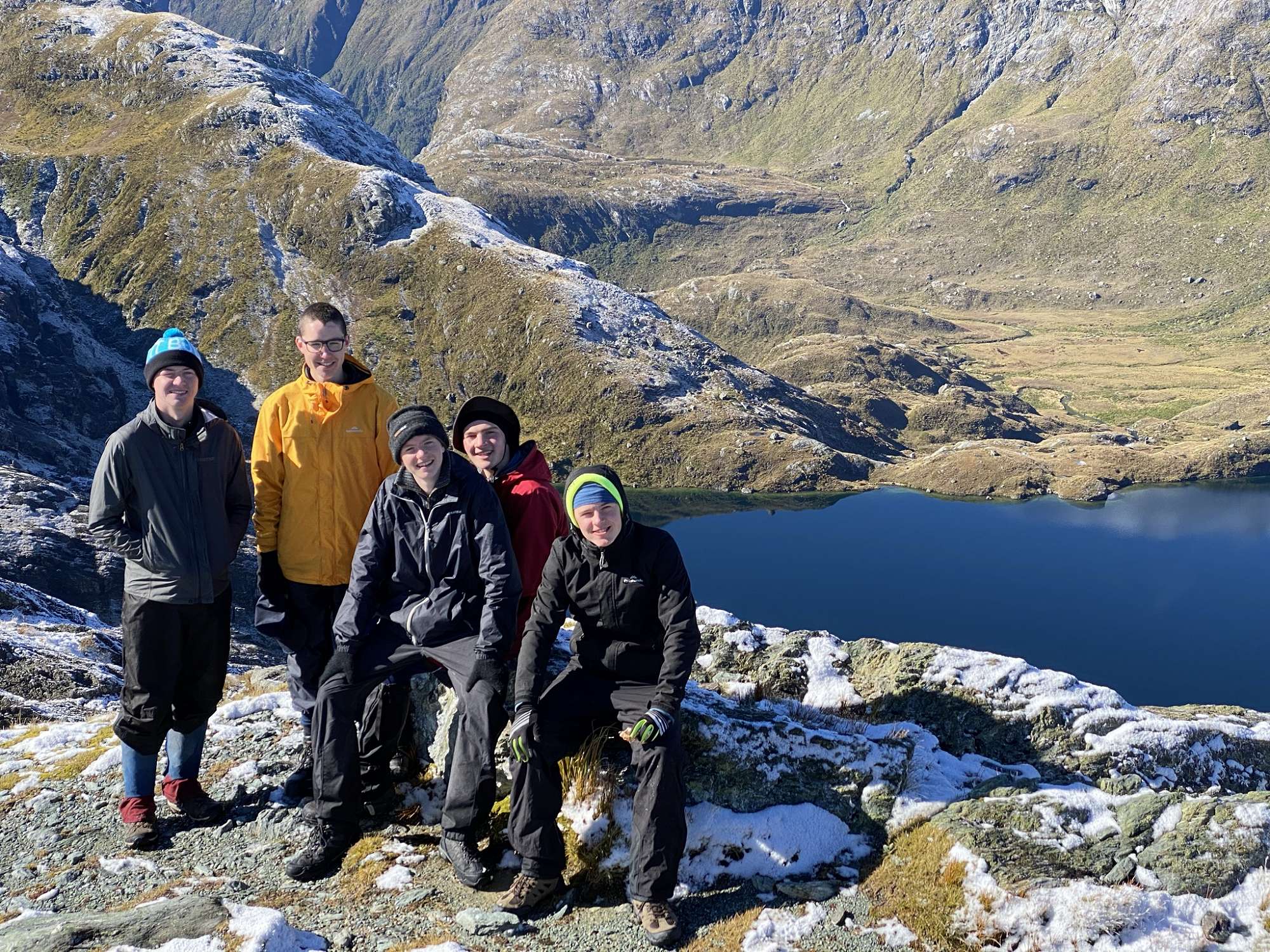 Day Three saw us walk up the Routeburn track to Harris Saddle in perfect conditions. From there we climbed the ice covered Conical Hill, narrowly avoiding injury on the frozen rock faces and permafrost, and were rewarded with indescribably amazing views. There we had lunch and hot drinks before returning to the saddle and Lake Harris, to begin our detour into the beguiling Valley of the Trolls. The scene was Lord of the Rings-esque, with Michael Crosson wisely quipping: “I feel like Gandalf.” We climbed the side of an impressive waterfall and, once more, the risk was rewarded with stunning views and refreshing spray. Gathering storm clouds hastened our return to the flats.