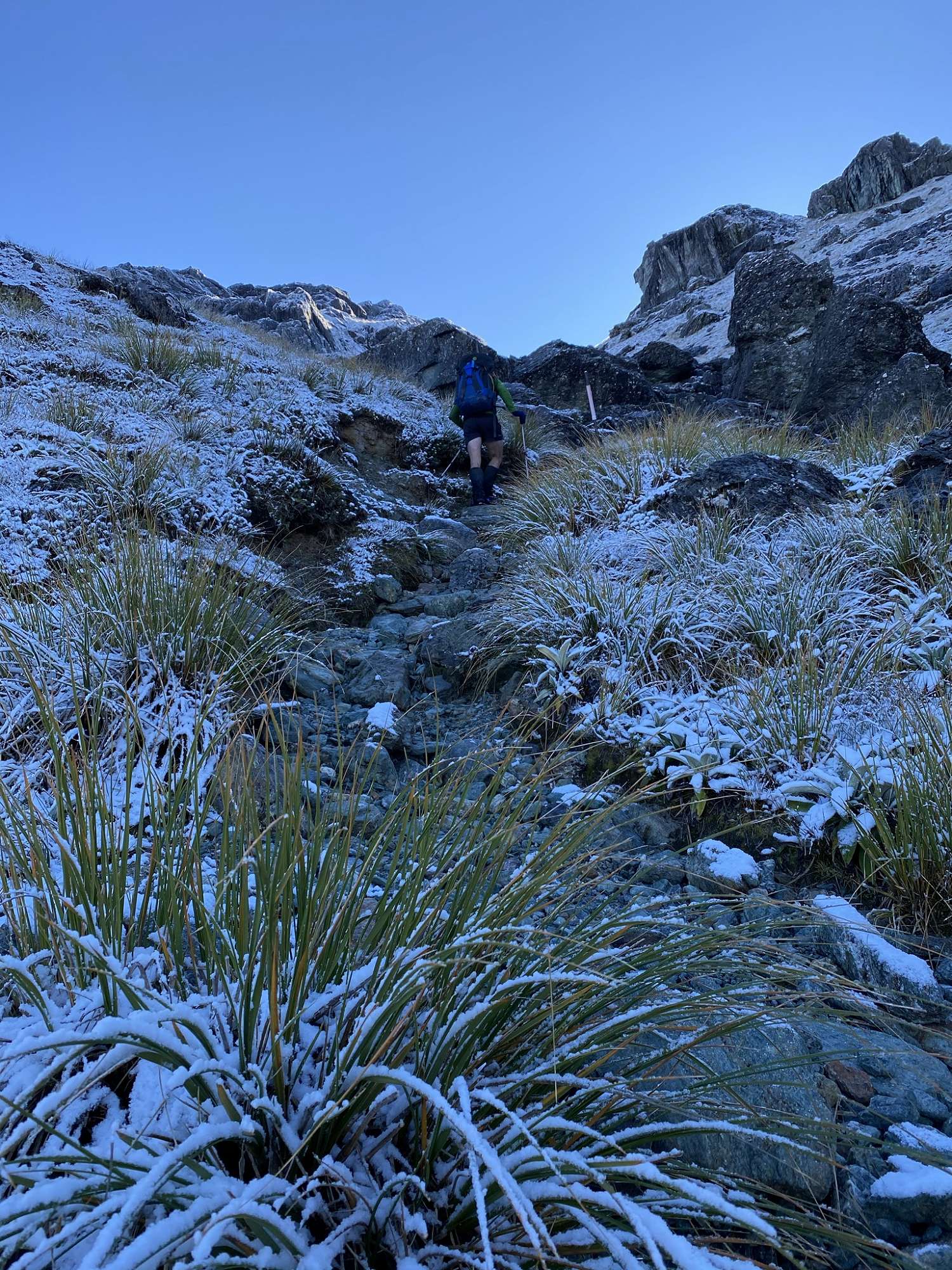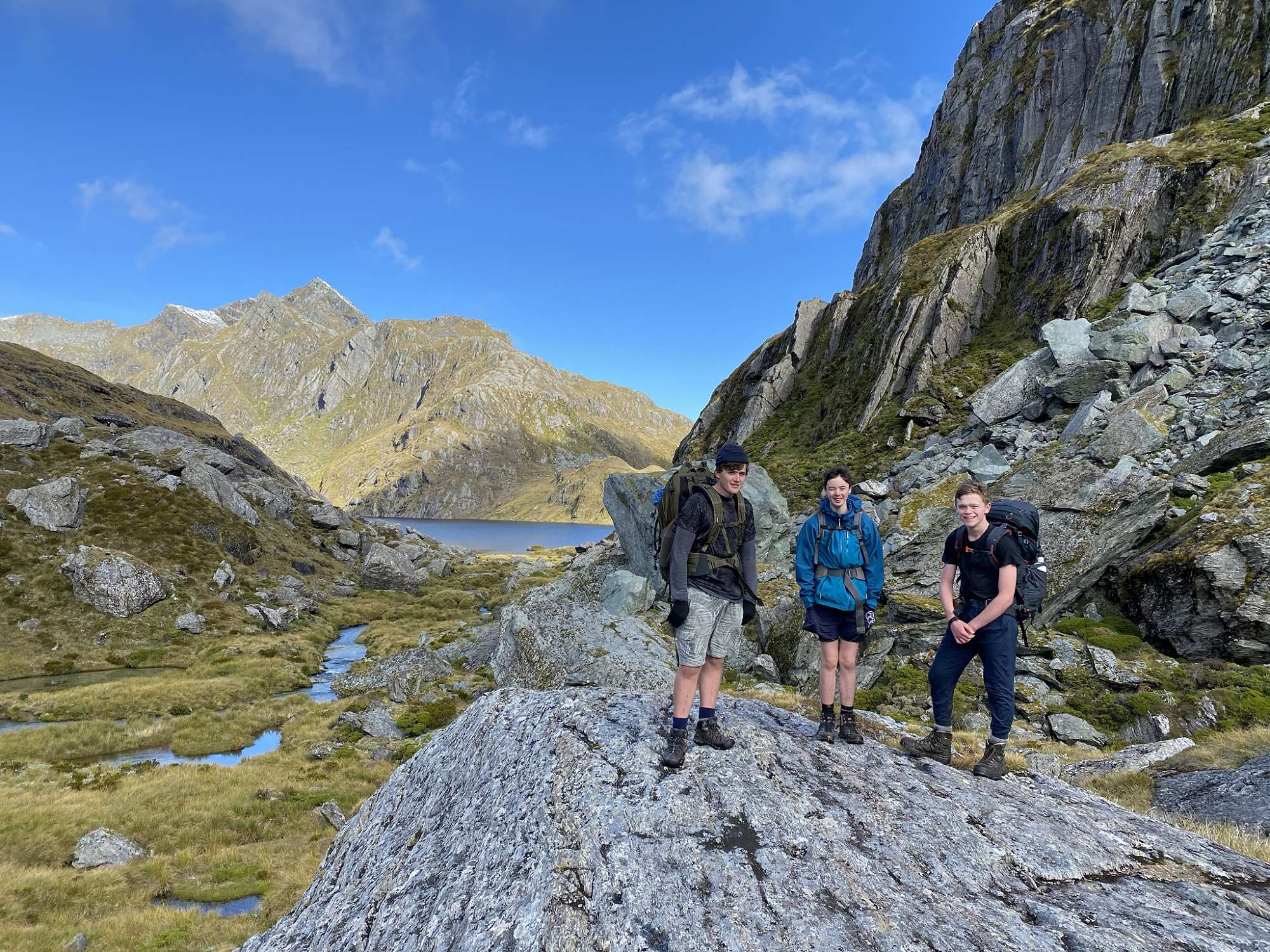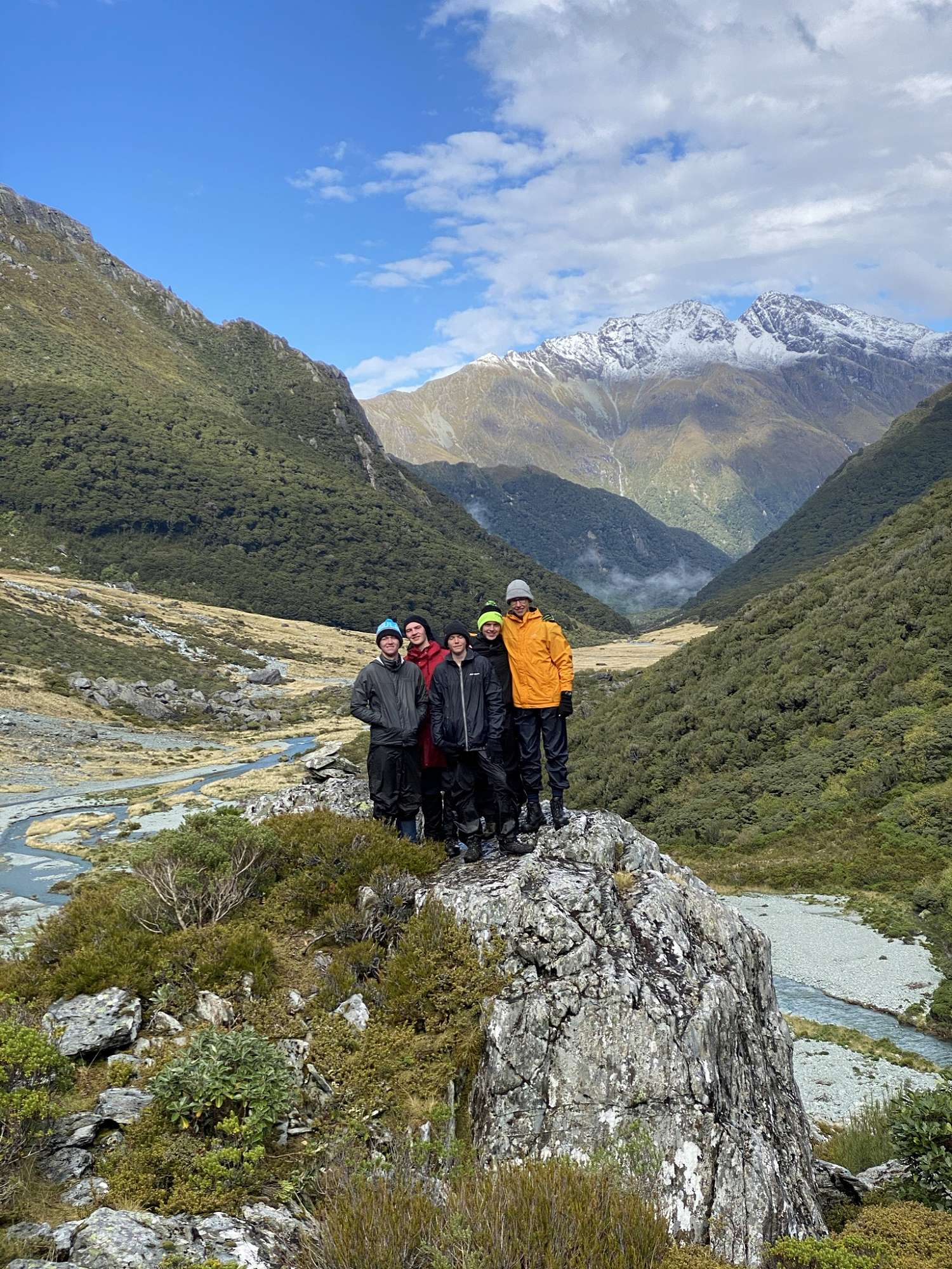 The next day was distinctly uninspiring. There was steady rain for most of the morning which refused to clear as we set off, following the North Branch of the Routeburn River. The track through the North Routeburn Valley was rough in many places, non-existent in others, but we persevered and made good use of our navigation skills (and trapping trails) to overcome swamps, boulder fields and the river. We made the decision to set up our emergency shelters for lunch after rain, more bitter wind and the disappearance of the trapping trail markers into a boulder field halted our progress. When we finally emerged, the weather had cleared beautifully and we explored up further before returning down the valley via an impressive waterfall and an intrepid, rock-filled route!