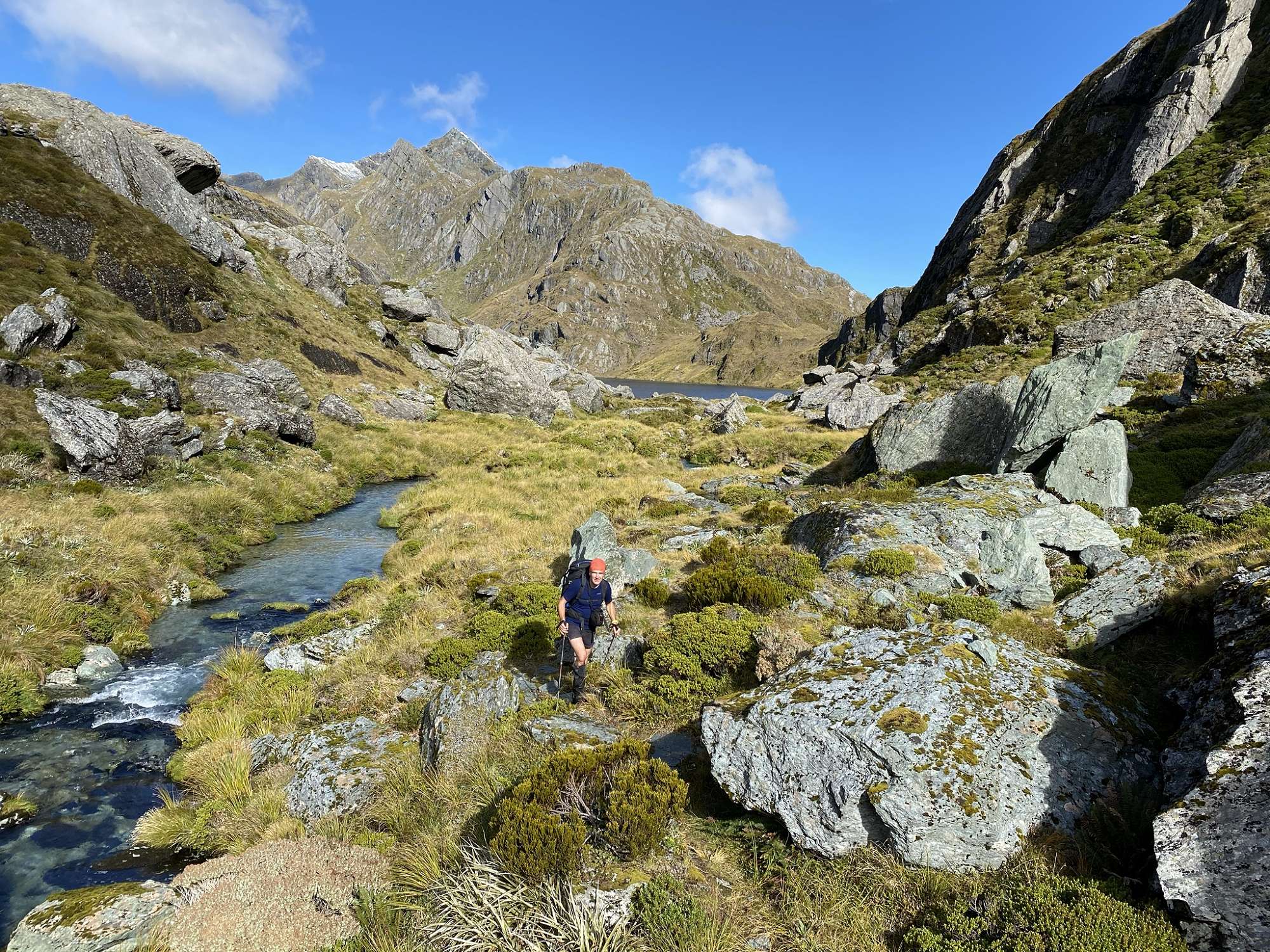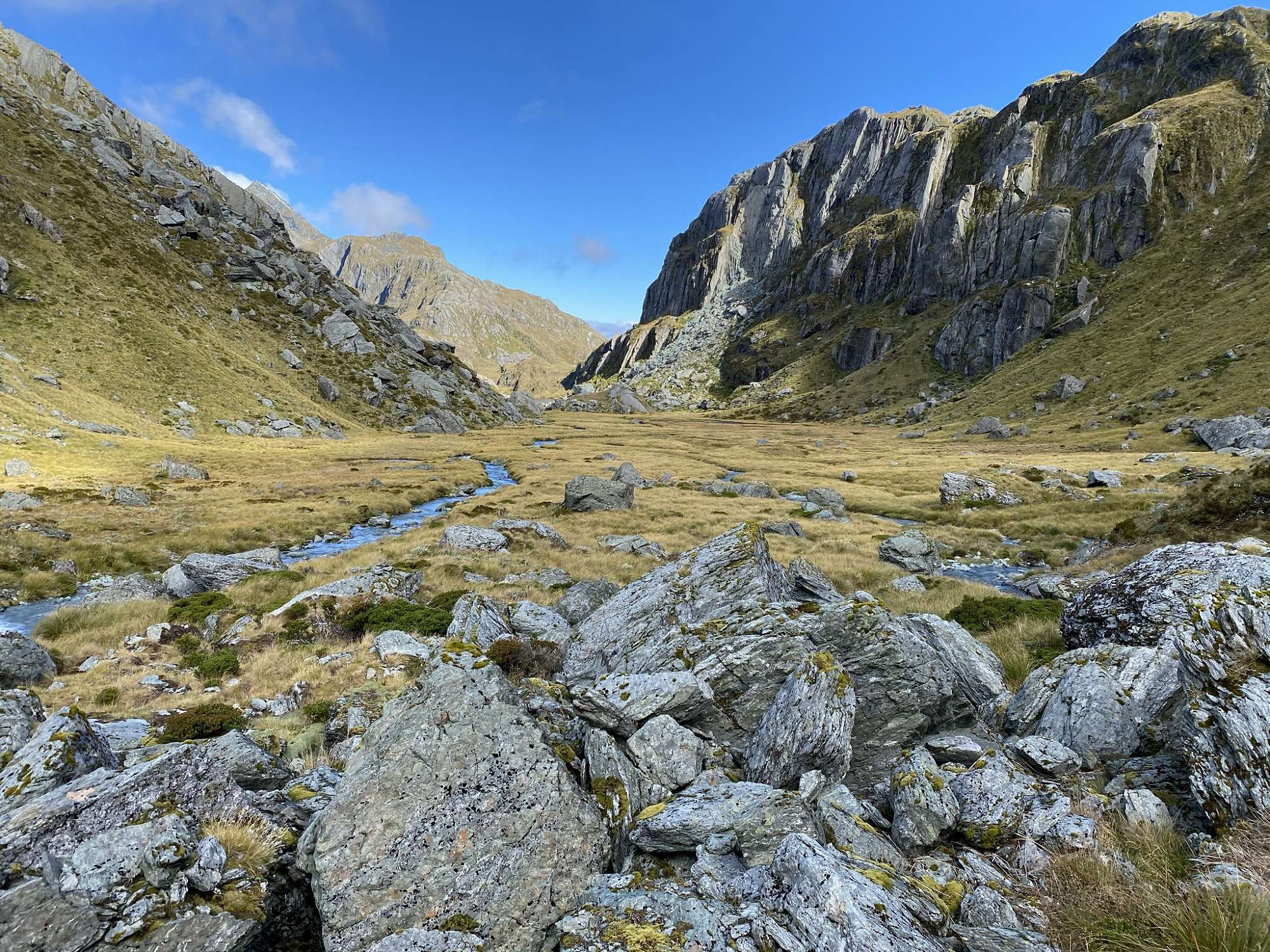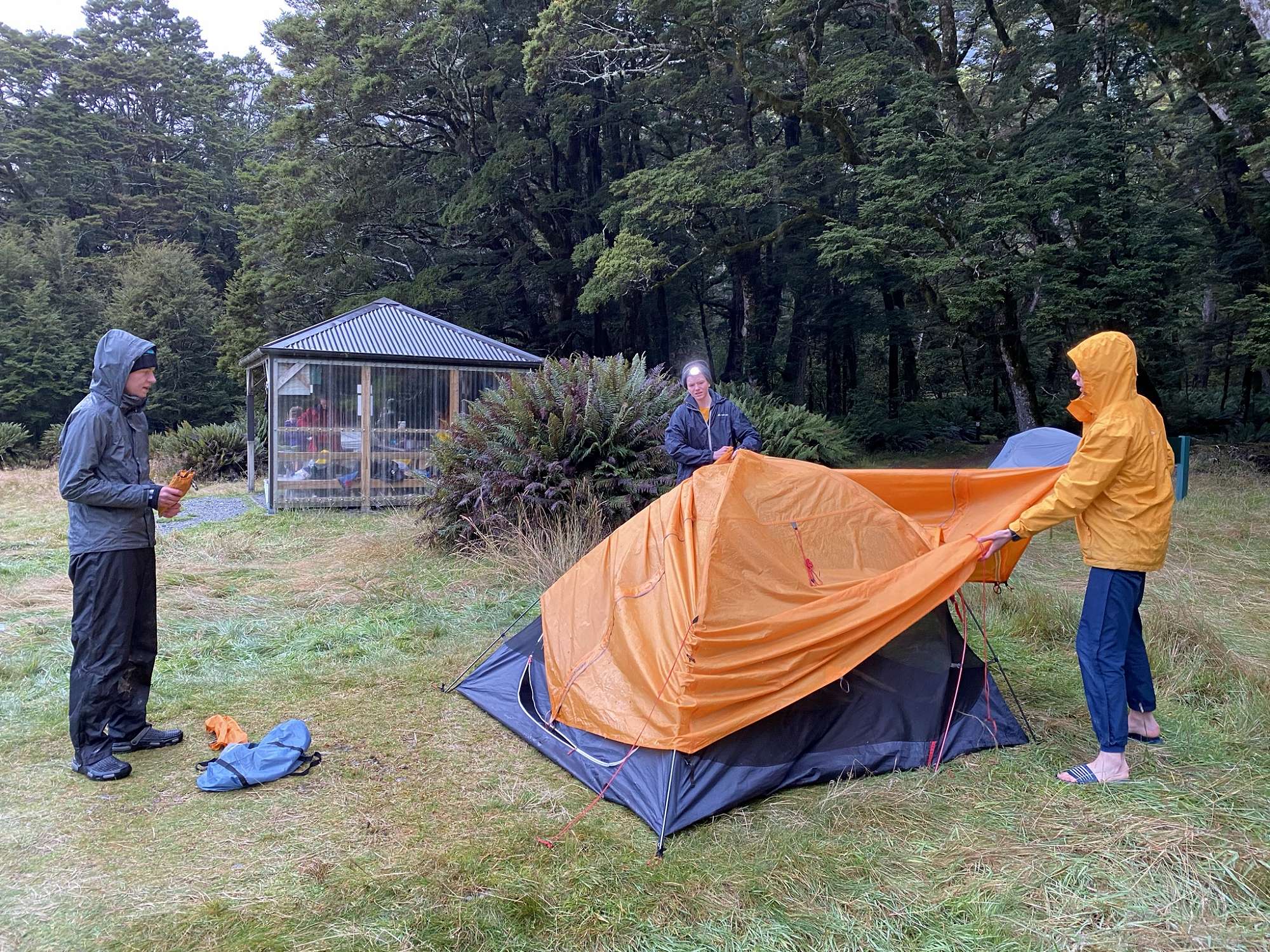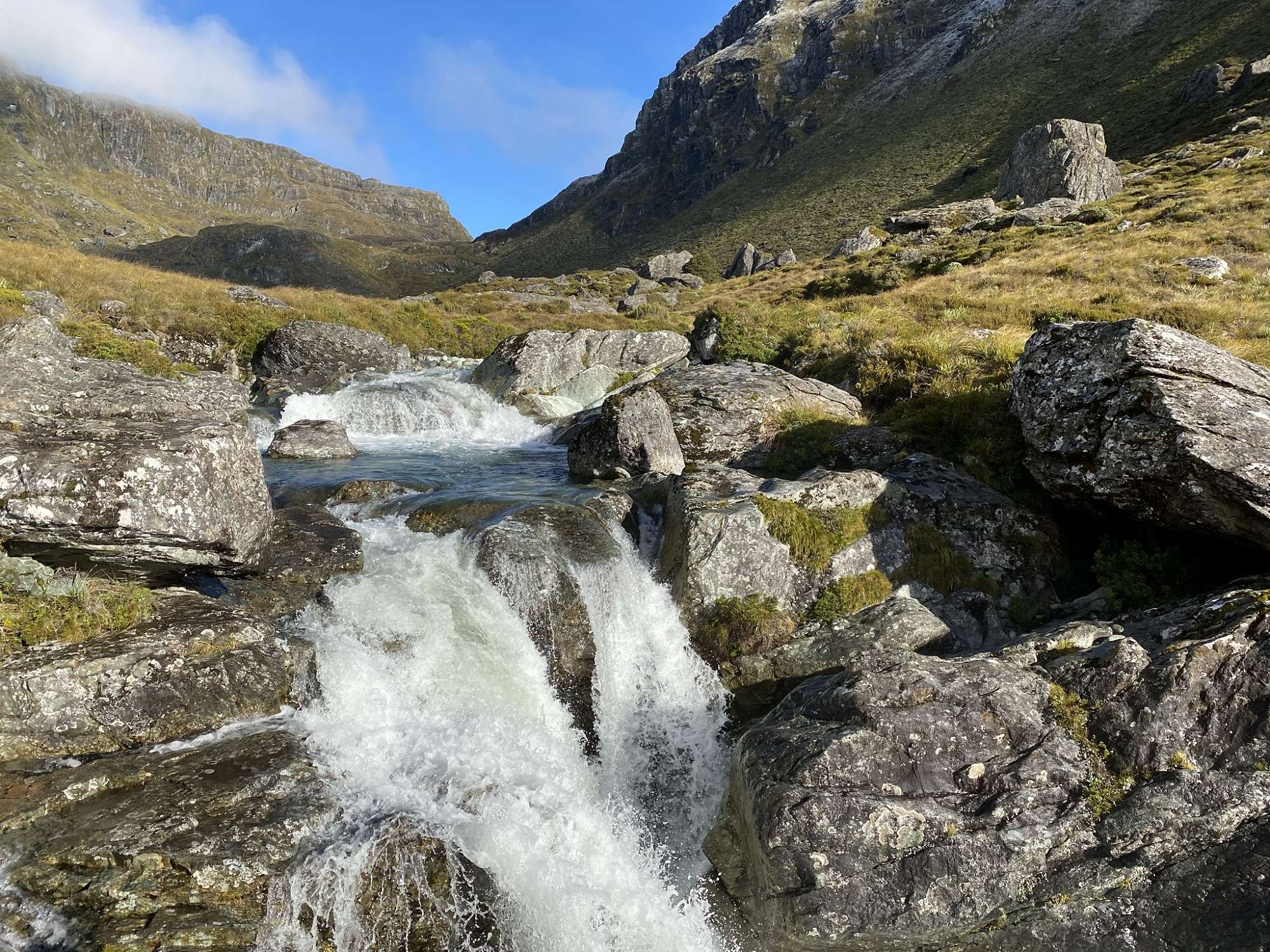The next day was distinctly uninspiring. There was steady rain for most of the morning which refused to clear as we set off, following the North Branch of the Routeburn River. The track through the North Routeburn Valley was rough in many places, non-existent in others, but we persevered and made good use of our navigation skills (and trapping trails) to overcome swamps, boulder fields and the river. We made the decision to set up our emergency shelters for lunch after rain, more bitter wind and the disappearance of the trapping trail markers into a boulder field halted our progress. When we finally emerged, the weather had cleared beautifully and we explored up further before returning down the valley via an impressive waterfall and an intrepid, rock-filled route!