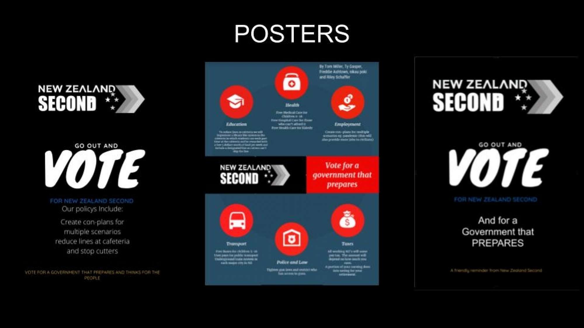 The students were put into ‘political parties'. Each group member had an important role to play in the designing and function of their party. Students produced advertising material, logos, slogans, sorted out who the leader of their party was and each party had an electoral candidate who had the important task of wowing us with their policies. Each party had to align their policies and campaign on two relevant policies for Dunedin or New Zealand and two for Otago Boys’ High School.