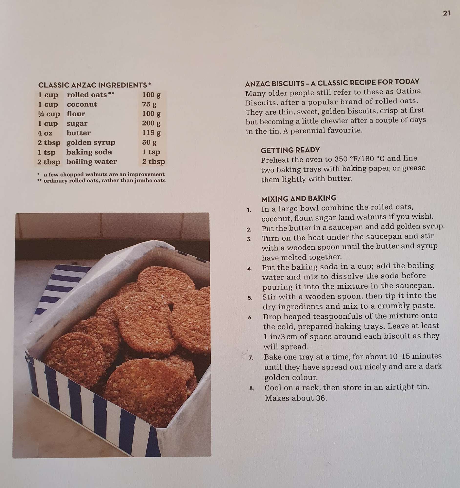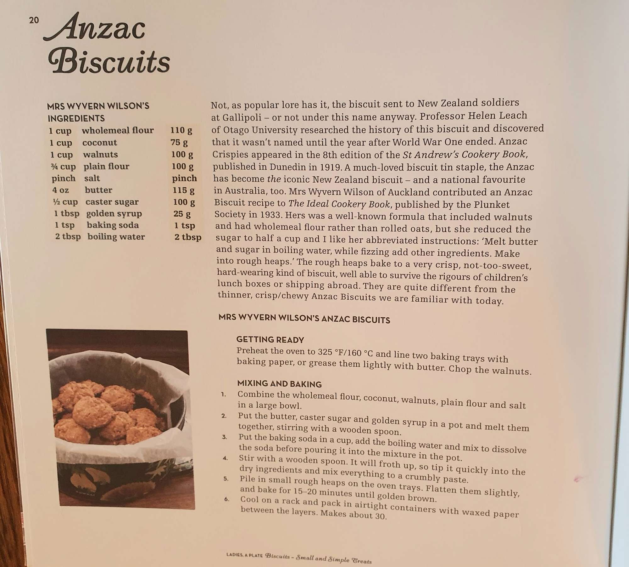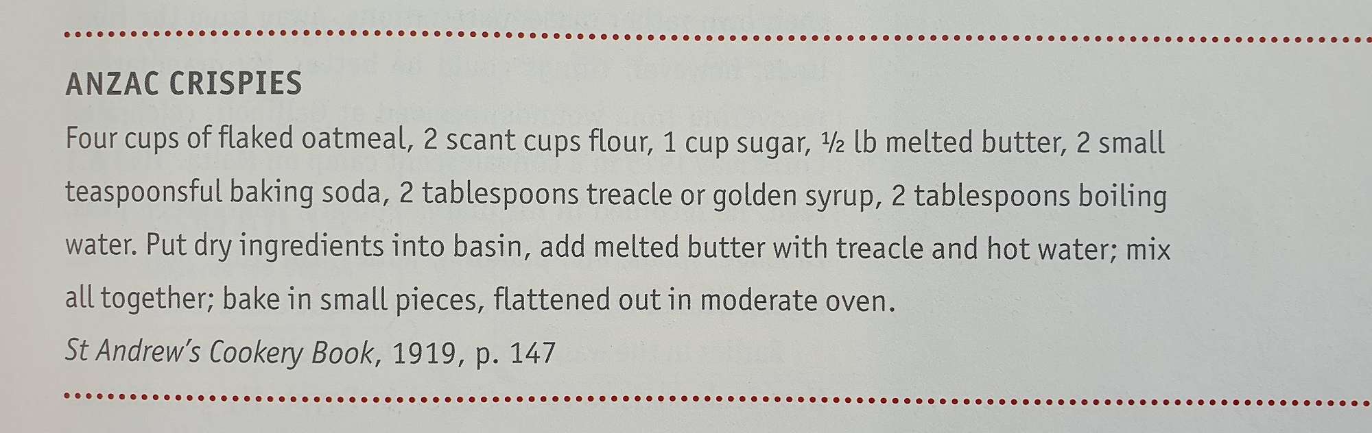 The three recipes attached to this include those two, and a recipe called 'ANZAC Crispies' - this is from the 'St Andrew's Cookery Book published in 1919. This recipe features alongside with the background story in 'First catch your weka' - A history of New Zealand Cooking by David Veart published in 2008.