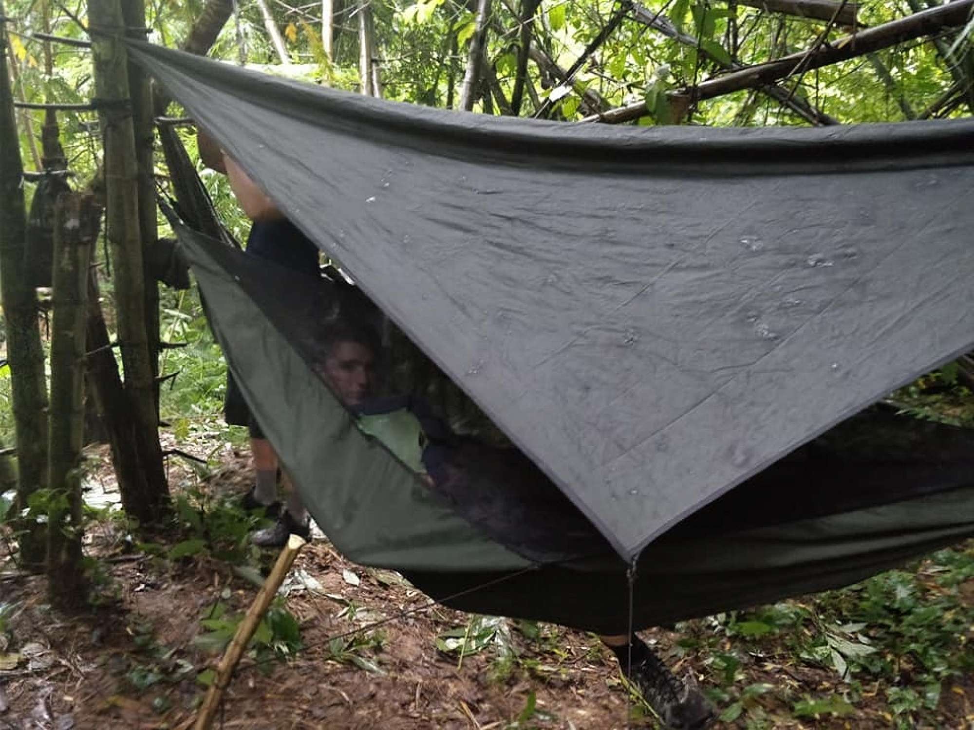 Then we moved onto our trekking phase in Northern Thailand. After a long hot first day, we arrived at a river, where we crossed in a small inflatable boat to our first campsite. The guides had arrived early in the boat and set up a makeshift kitchen in a cave and made us coffee in mugs made out of bamboo. Later that night we ate rice and pork, drank milo and reminisced our trip. As the night grew older we headed to our sleeping area, a cluster of hammocks within bamboo. The jungle had other ideas. The majority of us woke to a drip of water, others to the rest of us frantically gathering our things. In our underpants and rain jackets, we ran through mud and pouring rain to the shelter of the cave, where things weren’t much better for us.