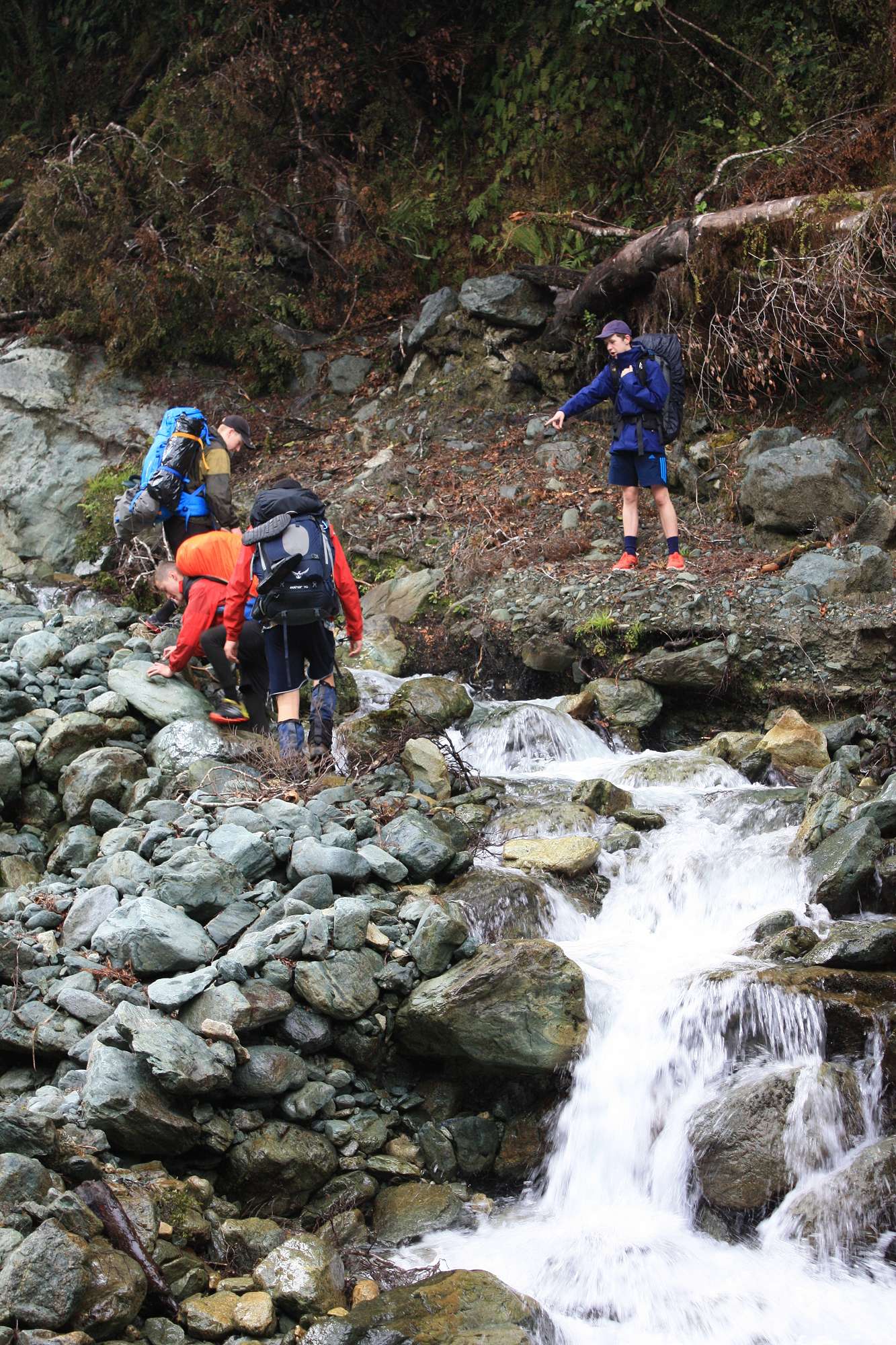 Day 3 was a huge day, as we skipped out the Demon Trail Hut and made it all the way to Alabaster Hut on the shores of Lake Alabaster in the Pyke Valley. While the distance of around 23km wasn’t too bad, there was a good reason this section of the track was known as the Demon Trail – large fallen trees obscuring the track in places, slippery rocks, mud and very uneven terrain made it quite challenging. With the second group arriving at the hut as it got dark at 8pm to be told it was full (when in reality there was plenty of space) wasn’t a particularly warm welcome, but the boys coped admirably. After all, a mattress on the floor was still a lot better than the tents back out in the rain!