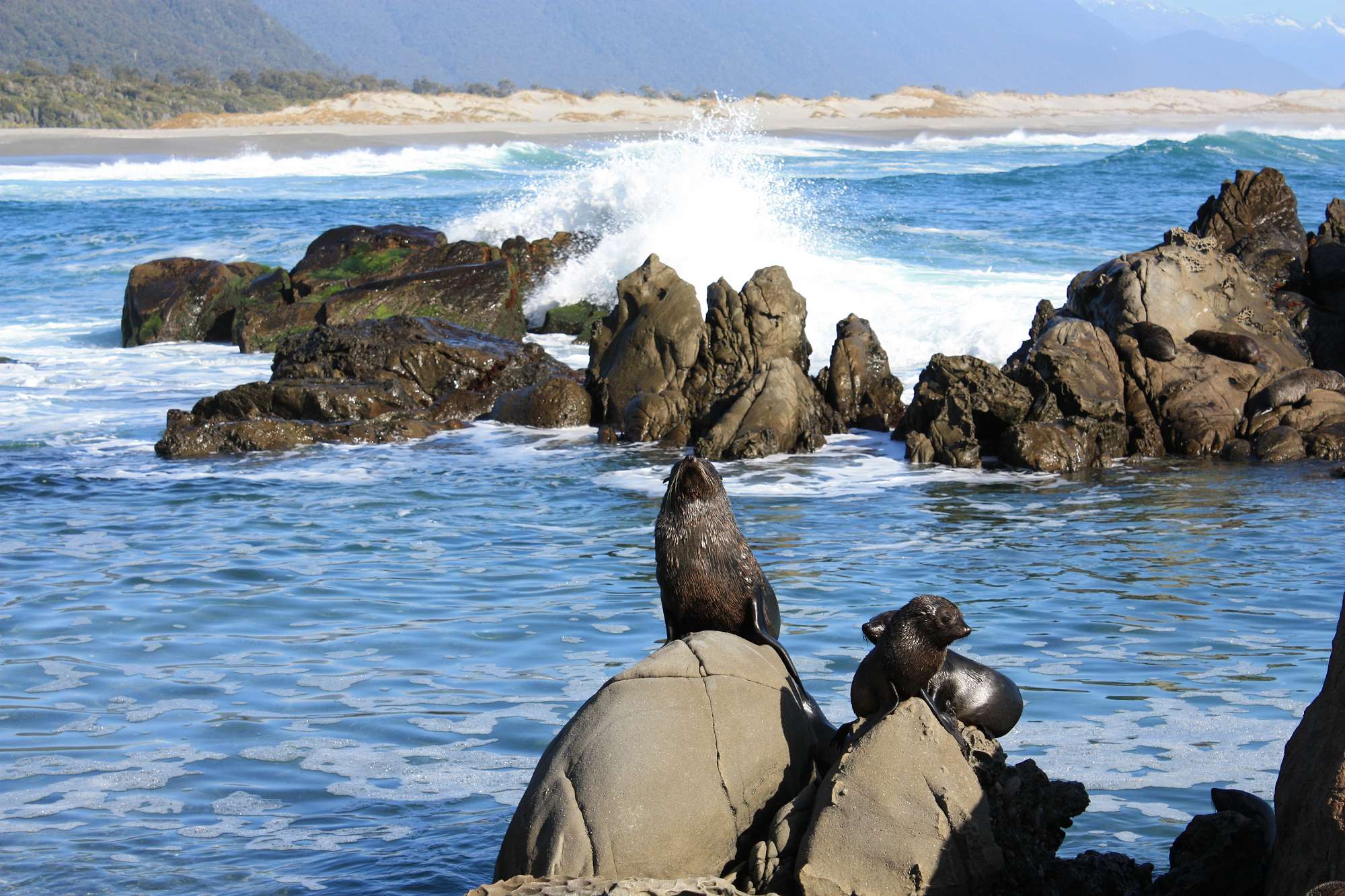 Day one consisted of an easy 4km stroll from the airstrip to the Martins Bay Hut which is positioned at the mouth of the Hollyford River. We had seals swimming past within a few metres of the boys campsite, and within a 10 minute walk were able to get up close to a large nursery of baby seals and some Fiordland crested penguins.