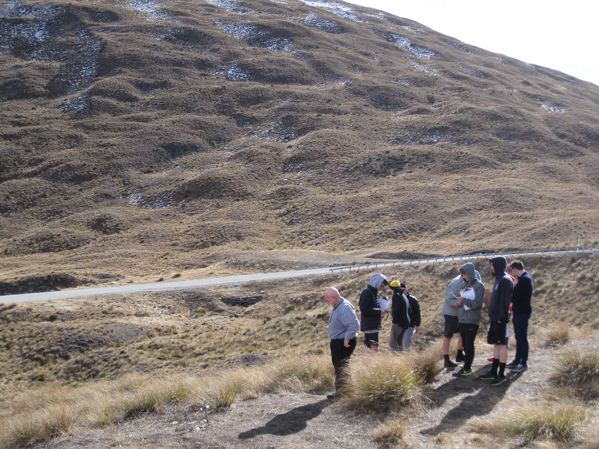 We went straight to the top of the Crown Range, which was pretty cold, despite being ten degrees, then descended to the old Bendigo School site. The aim was to make scientific observations at various altitudes, including temperature, wind, cloud cover and landscape and vegetation.