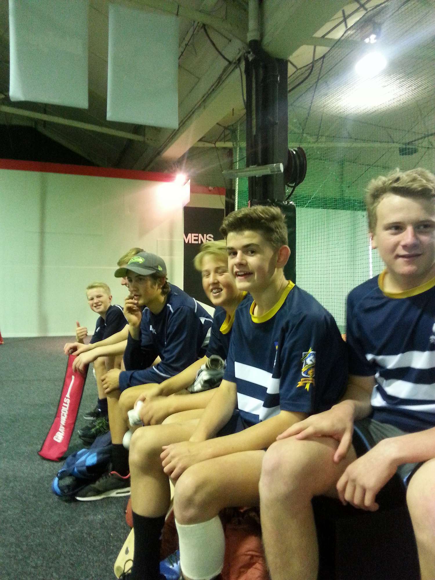 Indoor cricket continues apace as Elliott Alloo and Issac Pratley do battle inside the nets with the team looking on.