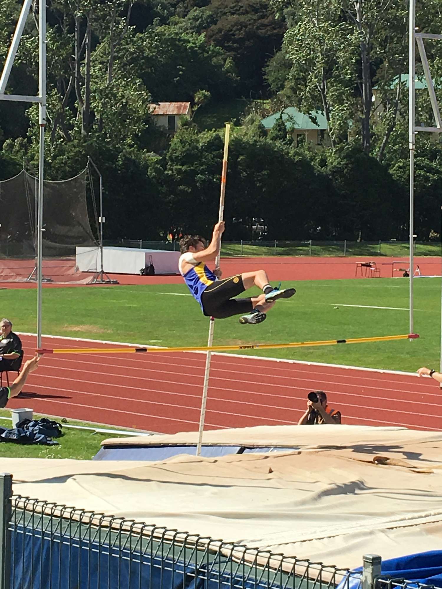 This was a good start, however both his rival competitors had scored better at Hurdles, Pole Vault and Javelin in their respective regional championships so it was apparent the 185 point lead was going to be difficult to maintain. Cameron managed to run a 16.60 second 110m hurdles which was a personal best by over 1.5 seconds, however Mathew Aucamp ran an outstanding 15.38 seconds. Cameron knew at this stage that it was going to be a long day. The Discus allowed Cameron a brief reprieve with a solid performance of 36.12 metres.