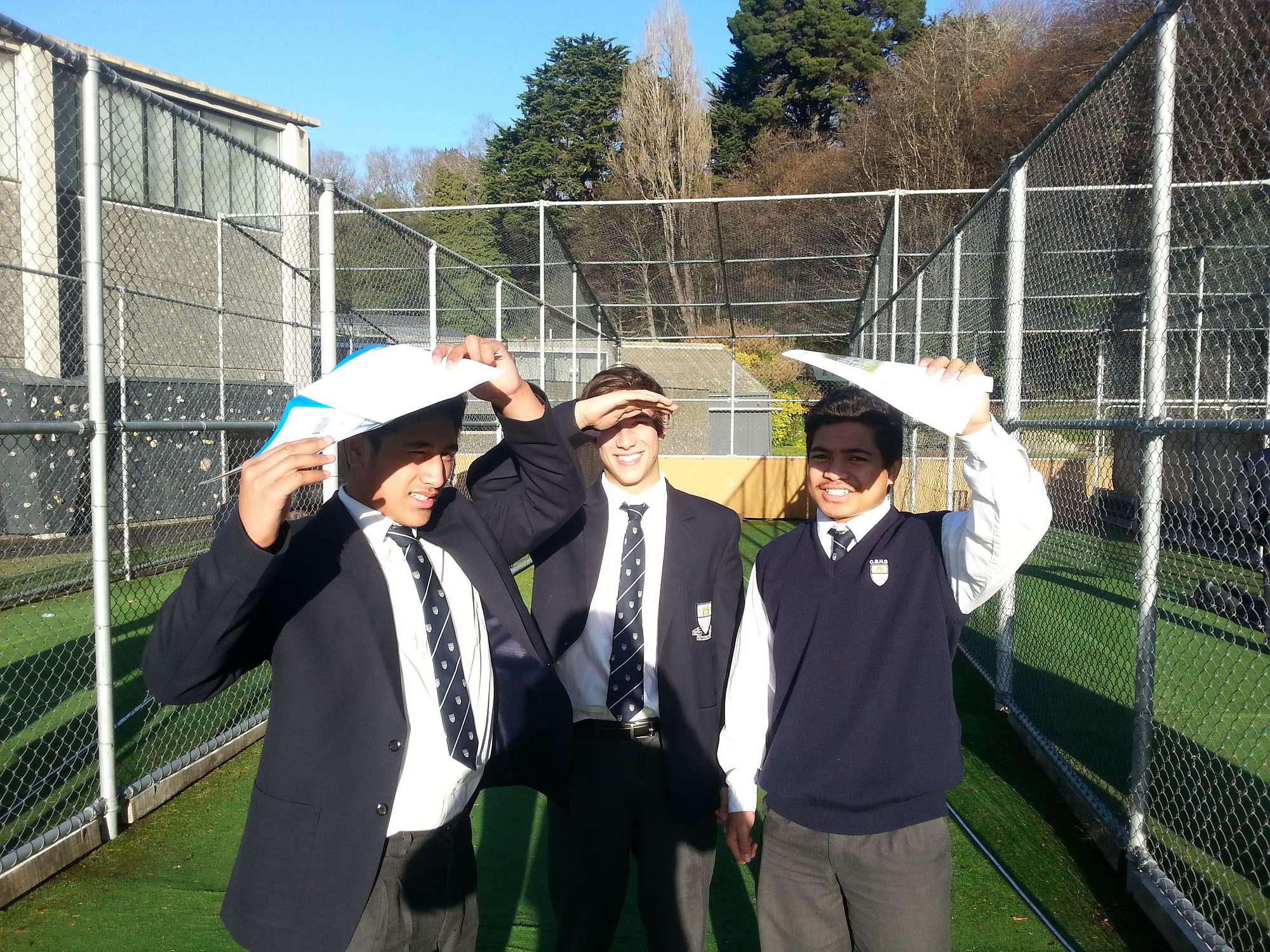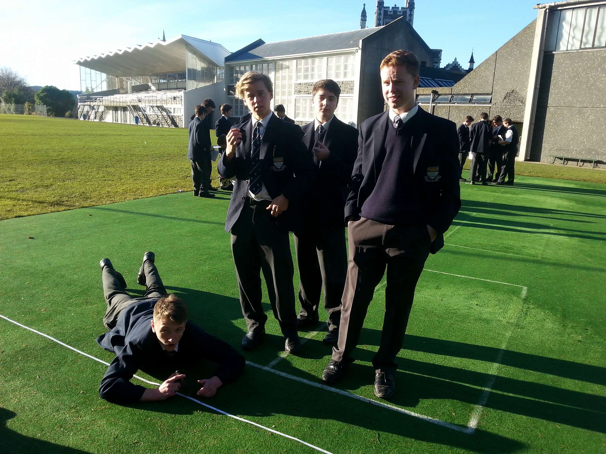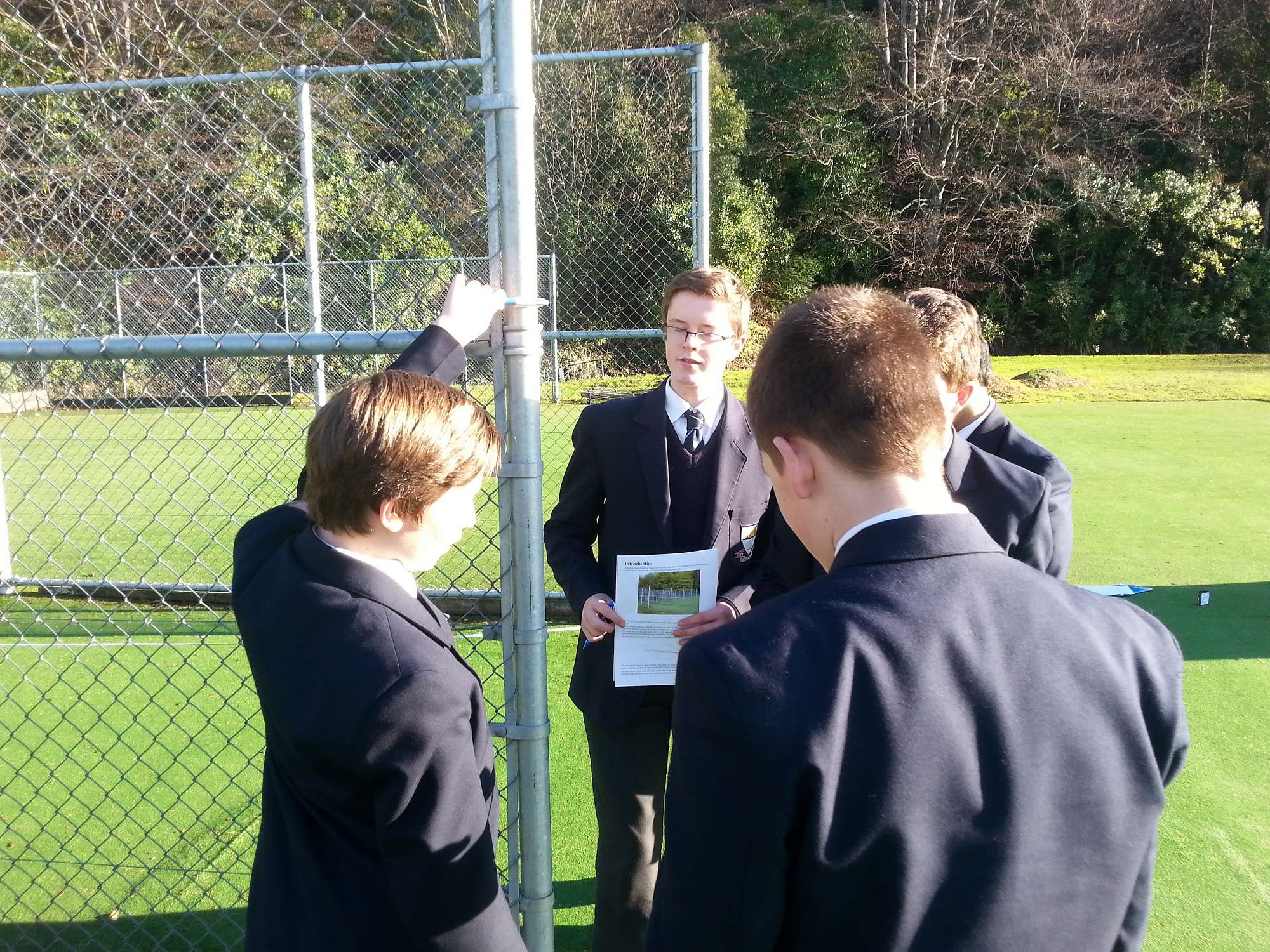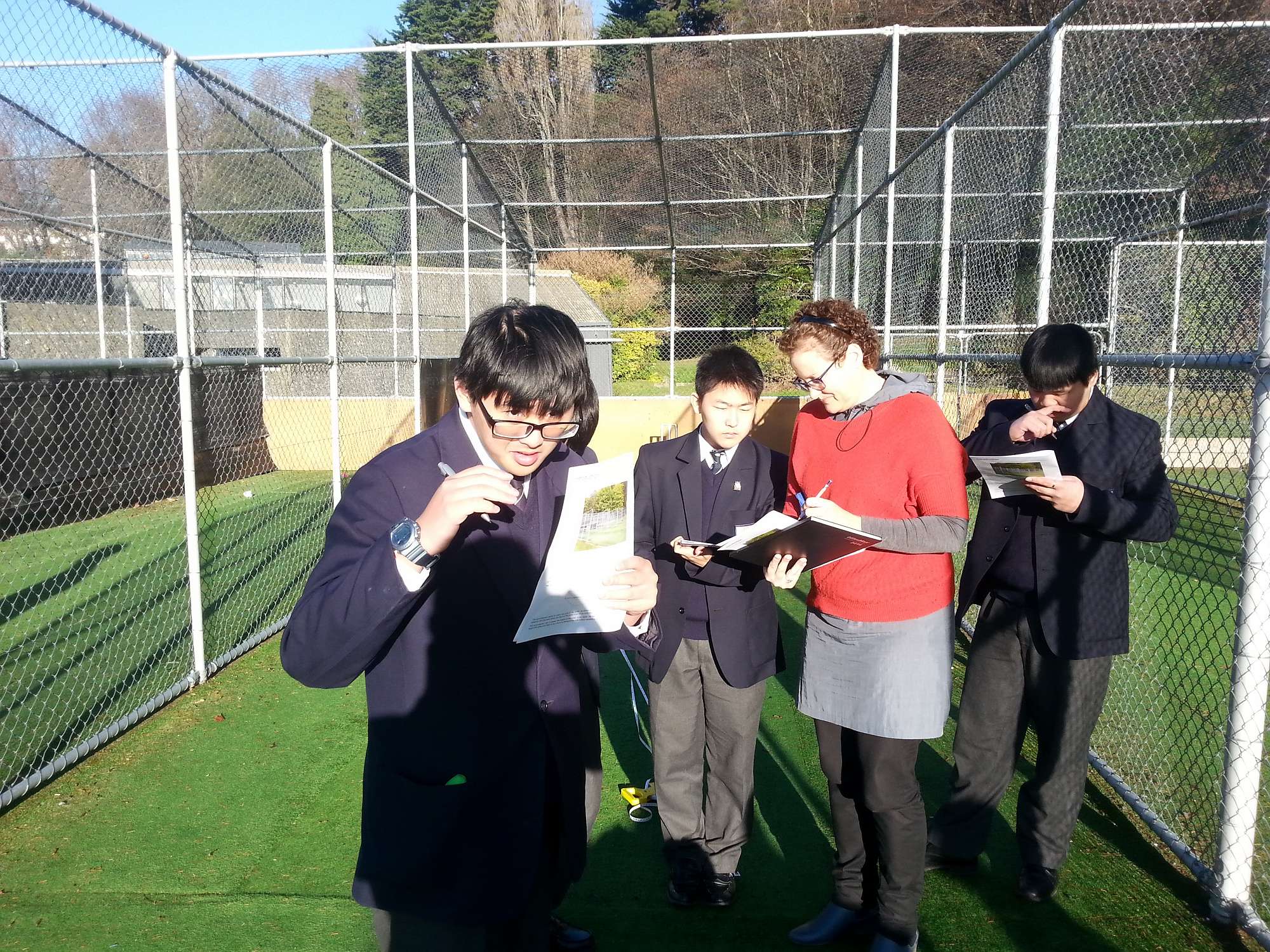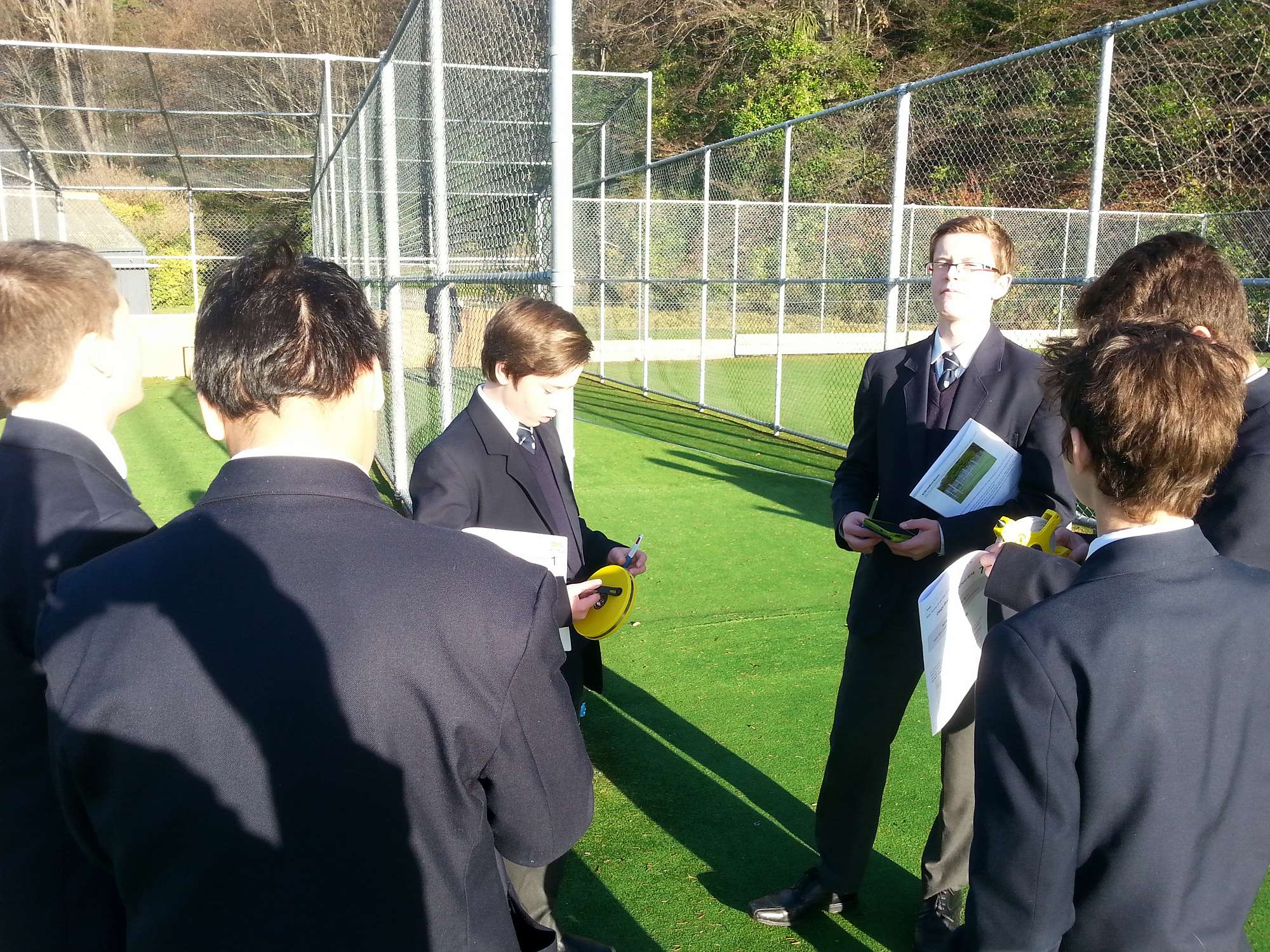 Year 11 students having great fun and learning in bright mid-winter sun how to find the height of objects using two very different methods.