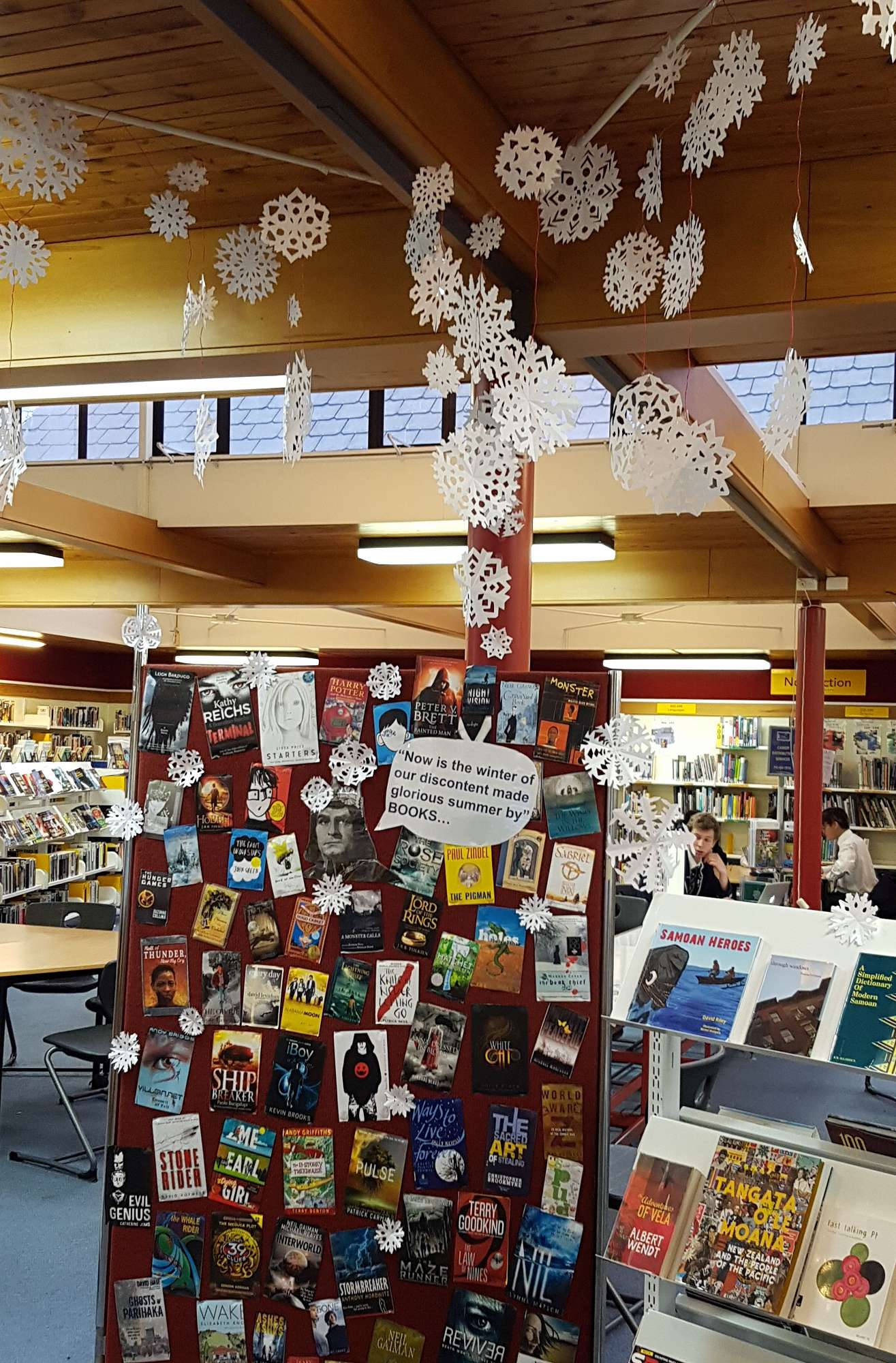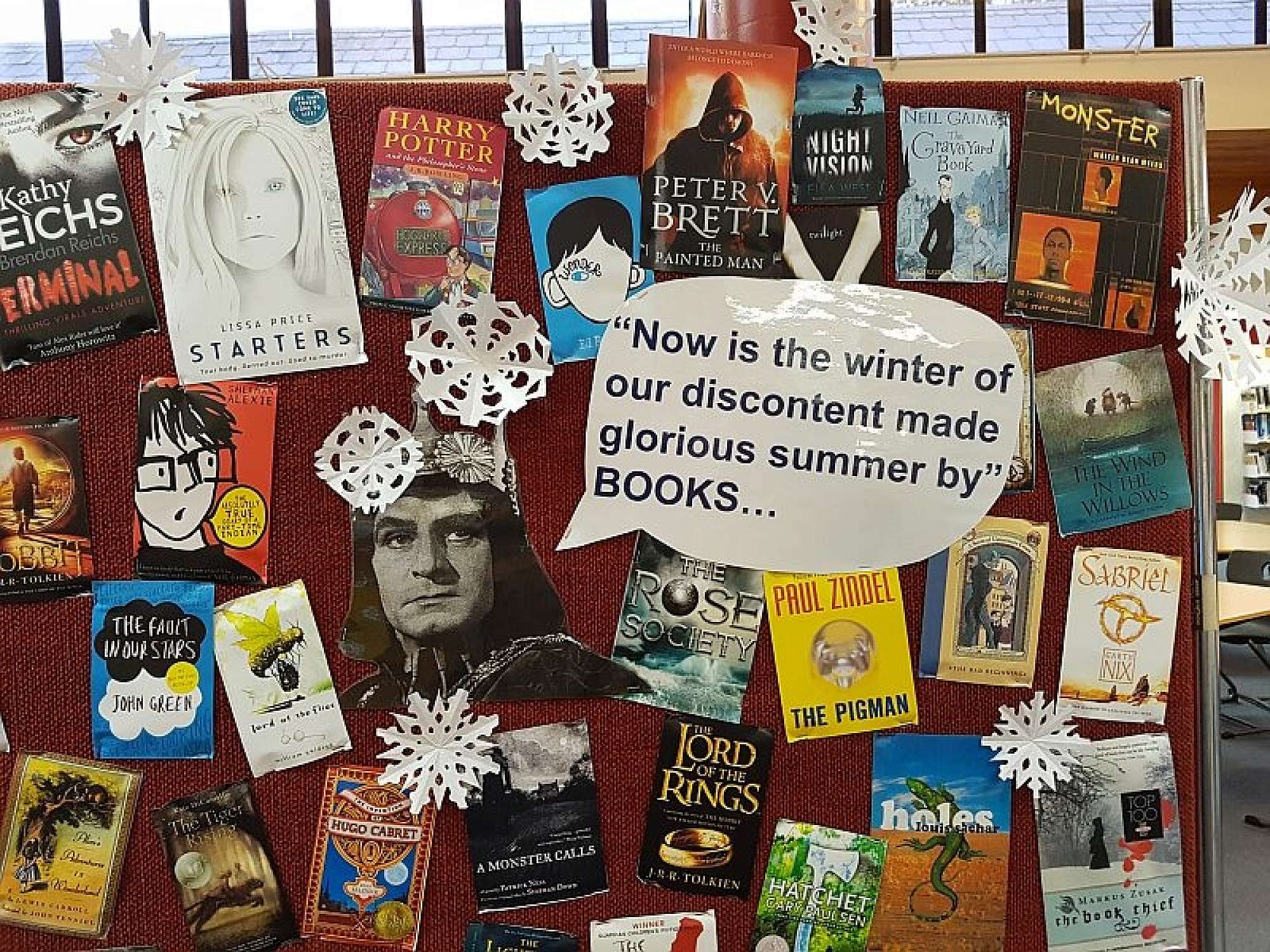 Dunedin loves a good snow day. With this in mind the current Library display uses Shakespeare's Richard III to remind people that the coldest day can be made enjoyable by one basking in the warm glow of a good book. A dusting of snowflakes covers this idea with the promise of a snow day, hopefully Monday, when we can all stay in bed and read!