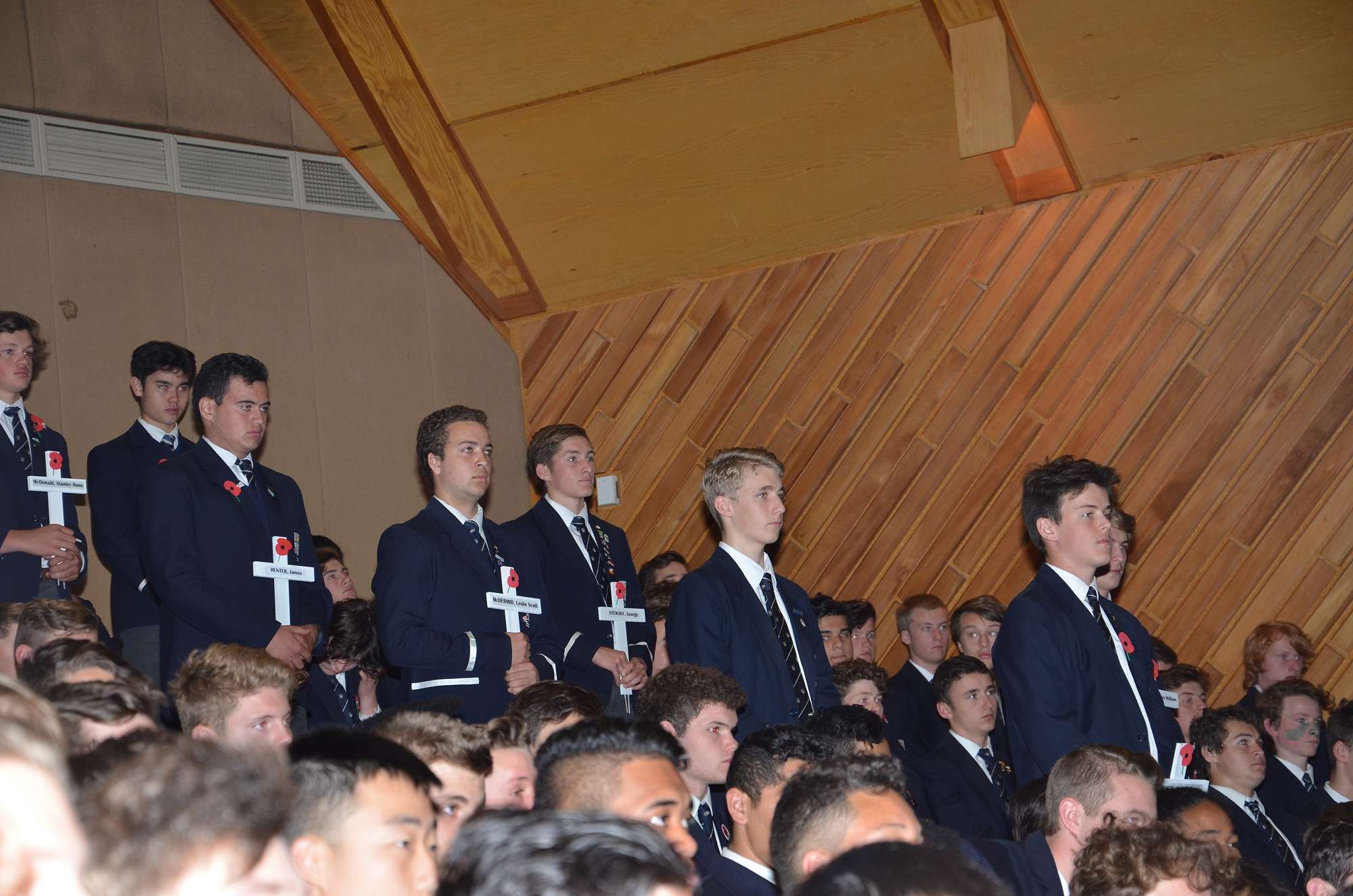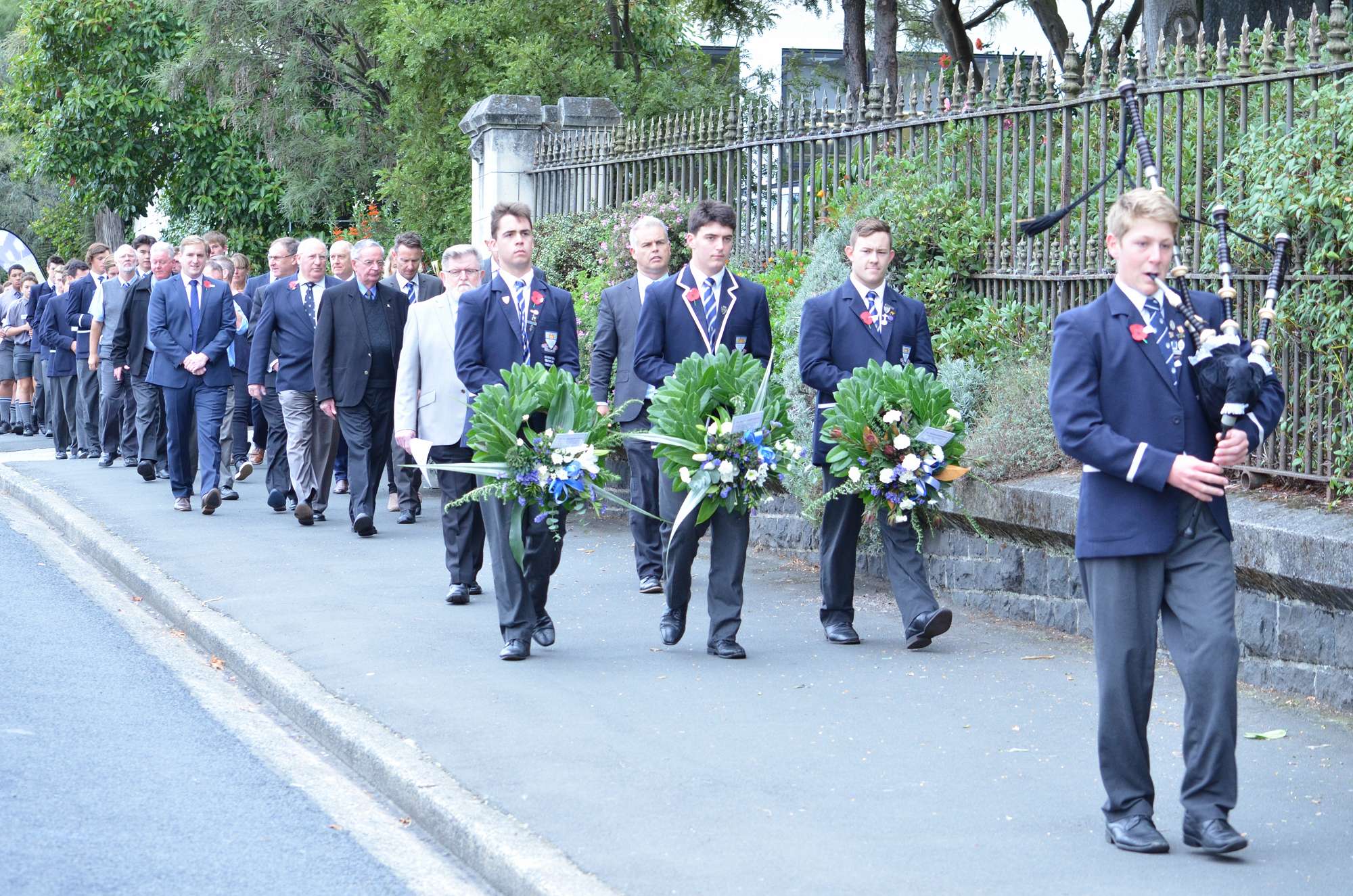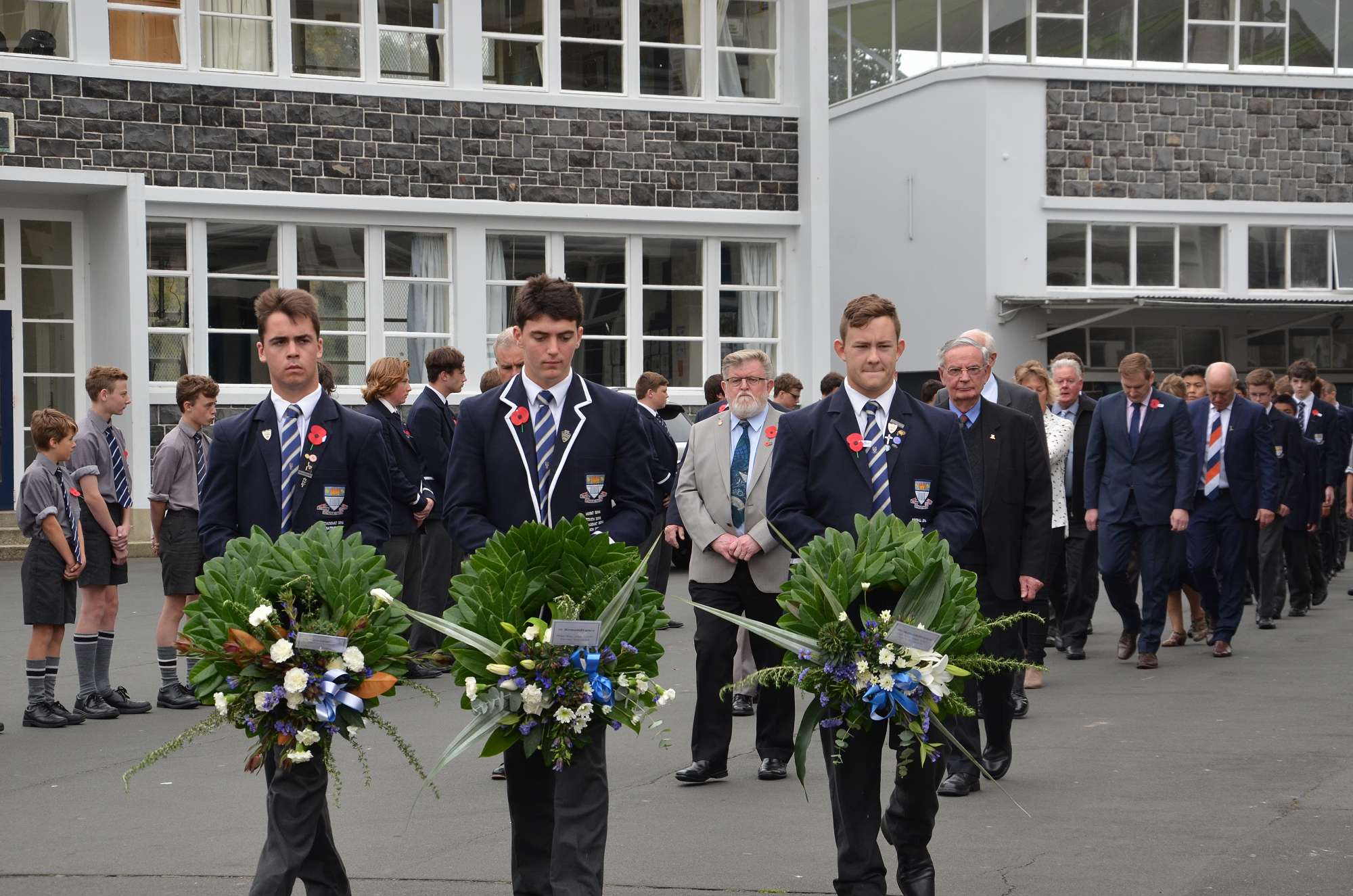 Today's ceremony began with a procession from Arthur Street Park. Boys carried crosses to remember our 35 old boys who died in battle at Gallipoli. They passed through the Arch of Remembrance, a memorial to all of our old boys who died in the First World War. The old school bell was rung 35 times to acknowledge each fallen student. The ceremony ended with the playing of the last post by Mosese Fosita.