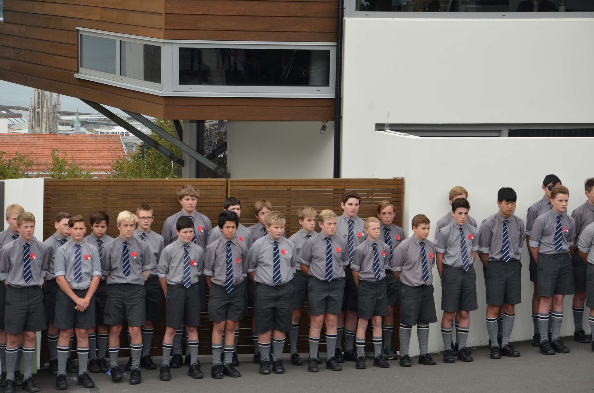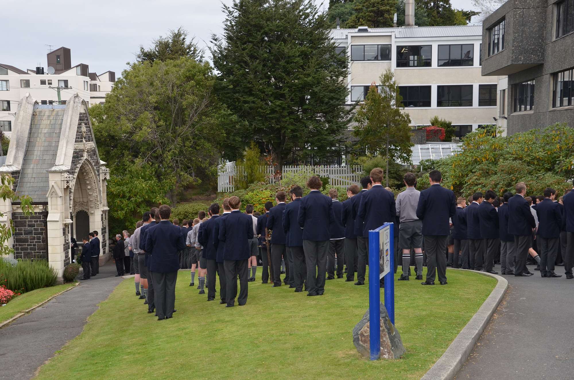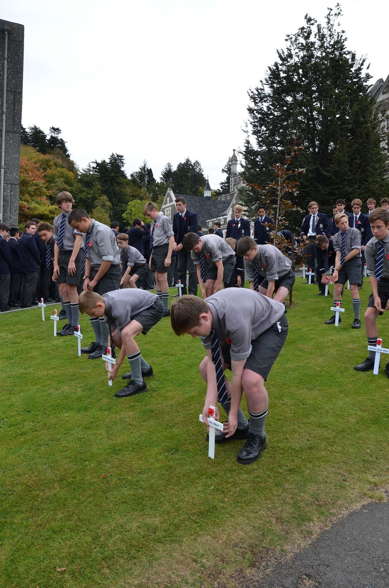 Today's ceremony began with a procession from Arthur Street Park. Boys carried crosses to remember our 35 old boys who died in battle at Gallipoli. They passed through the Arch of Remembrance, a memorial to all of our old boys who died in the First World War. The old school bell was rung 35 times to acknowledge each fallen student. The ceremony ended with the playing of the last post by Mosese Fosita.