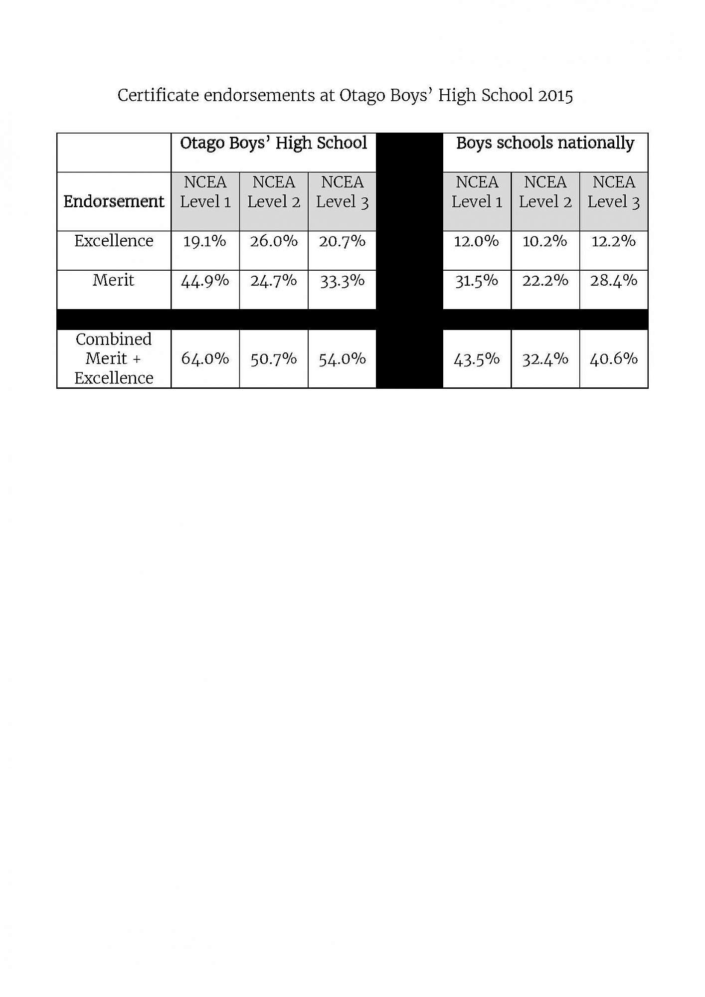 Congratulations to our boys, teachers and parents for a magnificent set of results with certificate endorsements. For the first time since NCEA endorsements began in 2007, at least 50% of our boys in each year level have achieved a Merit or Excellence endorsement.