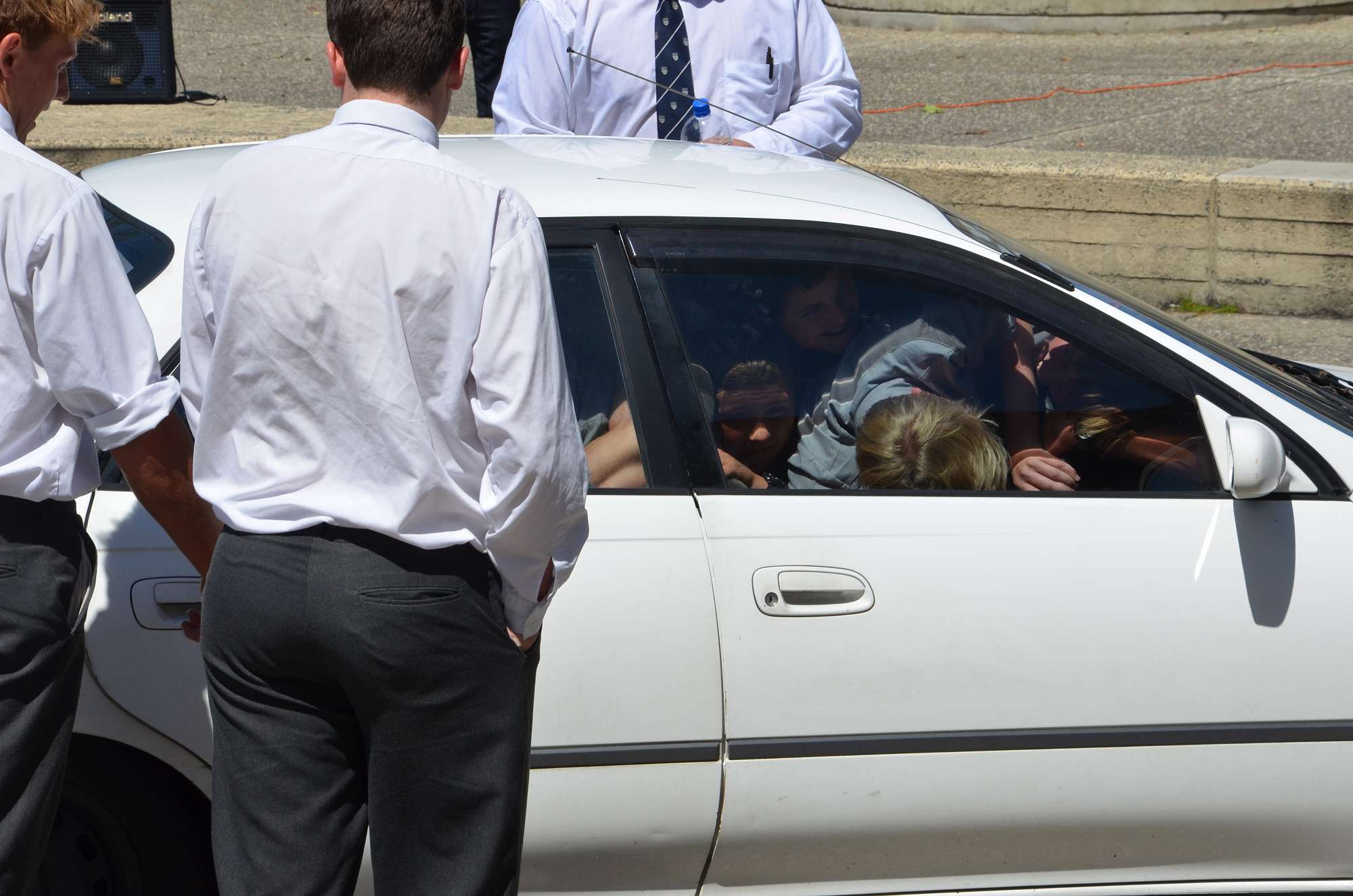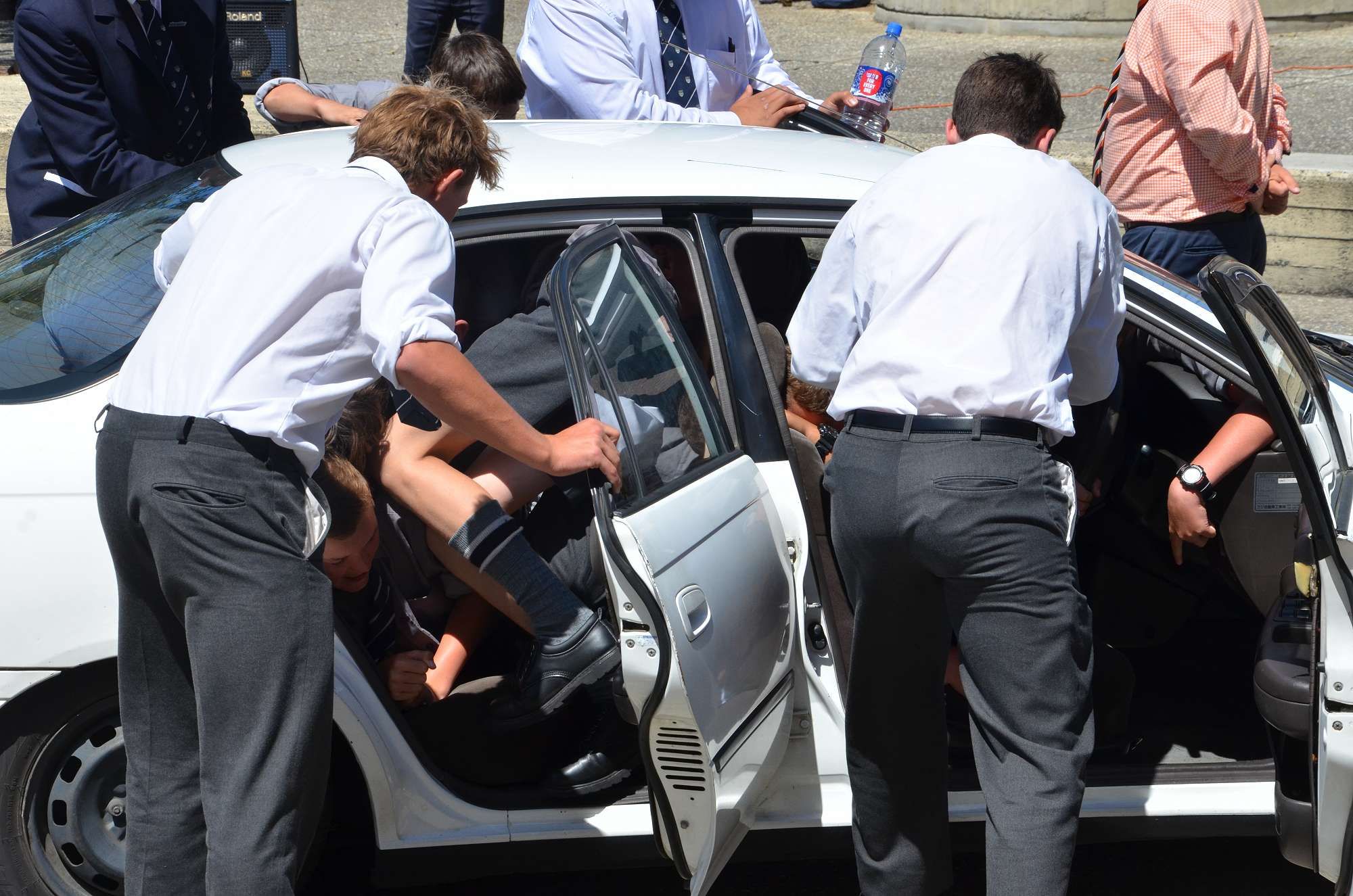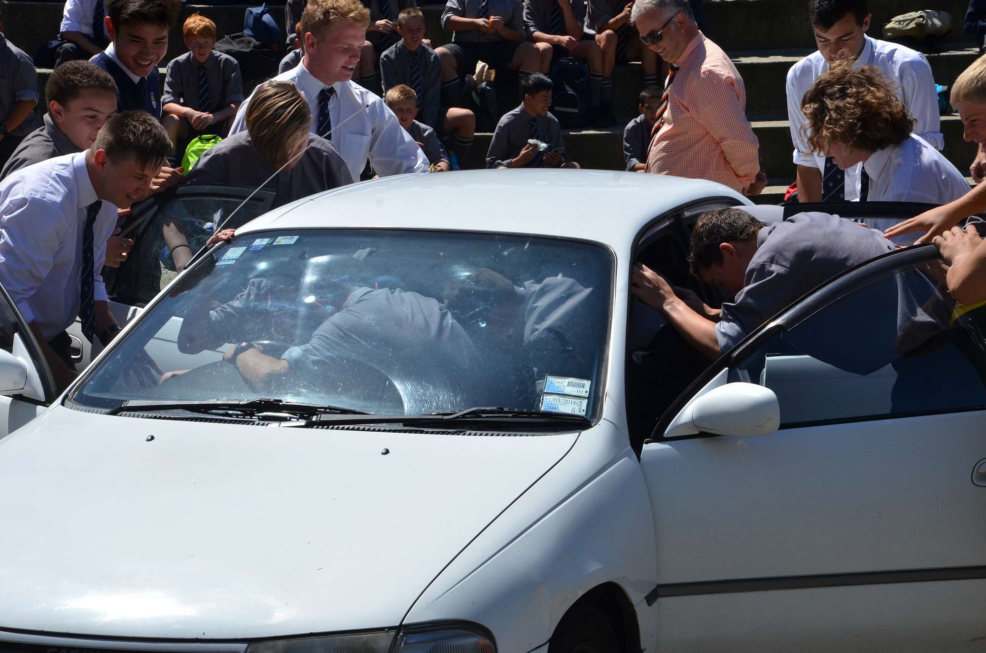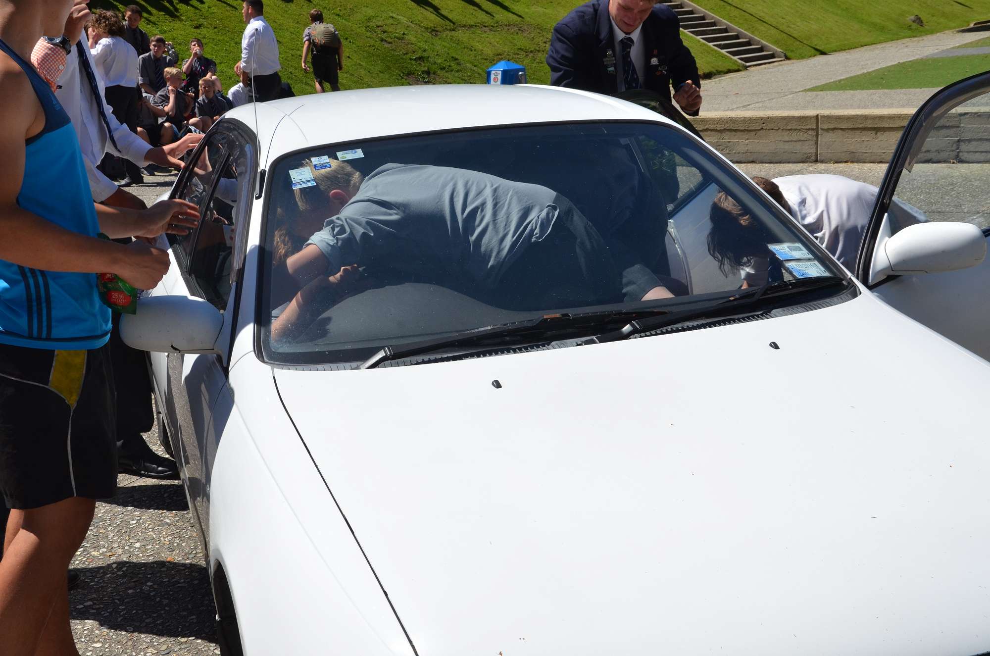 As part of our house competition house leaders tried to fit as many Year 9 boys as possibe into a staff member's car in 30 seconds. Park and McIndoe house teams both managed to squeeze 21 boys into the car. This made them 1st = in the house competition, ahead of both Saxton and Aspinall. All participants enjoyed themselves, showing huge smiles as they exited the vehcile at the end of each jam. The competition is sure to heat up in next Wednesday's House Sports Competition at the Caledonian Grounds.
