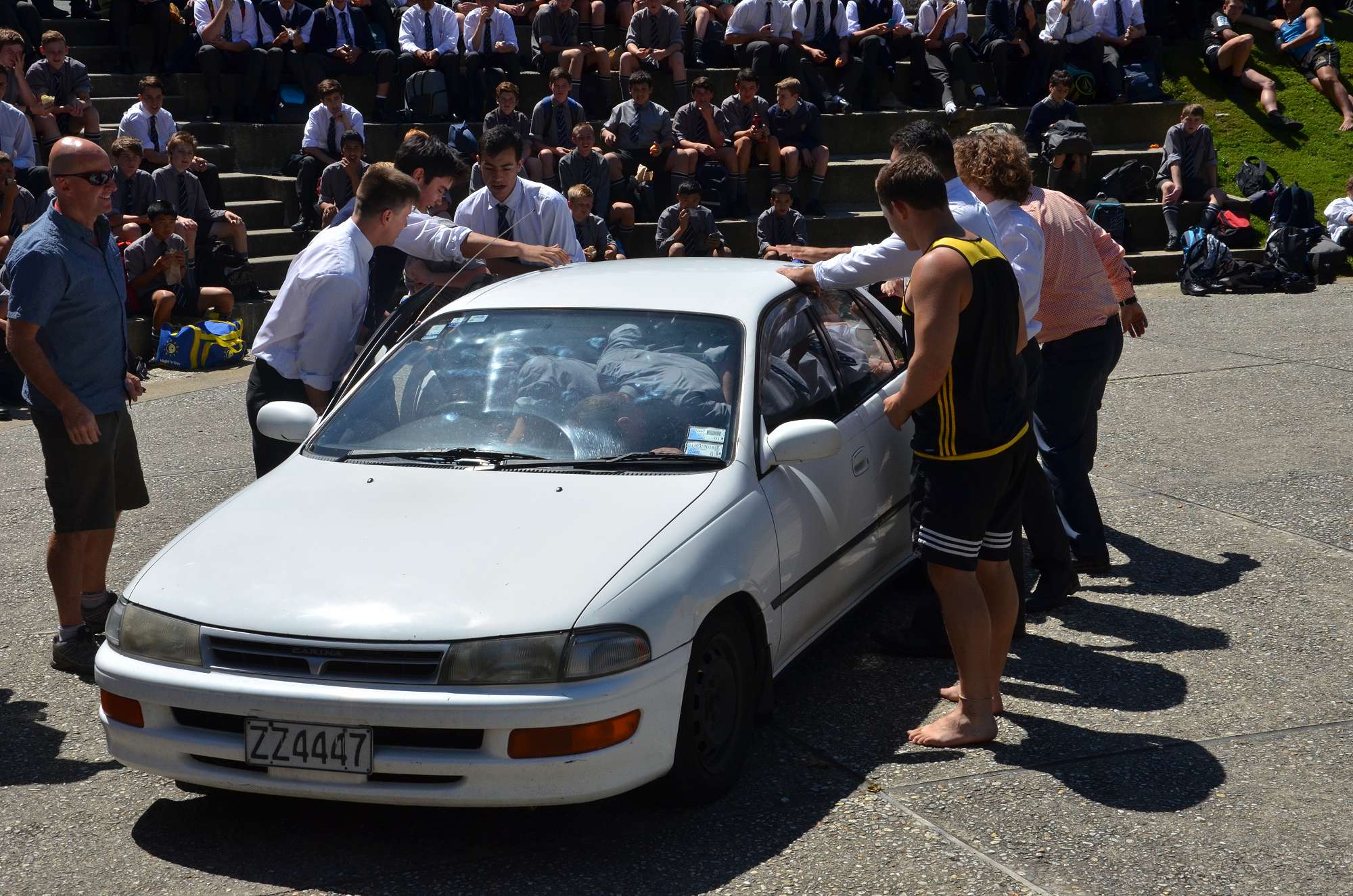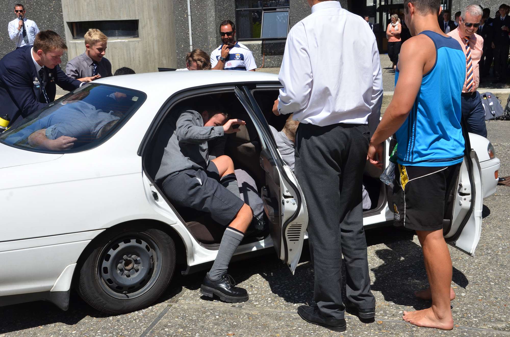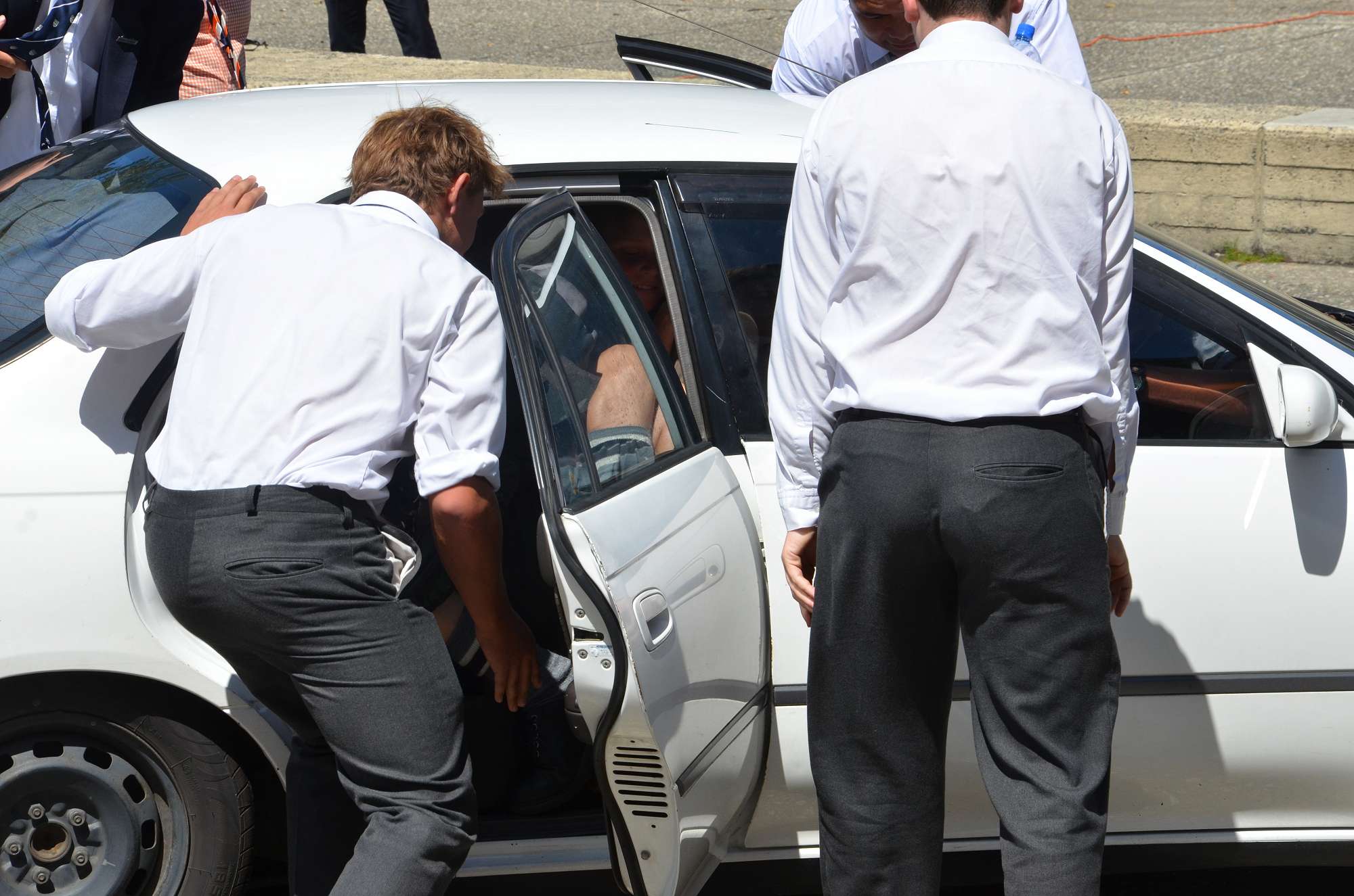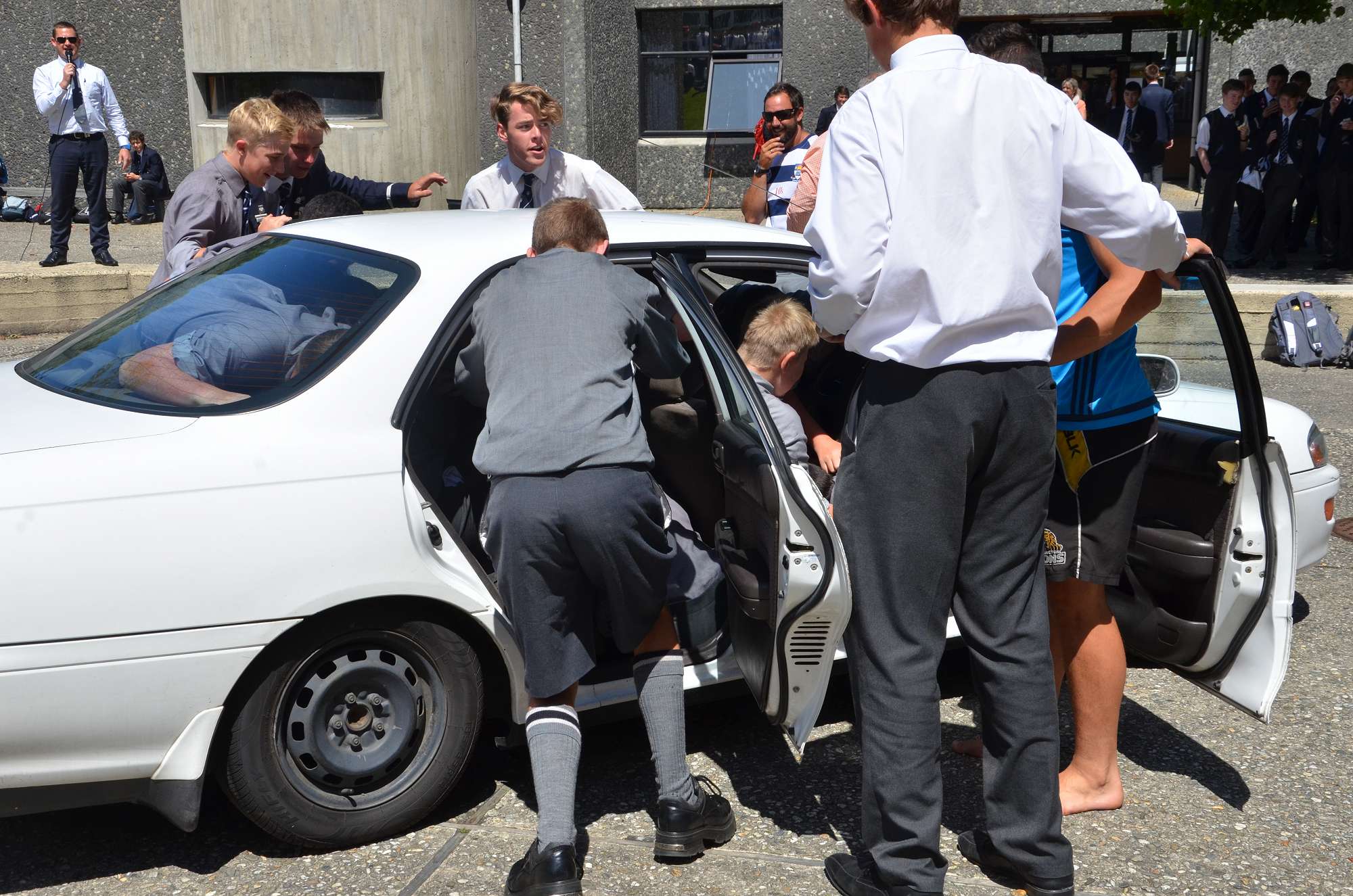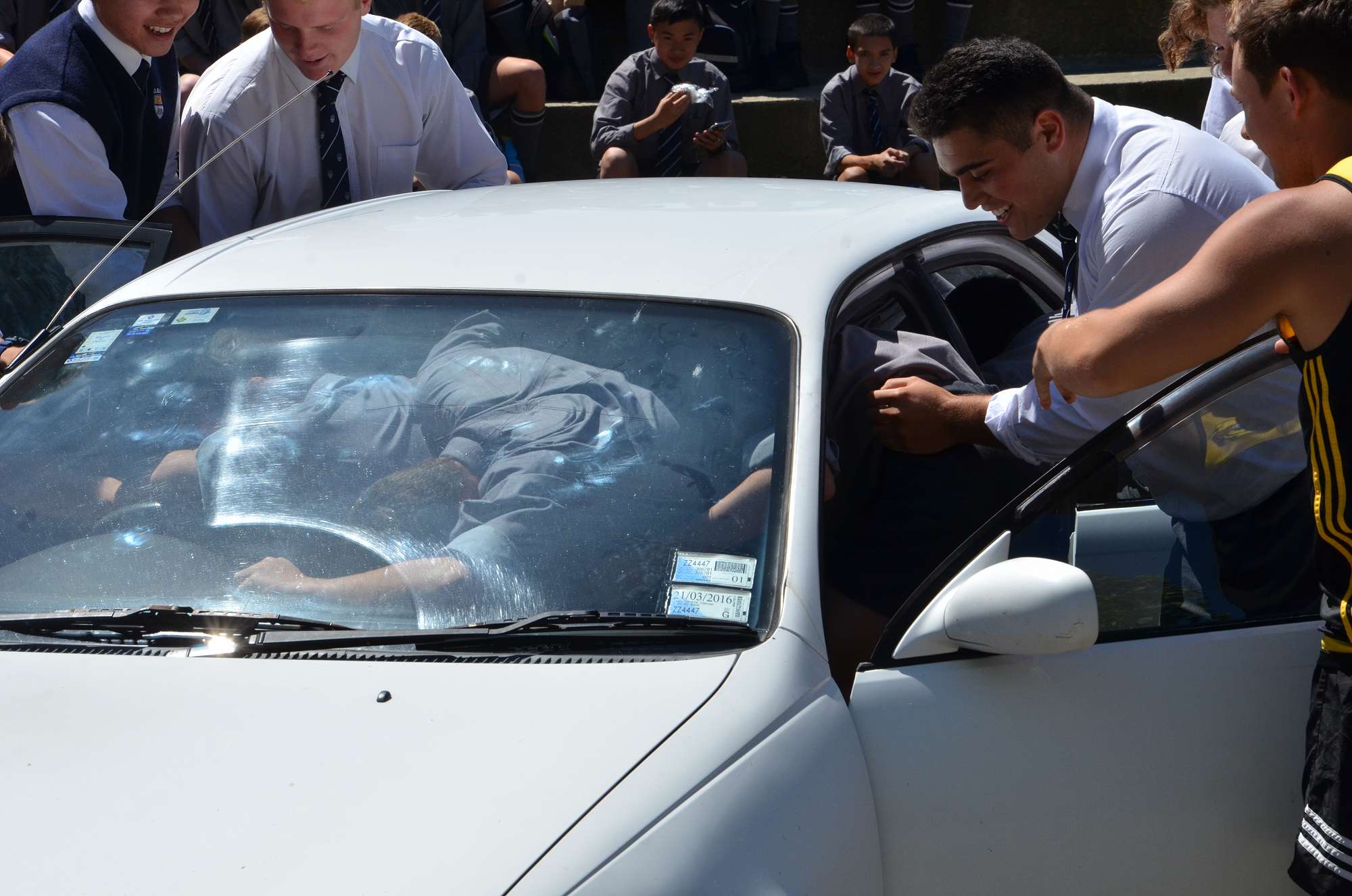 As part of our house competition house leaders tried to fit as many Year 9 boys as possibe into a staff member's car in 30 seconds. Park and McIndoe house teams both managed to squeeze 21 boys into the car. This made them 1st = in the house competition, ahead of both Saxton and Aspinall. All participants enjoyed themselves, showing huge smiles as they exited the vehcile at the end of each jam. The competition is sure to heat up in next Wednesday's House Sports Competition at the Caledonian Grounds.