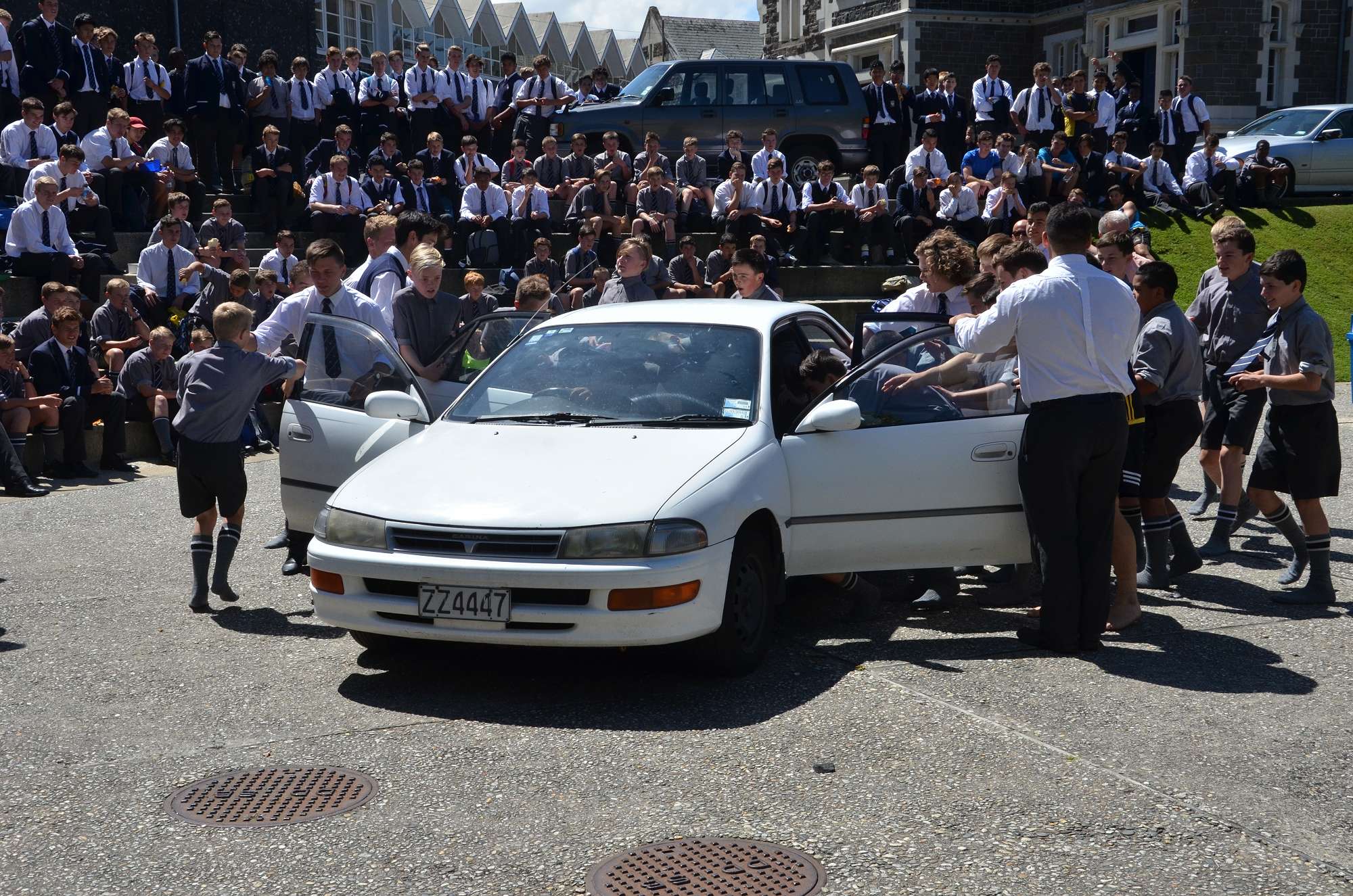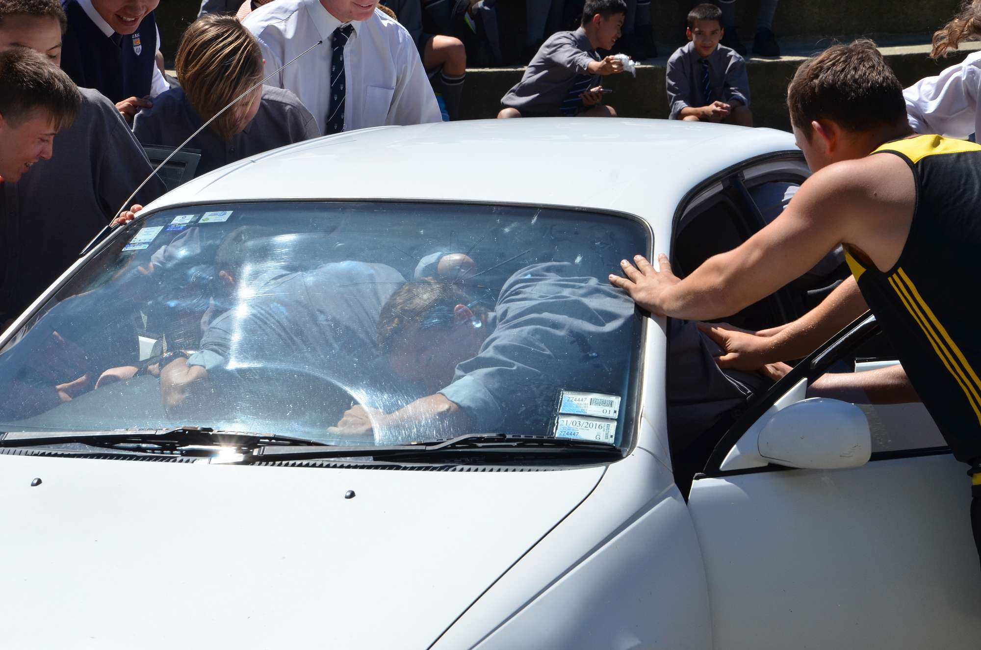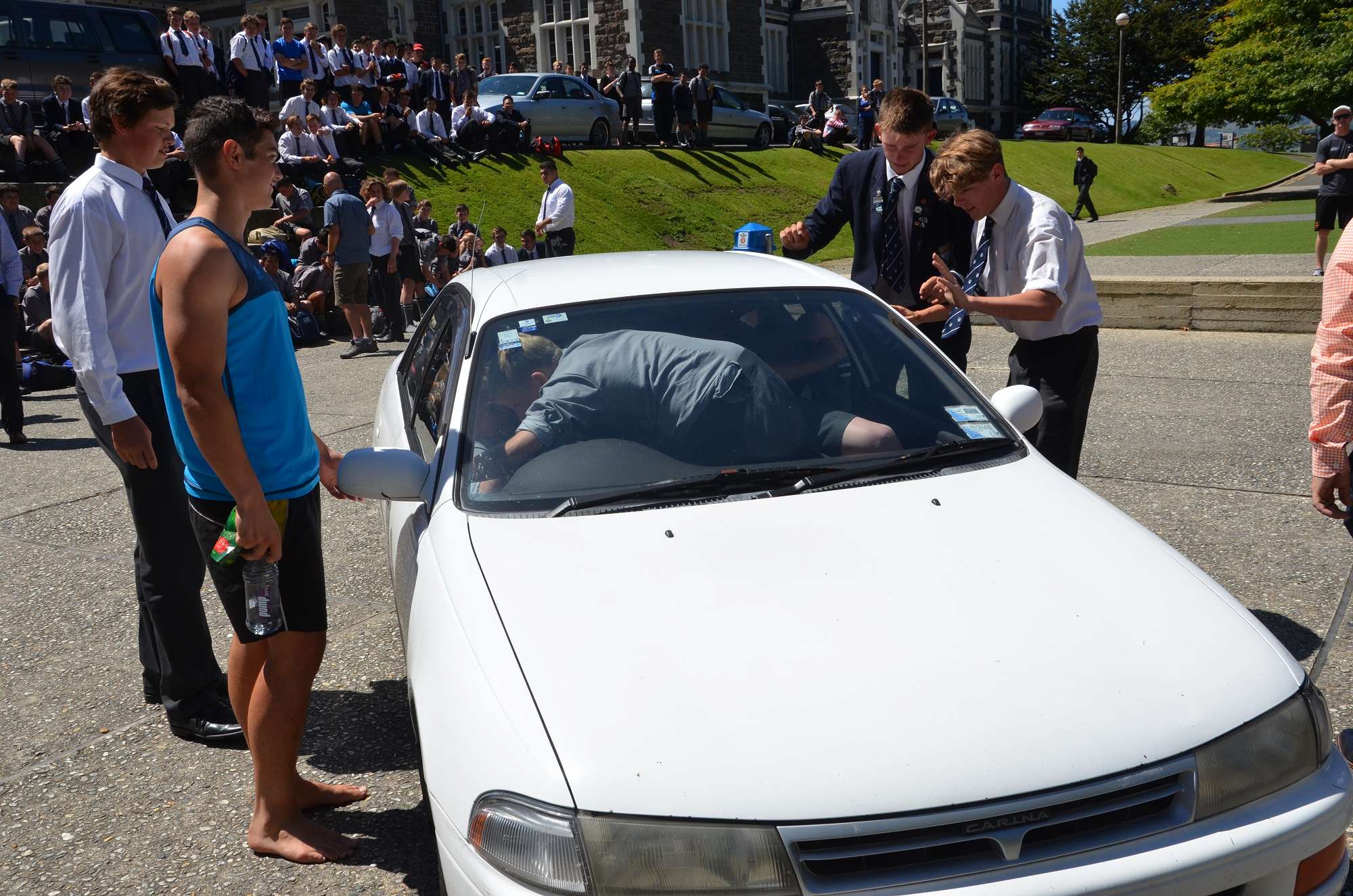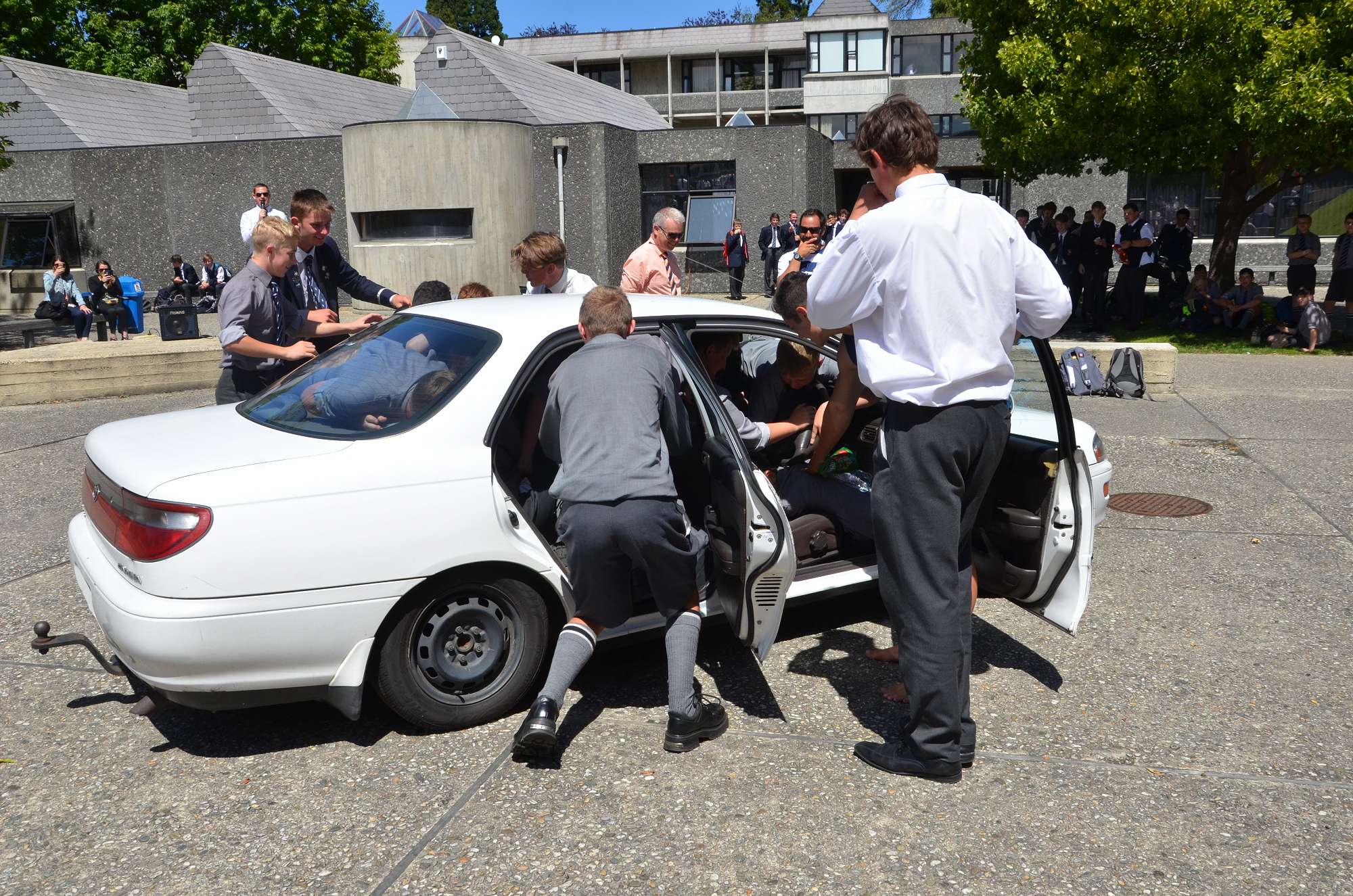 As part of our house competition house leaders tried to fit as many Year 9 boys as possibe into a staff member's car in 30 seconds. Park and McIndoe house teams both managed to squeeze 21 boys into the car. This made them 1st = in the house competition, ahead of both Saxton and Aspinall. All participants enjoyed themselves, showing huge smiles as they exited the vehcile at the end of each jam. The competition is sure to heat up in next Wednesday's House Sports Competition at the Caledonian Grounds.