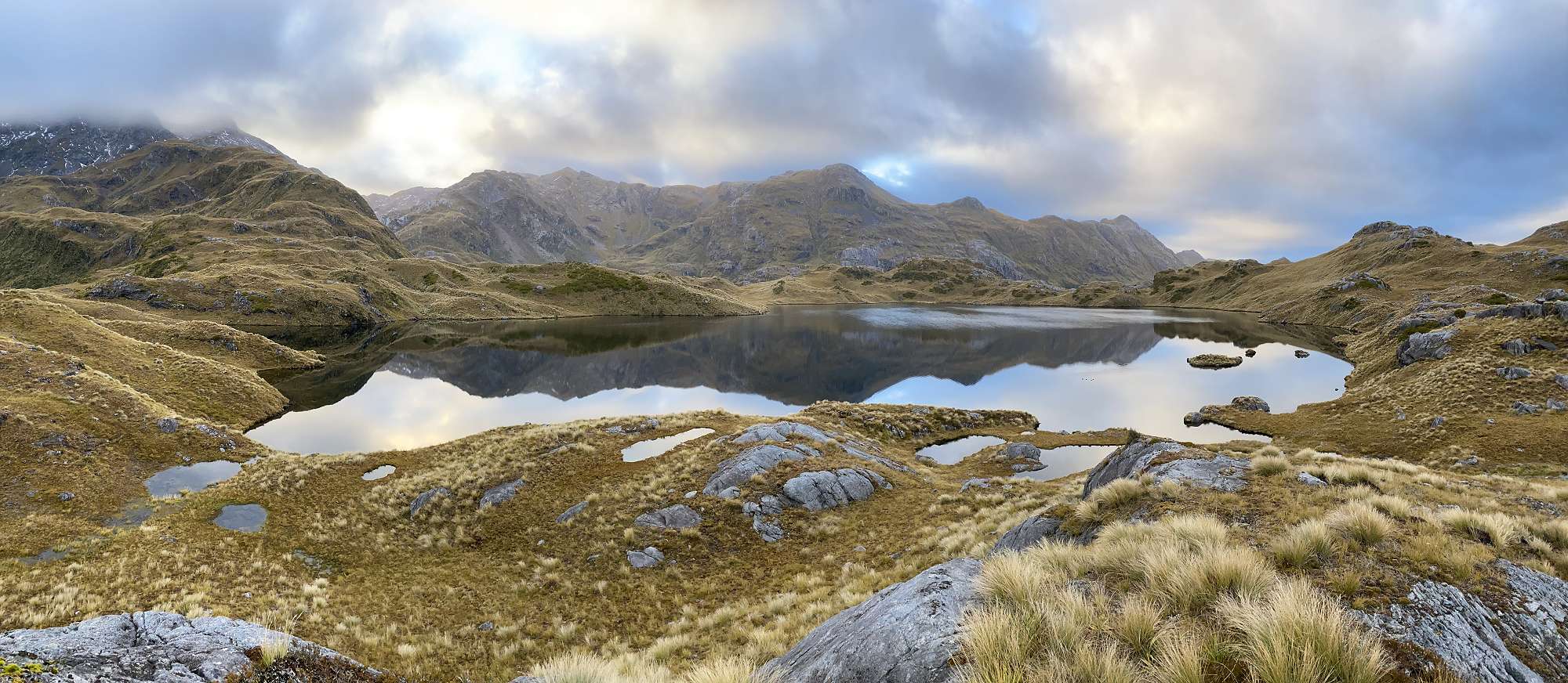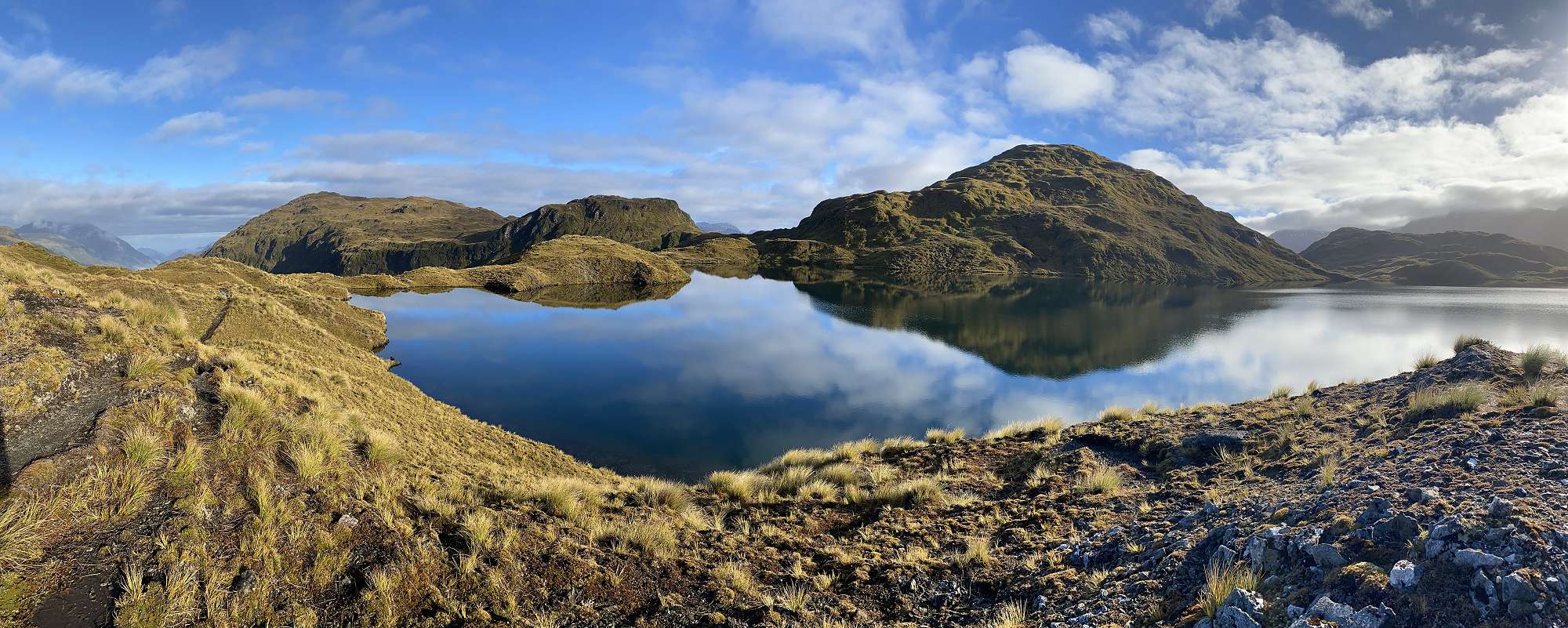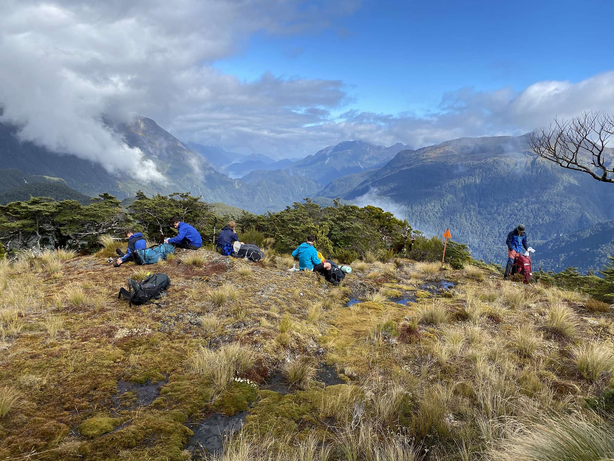 On Day 3 the rain and mist cleared away just in time for stunning views as we climbed to 1100m and traversed the tops of the Pleasant Range. Lake Horizon and several tarns made for some great photo stops, before we were able to get views to the West straight out to the sea at Dusky Sound. We enjoyed lunch with the views on the tops, before plunging 800m down over a distance of just 2km to Loch Maree Hut. We were treated to up-close sightings of kaka and kea as we descended through the forest. That night we came across the only other humans we would see for 6 full days – a pair of hunters who had been helicoptered in with their supplies.