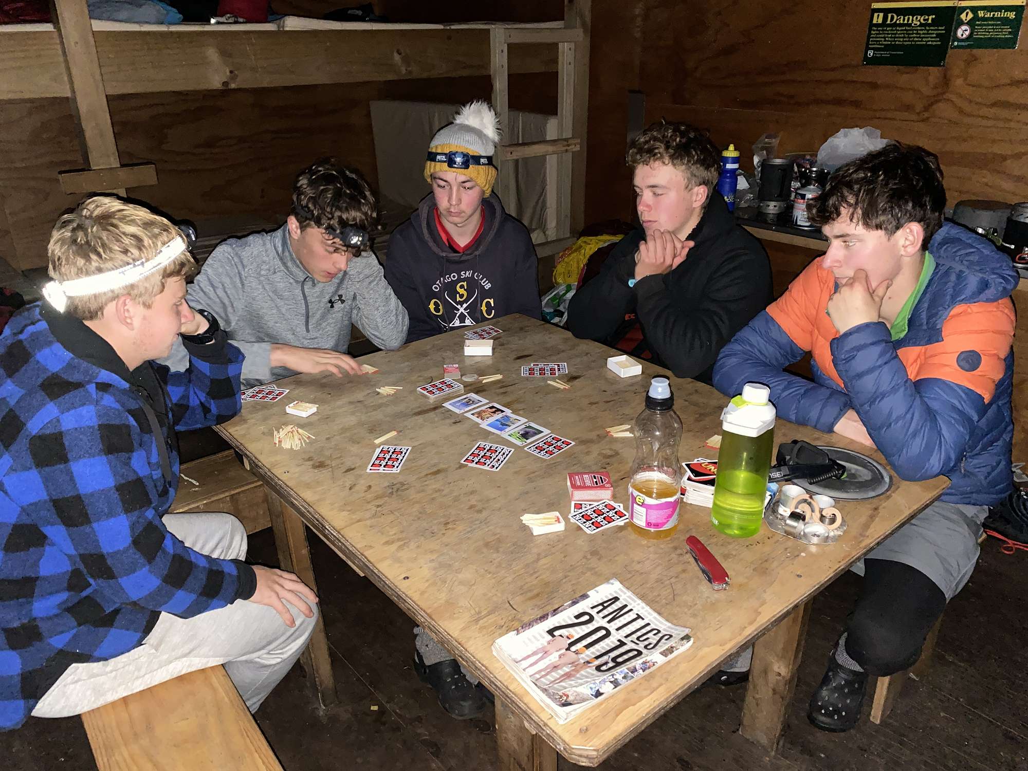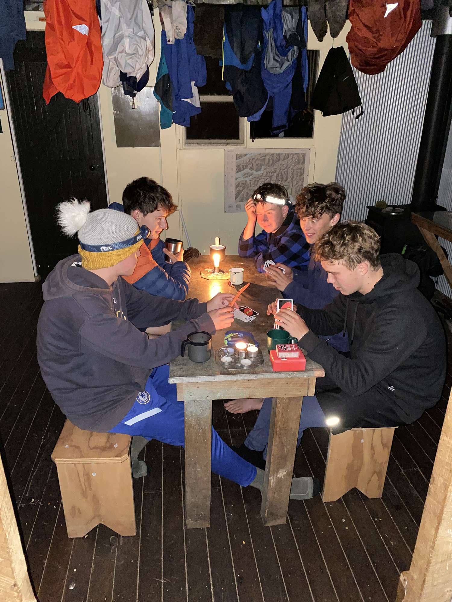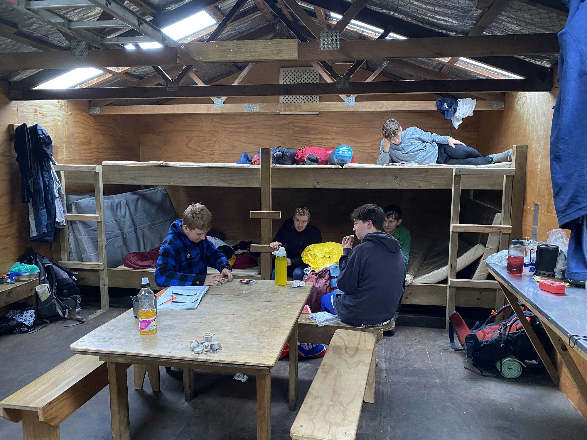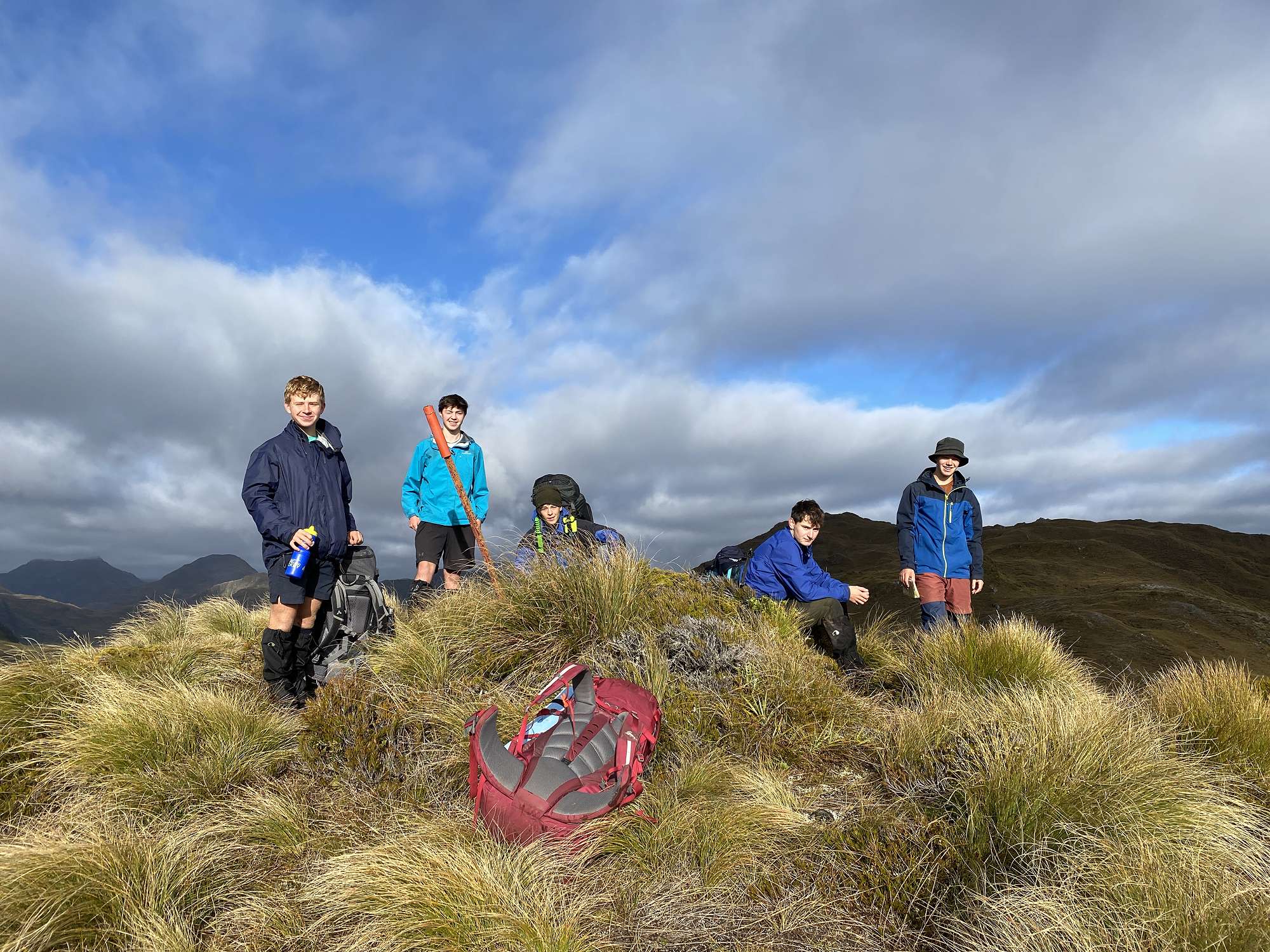 Day 5 was our shortest day by distance but arguably the toughest. It started with an 800m vertical climb to reach Centre Pass, and for much of it the use of 4LD (4 limb drive) wasn’t just an option but a necessity to clamber up very steep faces. We had a leisurely lunch on the top, as low cloud cleared to great views back down the Seaforth Valley, and ahead into the Spey Valley. The drop of 600m down to Upper Spey Hut wasn’t quite as demanding as the climb, but still requiring of 4LD at times as well. The sandflies must have sensed this was our last night on the track and attacked with an intensity not previously seen. Fortunately, none of the smaller lads were carried off by them, and once it had gotten dark we were able to enjoy being outside again with an inquisitive weka and fantastic evening sky providing the entertainment.
