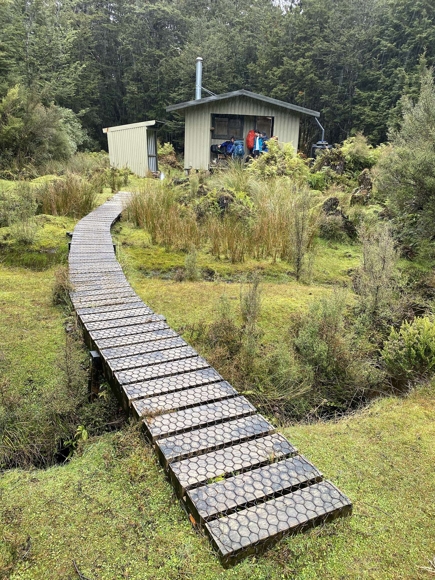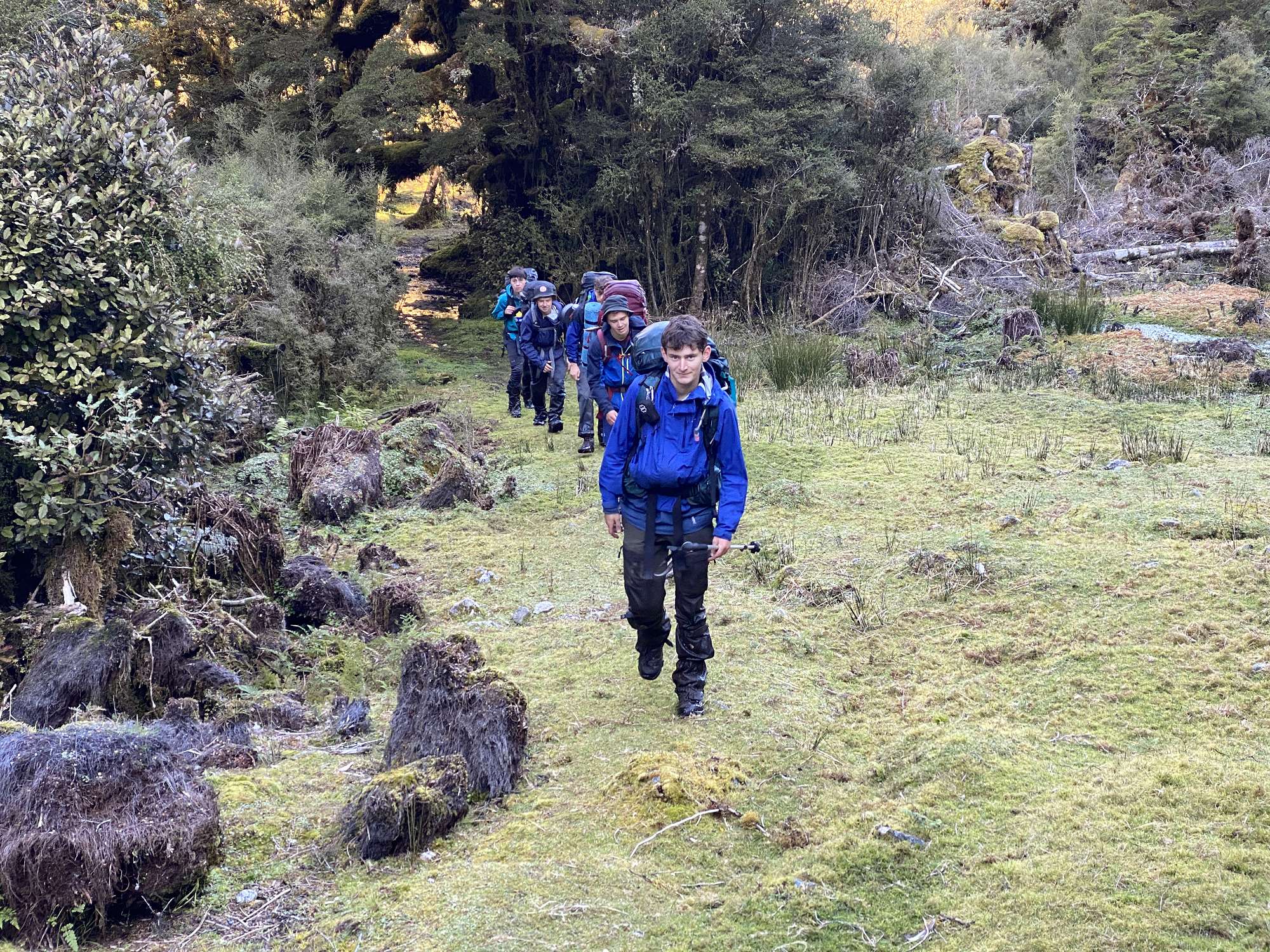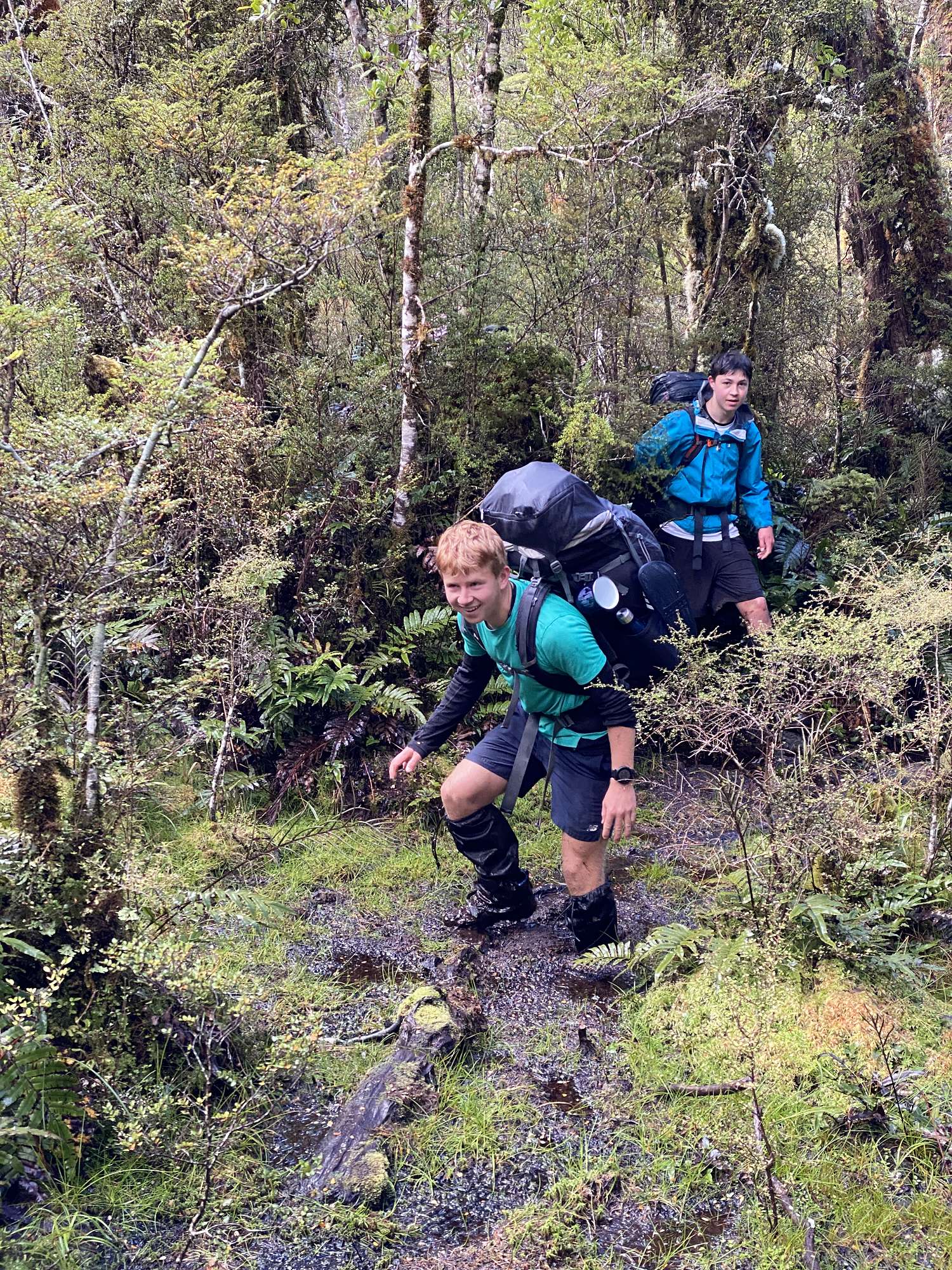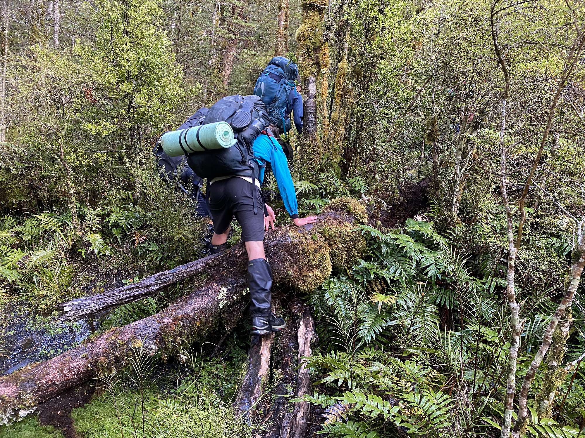 Our first night was spent in the bustling metropolis of Tuatapere, ready for our boat transfer across Lake Hauroko at first light next morning. After a calm crossing, the realisation set in that we were now on our own for up to 8 days with just what we were carrying on our backs. The track started off gently enough, but it wasn’t long before the reason behind the formidable track times became clear - vertical ladders of knotted tree roots, knee deep bogs and track conditions favourably described as “rough”. After 6 hours we reached Halfway Hut which was a very welcome sight through the light rain.