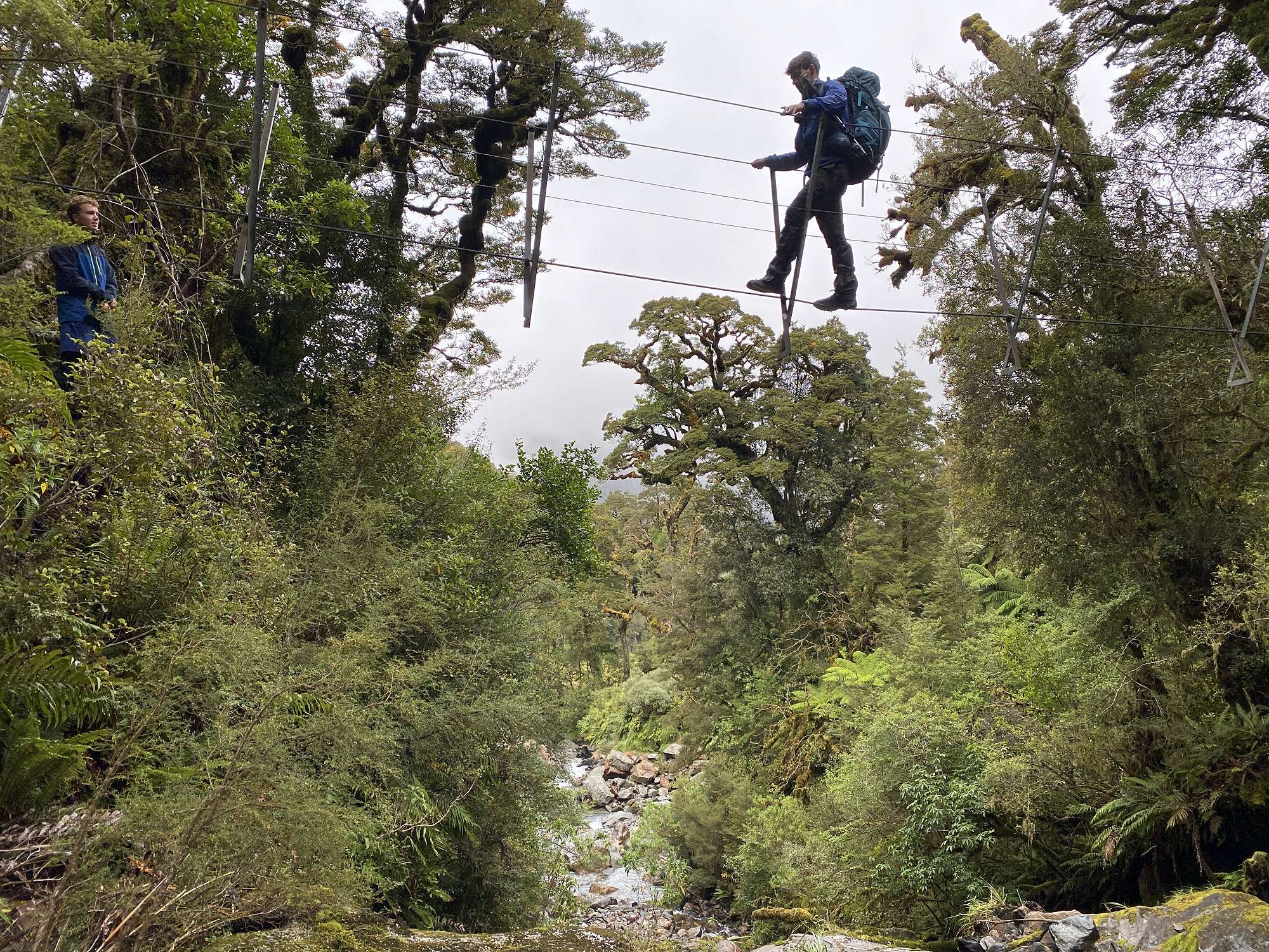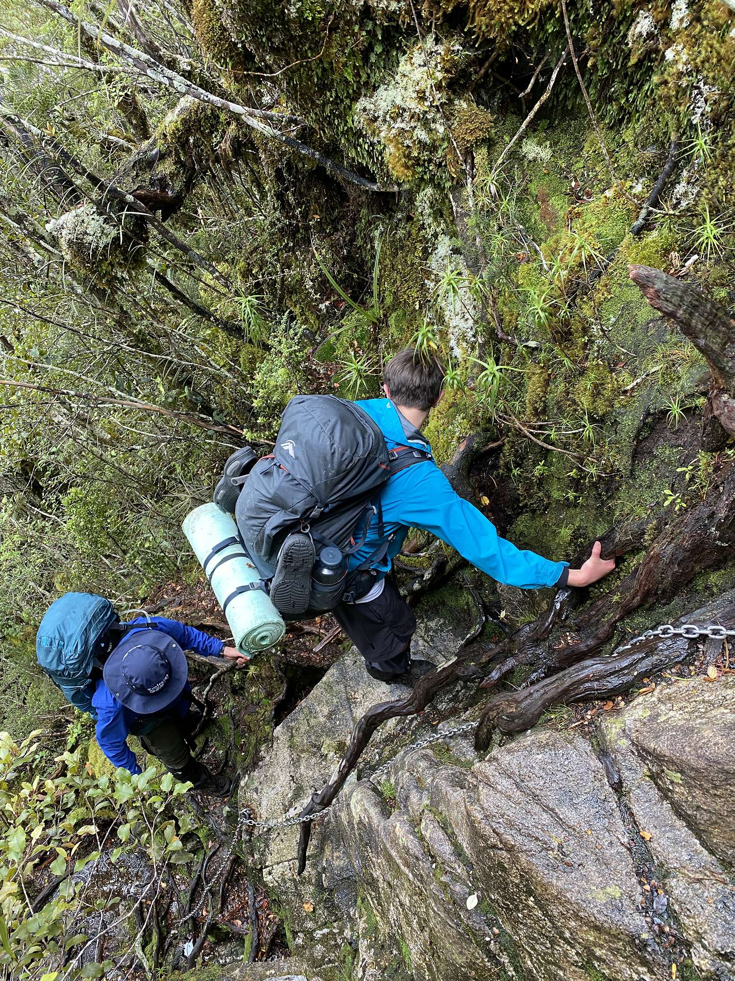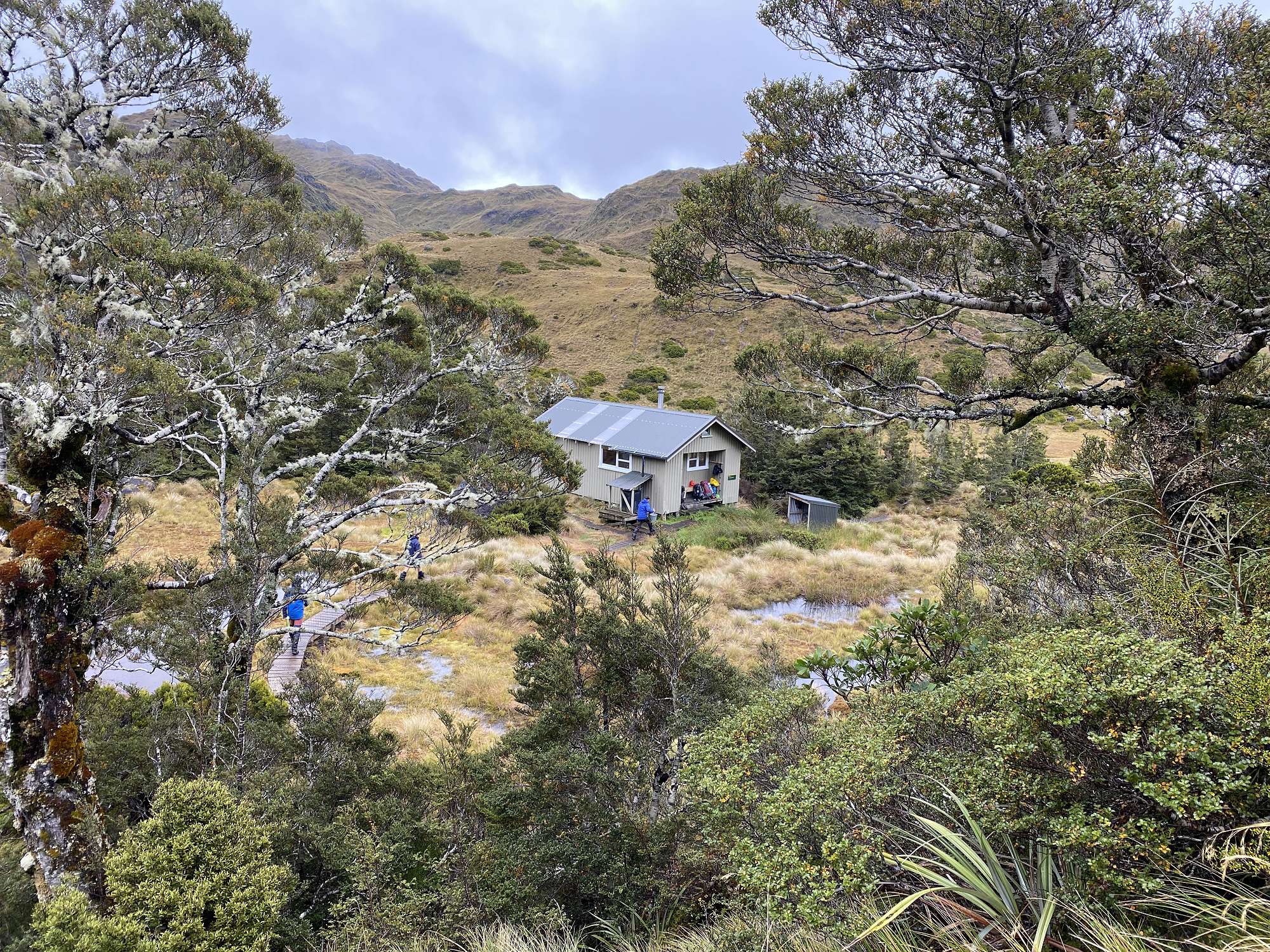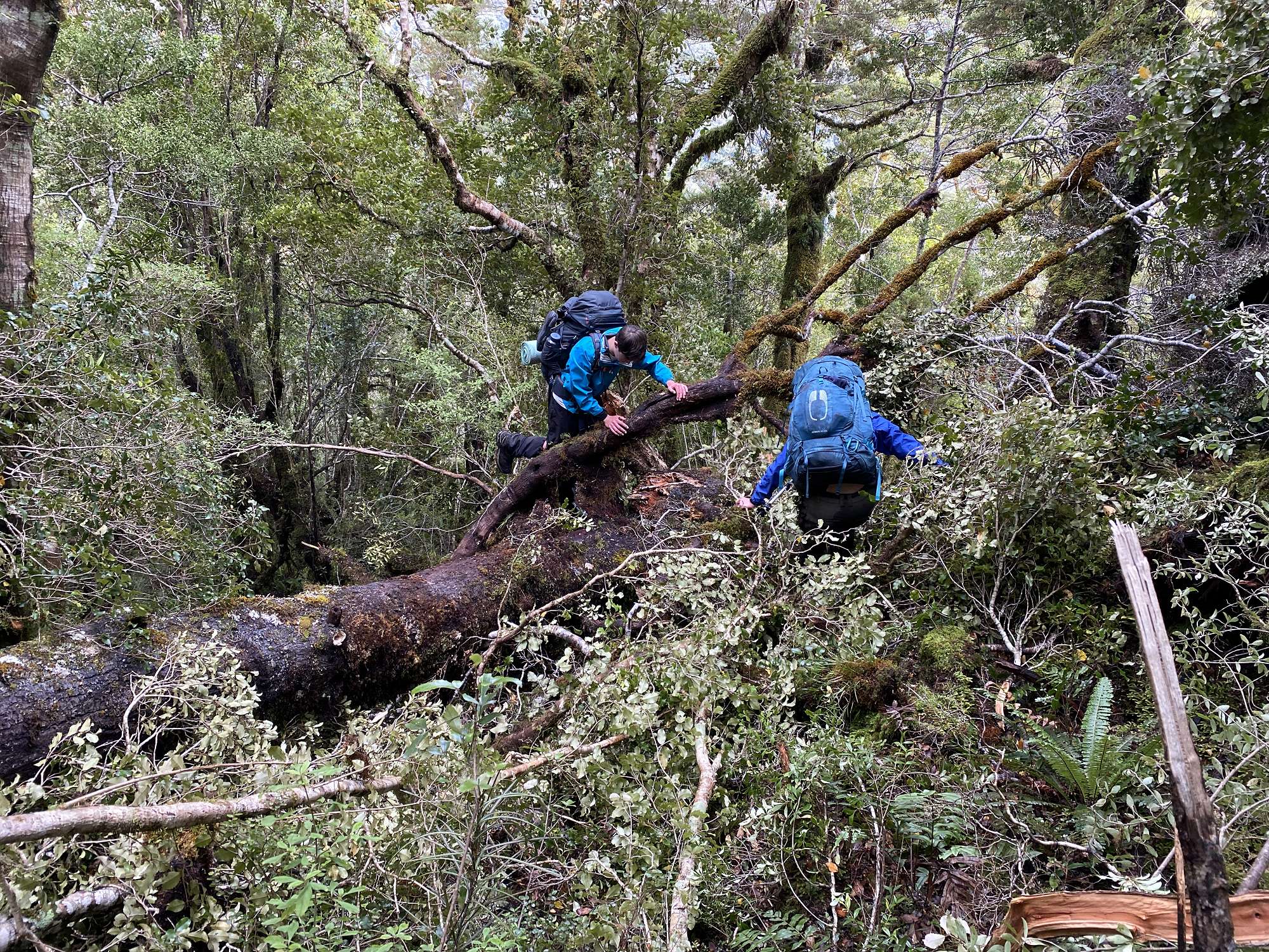 Our first night was spent in the bustling metropolis of Tuatapere, ready for our boat transfer across Lake Hauroko at first light next morning. After a calm crossing, the realisation set in that we were now on our own for up to 8 days with just what we were carrying on our backs. The track started off gently enough, but it wasn’t long before the reason behind the formidable track times became clear - vertical ladders of knotted tree roots, knee deep bogs and track conditions favourably described as “rough”. After 6 hours we reached Halfway Hut which was a very welcome sight through the light rain.
