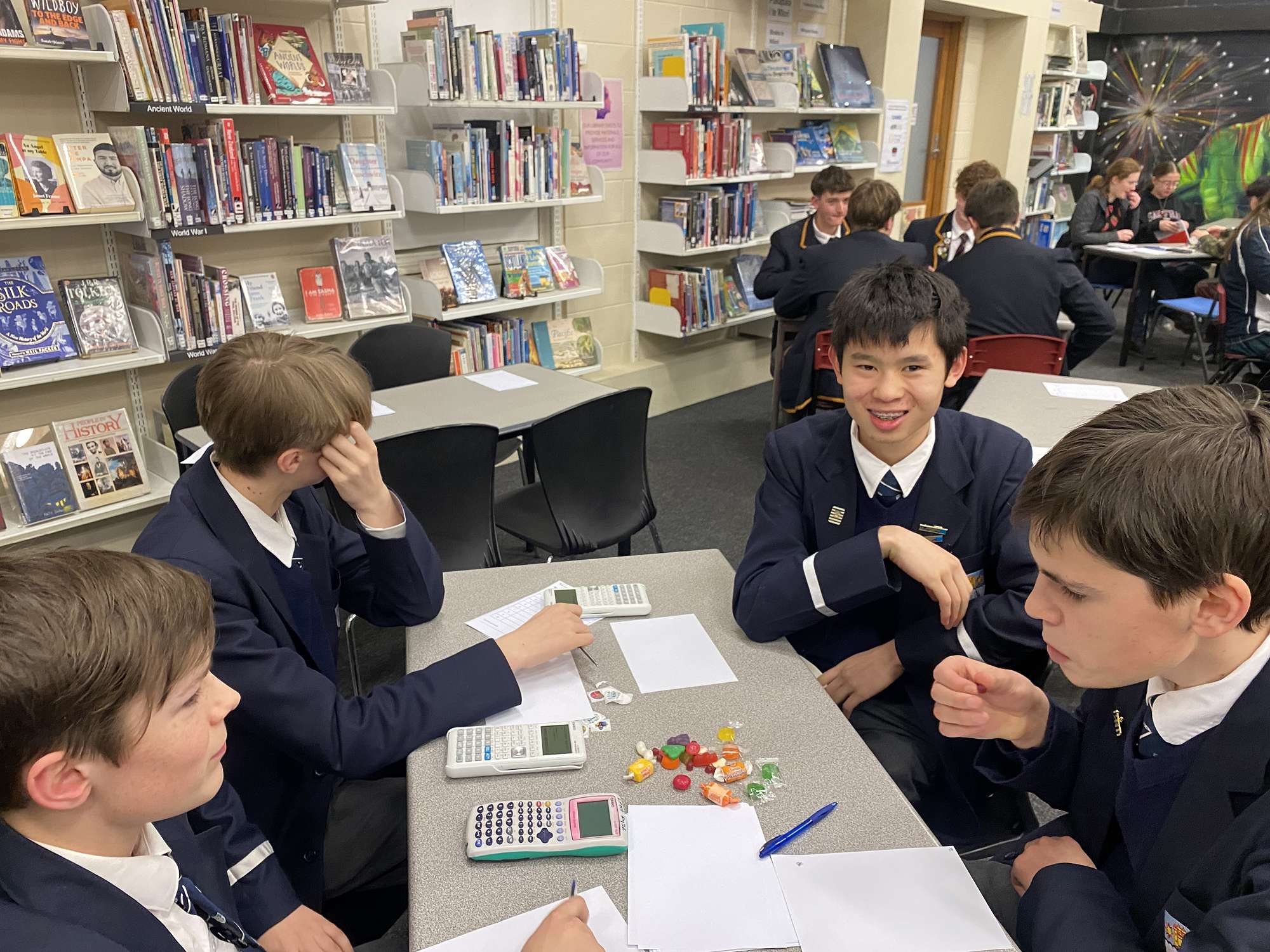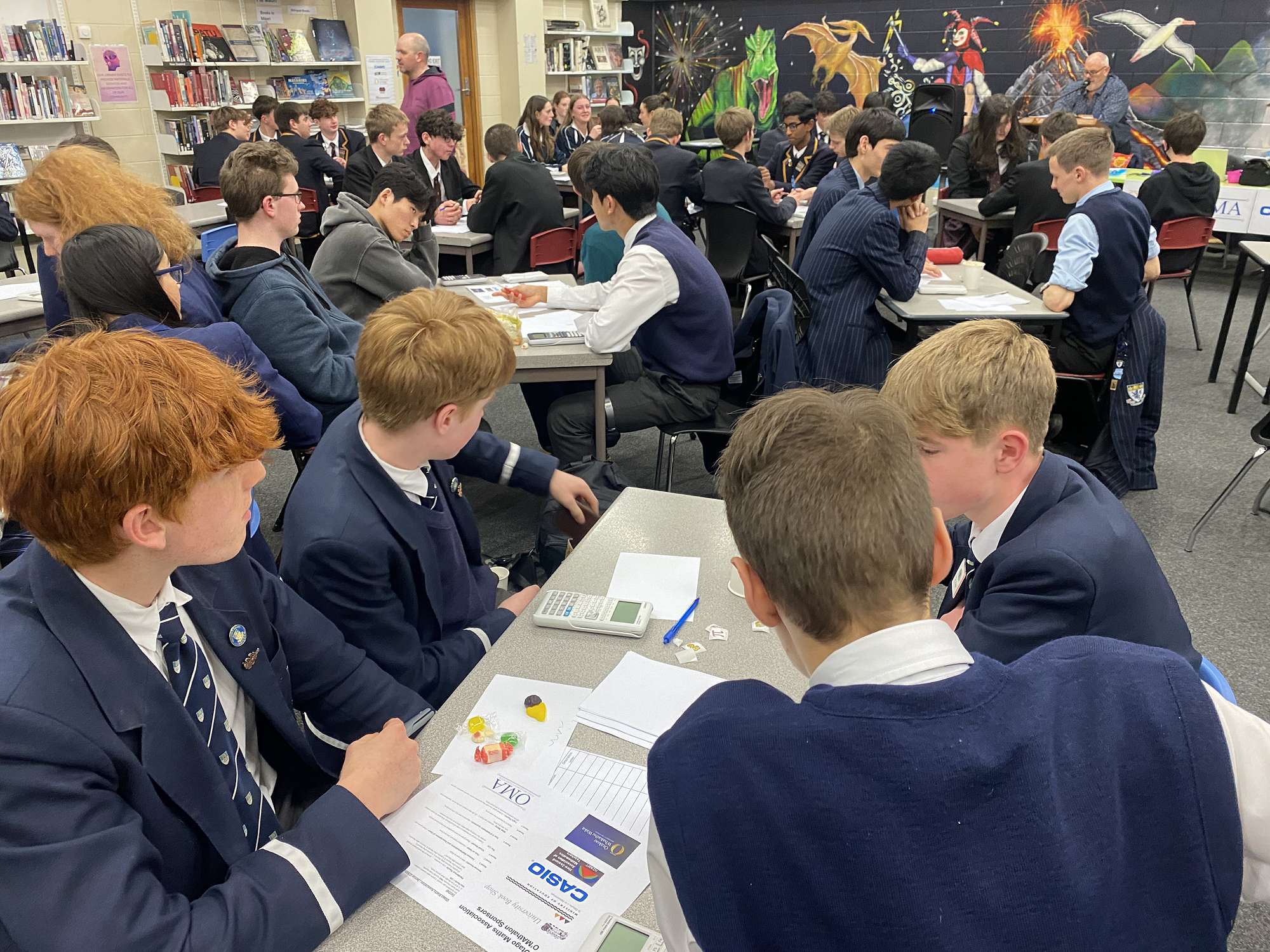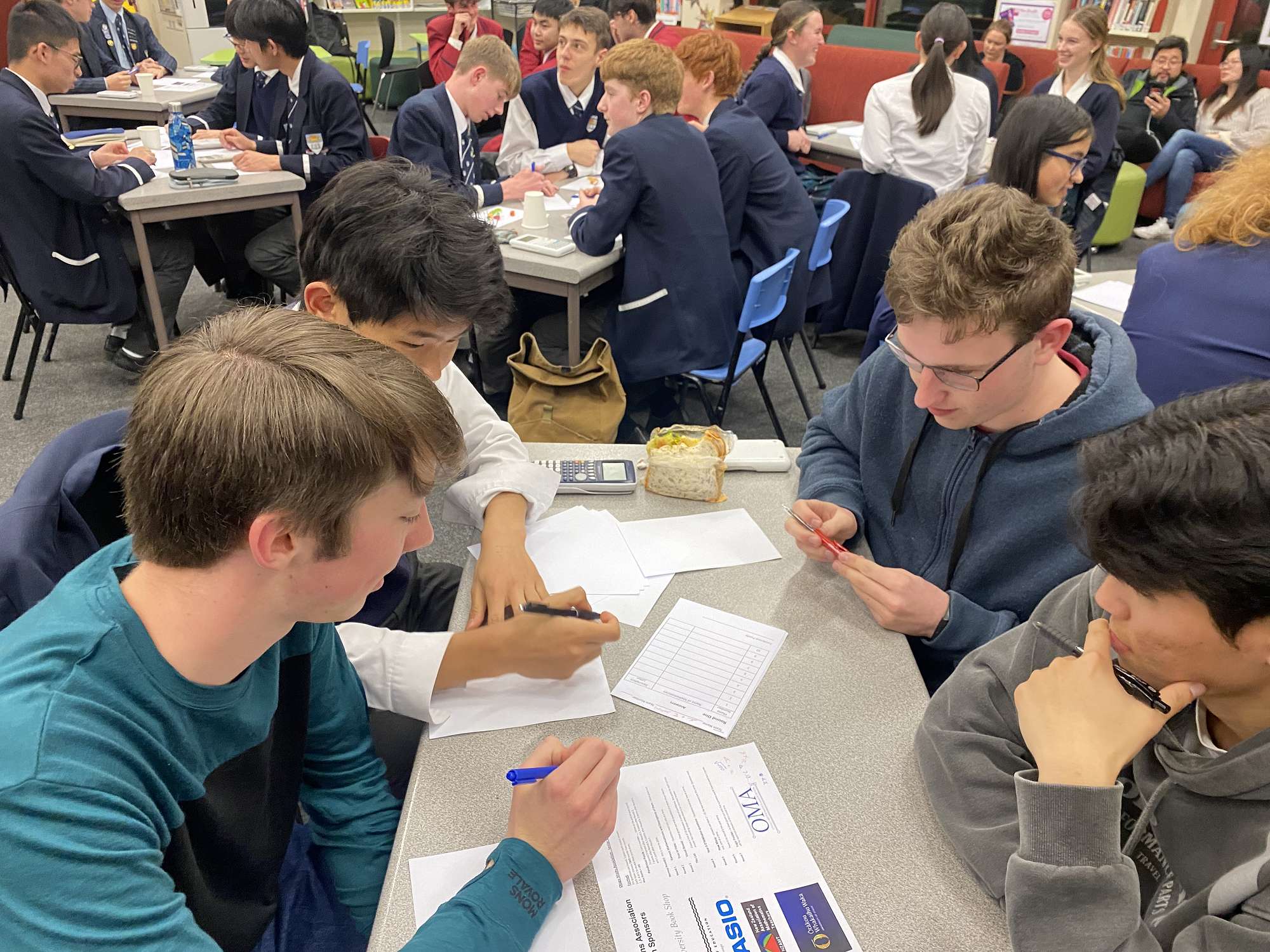 This year we had 4 senior teams participate in the senior OMAthalon on Thursday 15th, the most we have had for some time. Our top finishing team was our Year 13 team of Thomas Hayman, Chunwoo Munn, Luke Woo and Ethan Maw with what I thought was a great name (Acute-e-PI). The Year 11 and 12 teams also sought bragging rights with the Year 11 teams narrowly missing out to the top finishing Year 12 team.