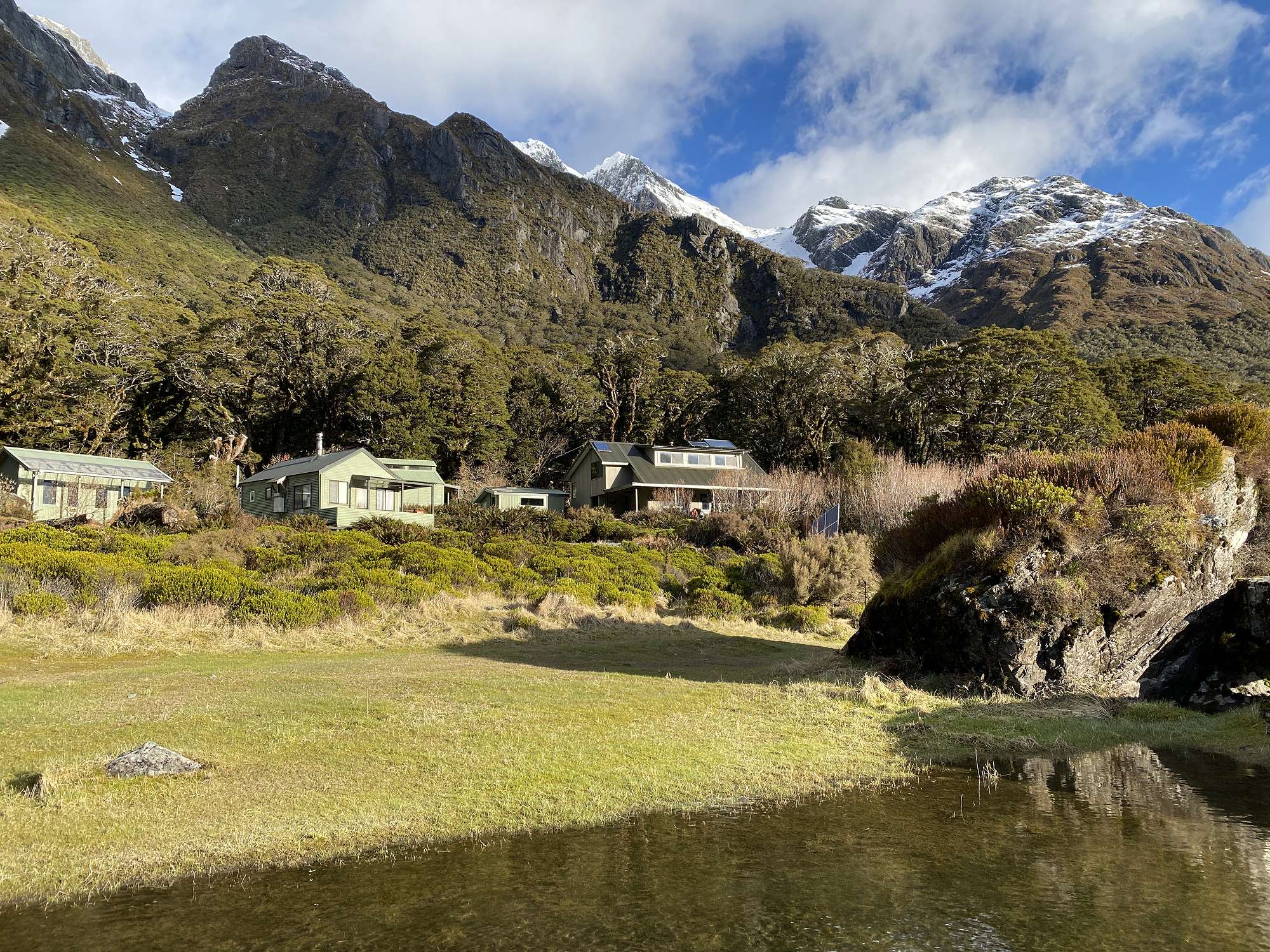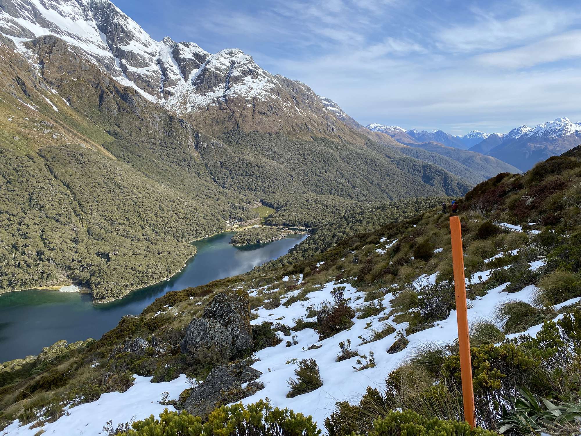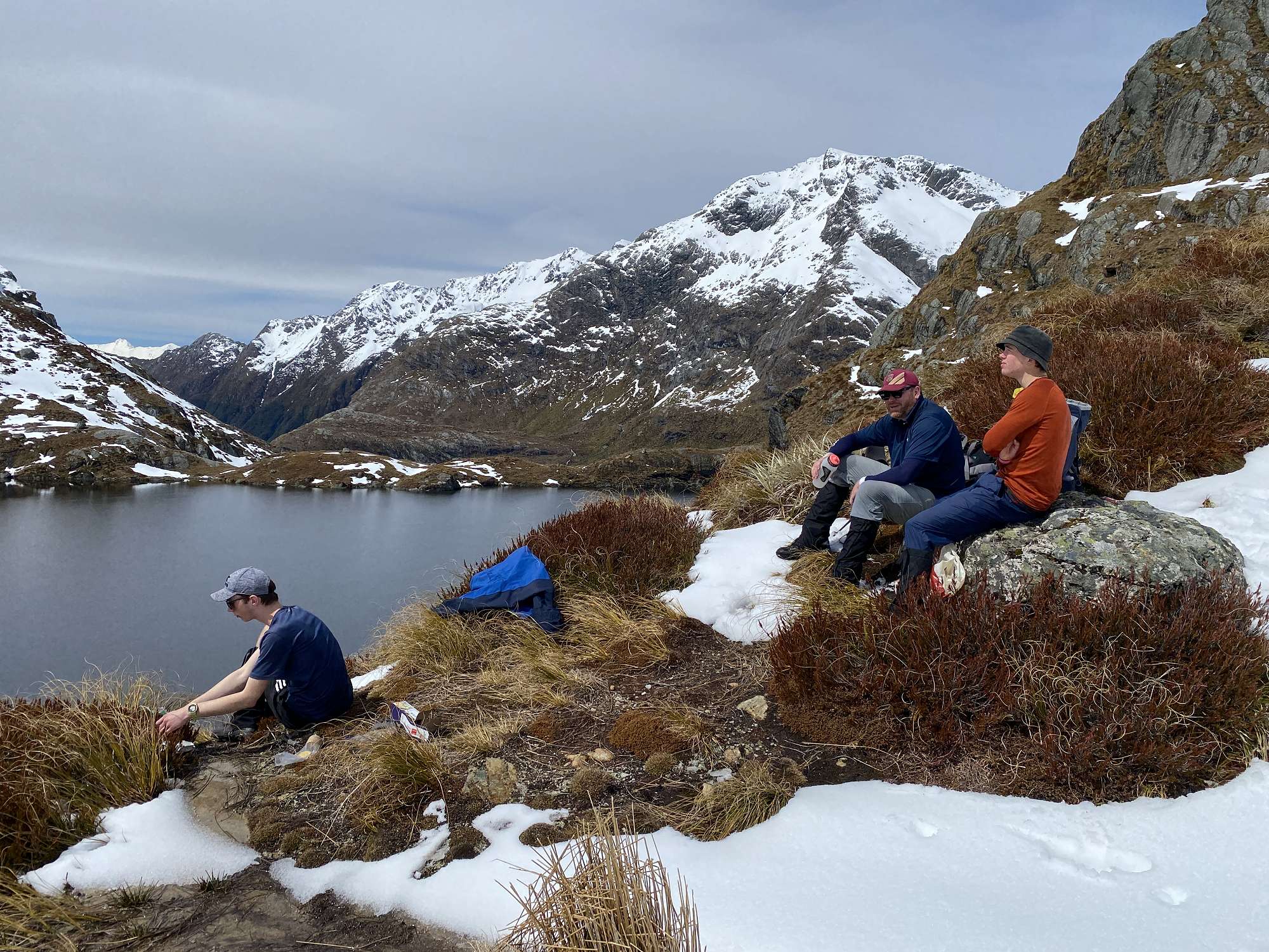 On Day 2 we had a relaxed start, giving the ice a chance to soften before we attempted a visit to the 1255m Harris Saddle. Several patches of snow had to be crossed where it lay in the shadows, and by the time we reached the Saddle itself our whole world was white. The final stretch to our lunch spot at Lake Harris was tough going in the snow, but definitely worth it for the spectacular views. We returned to Lake Mackenzie by the same route where several lads braved the icy waters for a refreshing dip.
