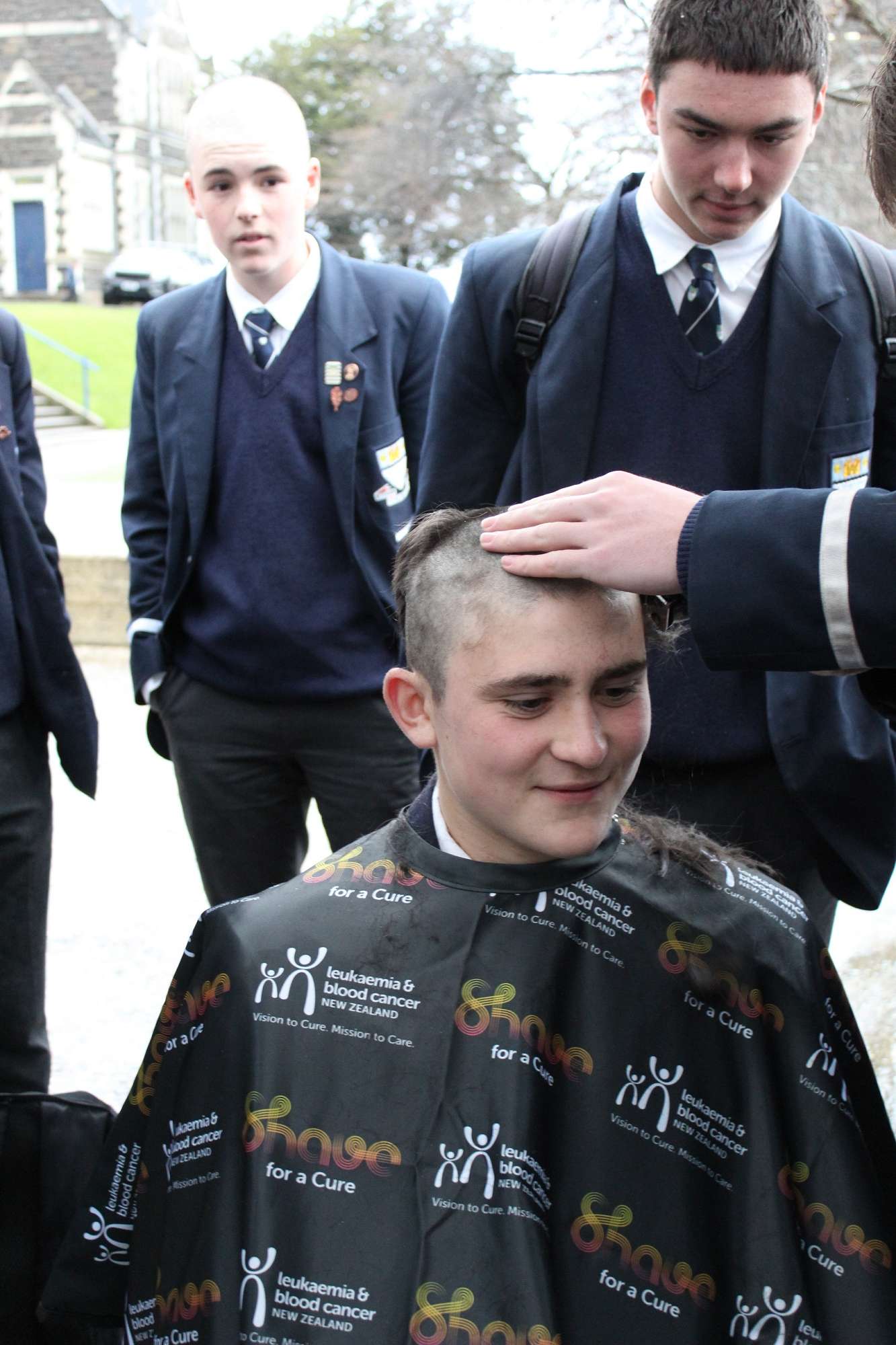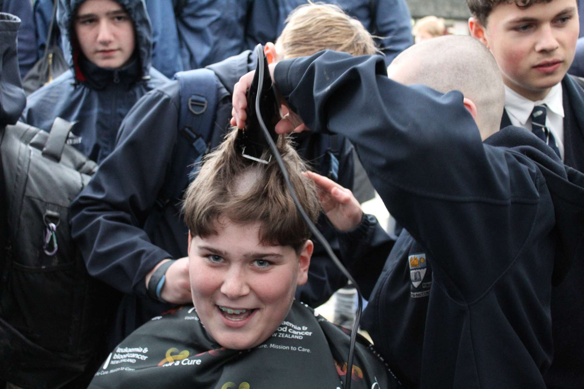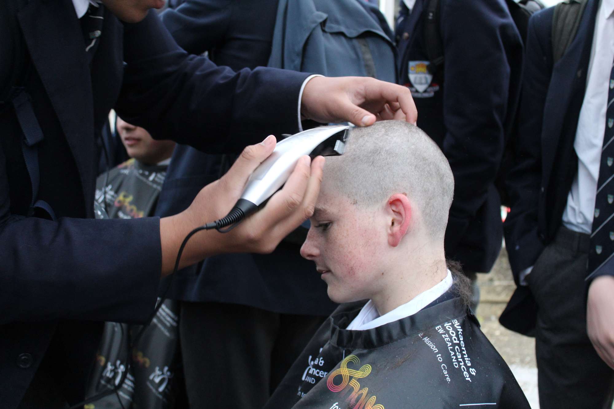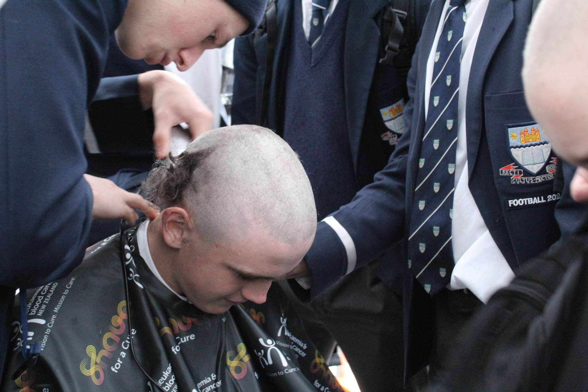 Last Friday, June 6th, over 45 Otago Boys’ High School students braved the cold and rain in the school’s open-air theatre—and shaved their heads in solidarity with those facing these illnesses.