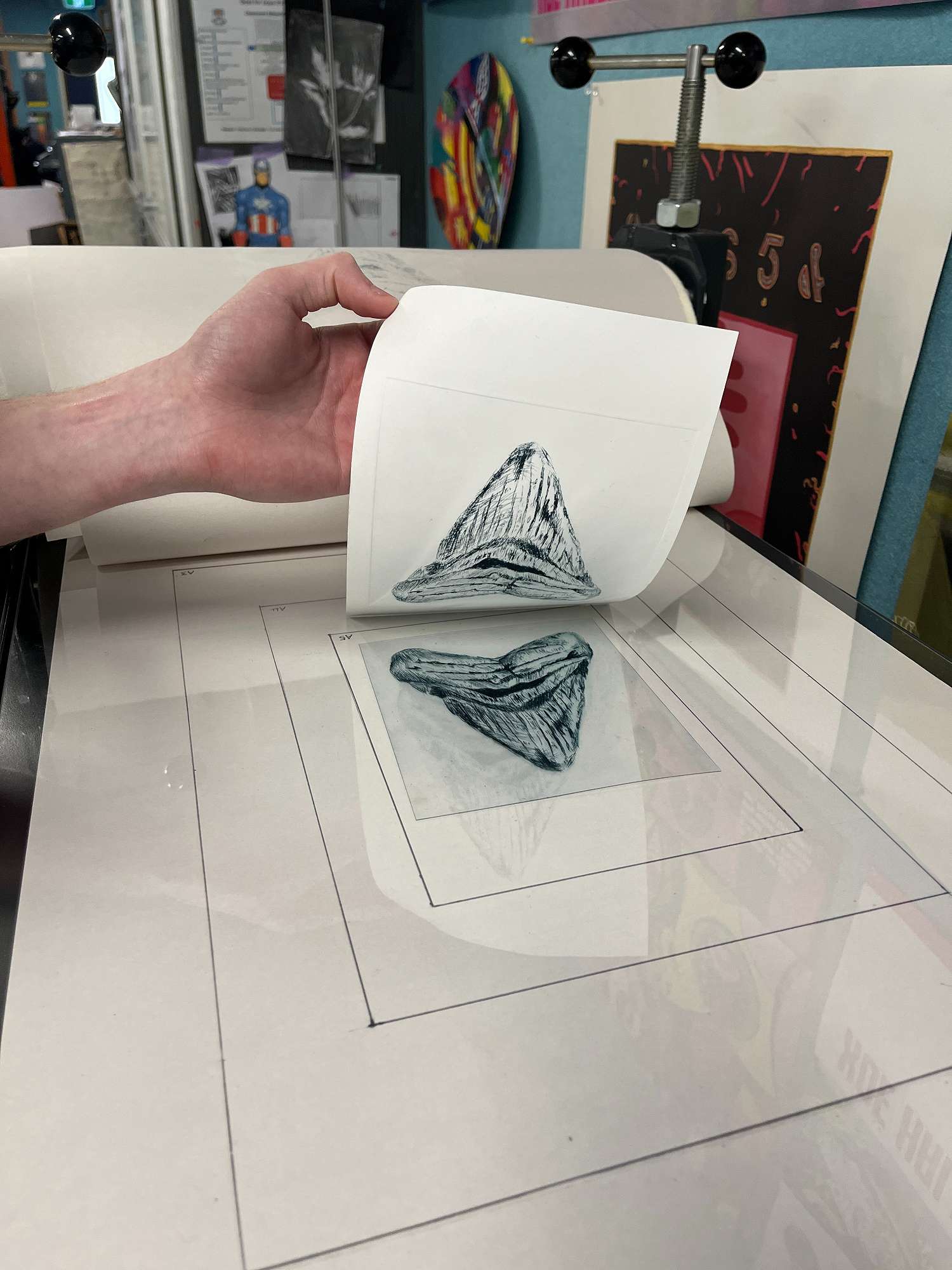 Tyler Smith was the first student to use the press and has produced a fine print of a fossilised shark tooth. Other high-quality examples are coming hot off the press and are revealed as we lift the layers of blankets after they have passed through.