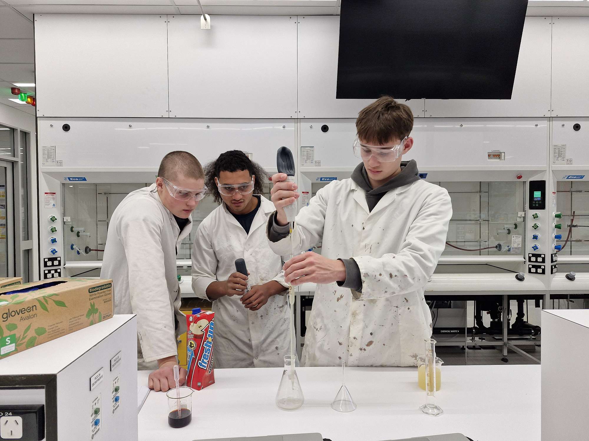 Student investigations included quantifying the amount of chloride ions in seawater from different locations around Dunedin, measuring the vitamin C concentration in various fruit juices, and determining the percentage of manganese in different metal alloys.