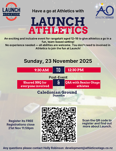 Join us for a high-energy, fun-filled morning of athletics designed just for rangatahi aged 12–18!