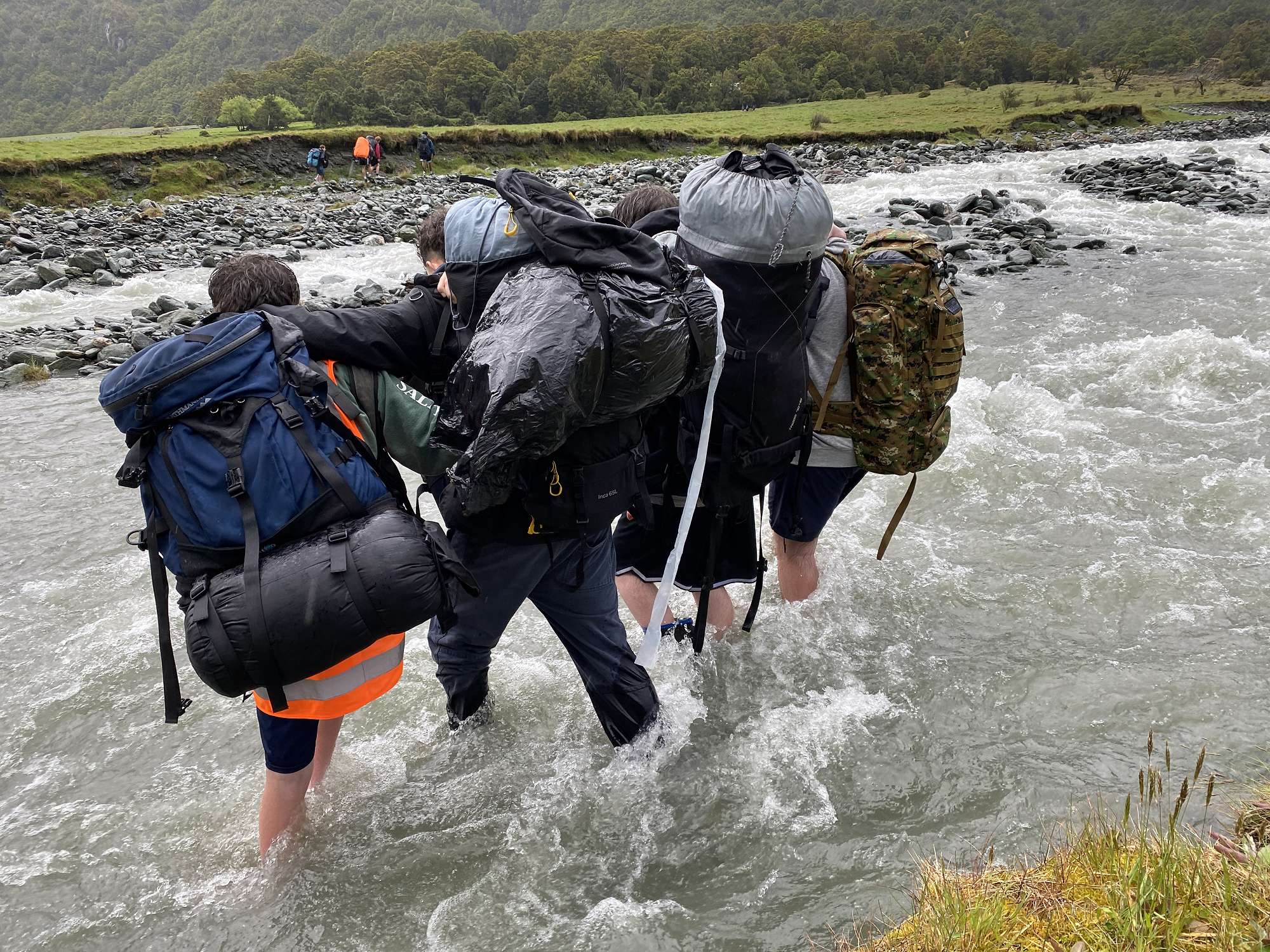 The Mt Aspiring road was in good shape despite having been closed due to storm damage just a couple of weeks previously. We arrived to find the Matukituki River running high and discoloured, and the little stream beside the Lodge (MacPherson Creek) in a similar state. This necessitated our first outdoor education lesson so we could cross the creek safely in groups using a mutual support method. As the rain continued that afternoon we made the decision to leave all our extra gear and food supplies in the van overnight, just bringing up what we needed for the first night’s meal and breakfast.