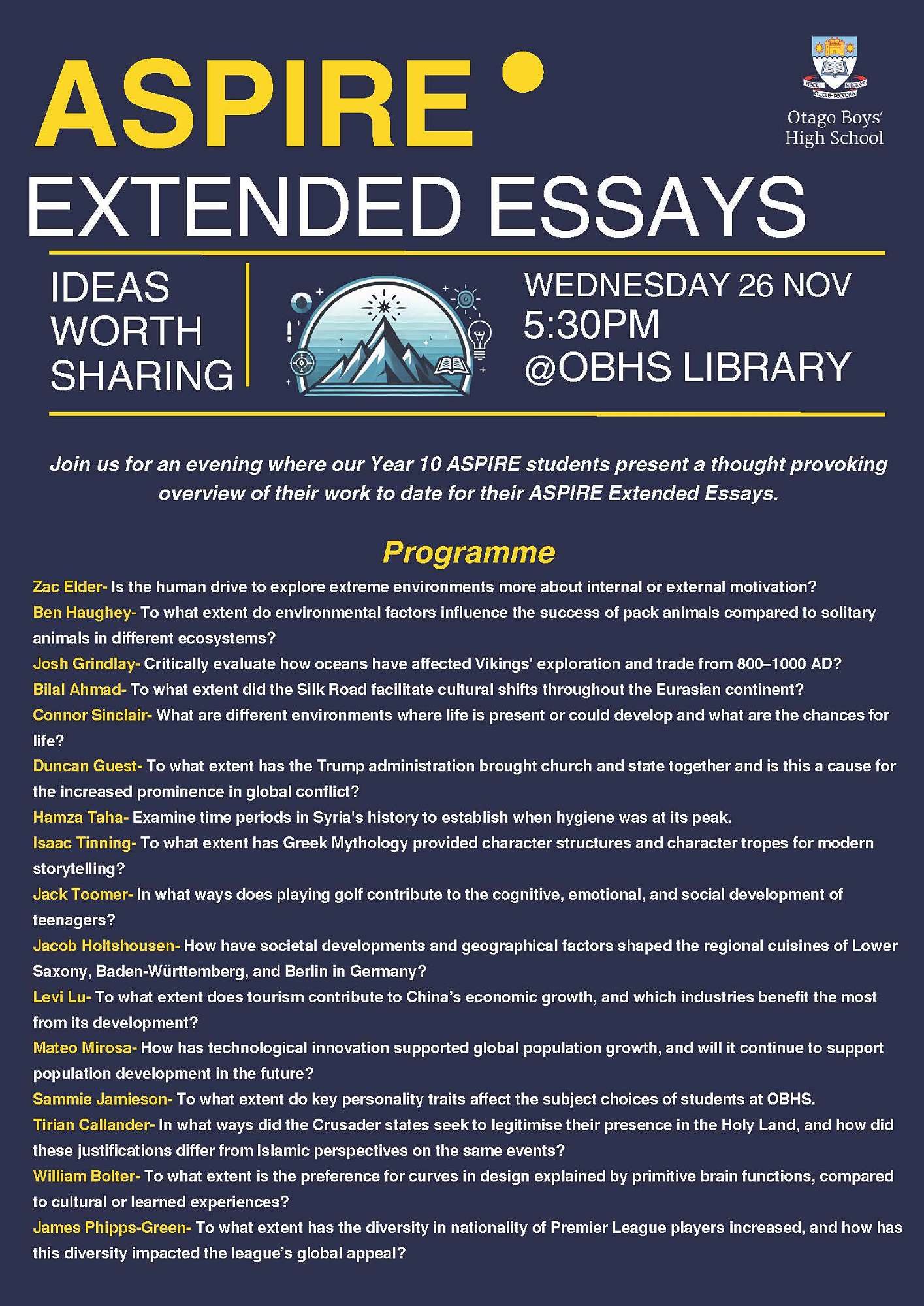 For a sense of the complexity of the topics covered in both the Year 10 essays and the Year 9 talks, please see the attachments provided with this newsletter.